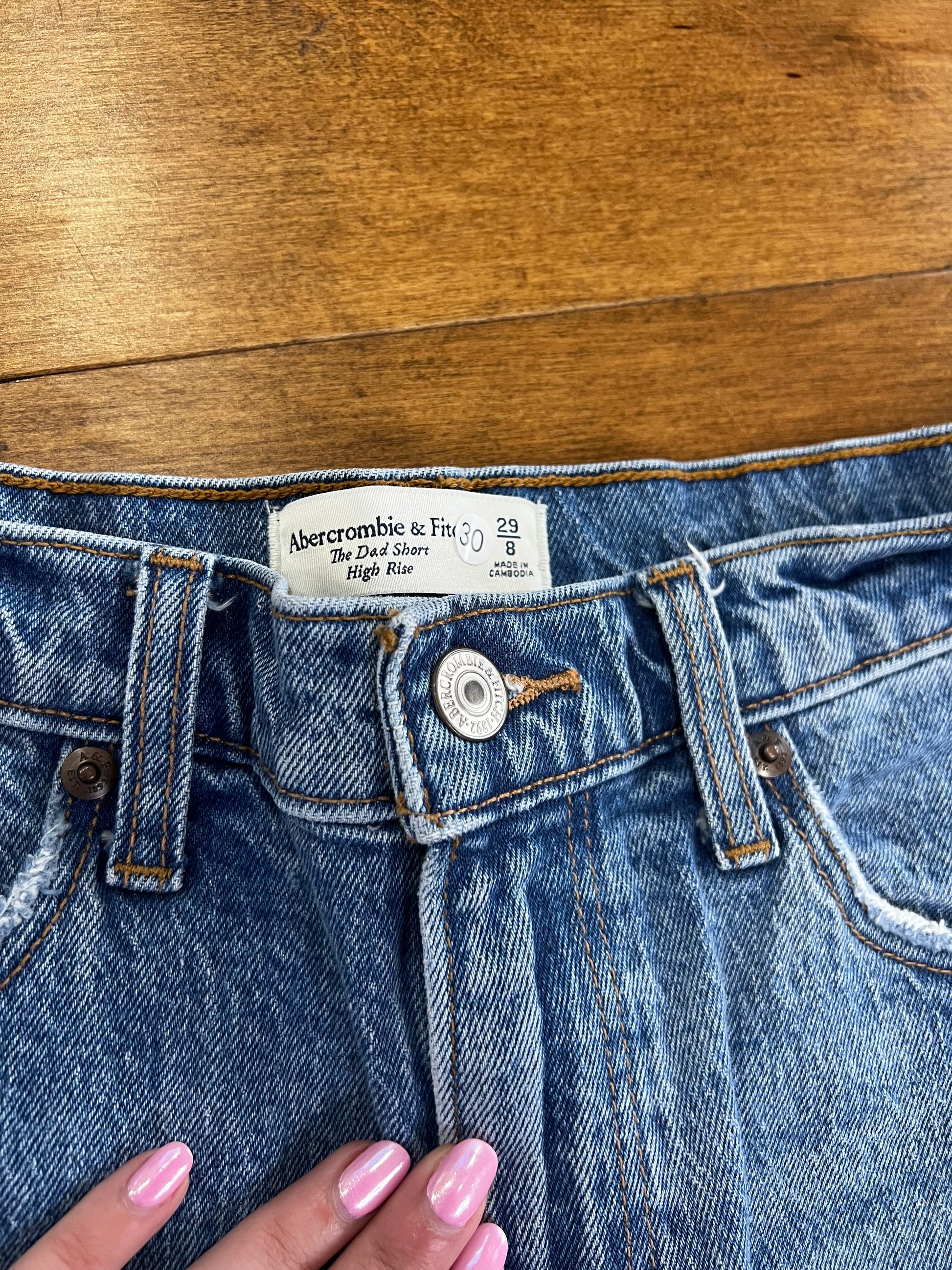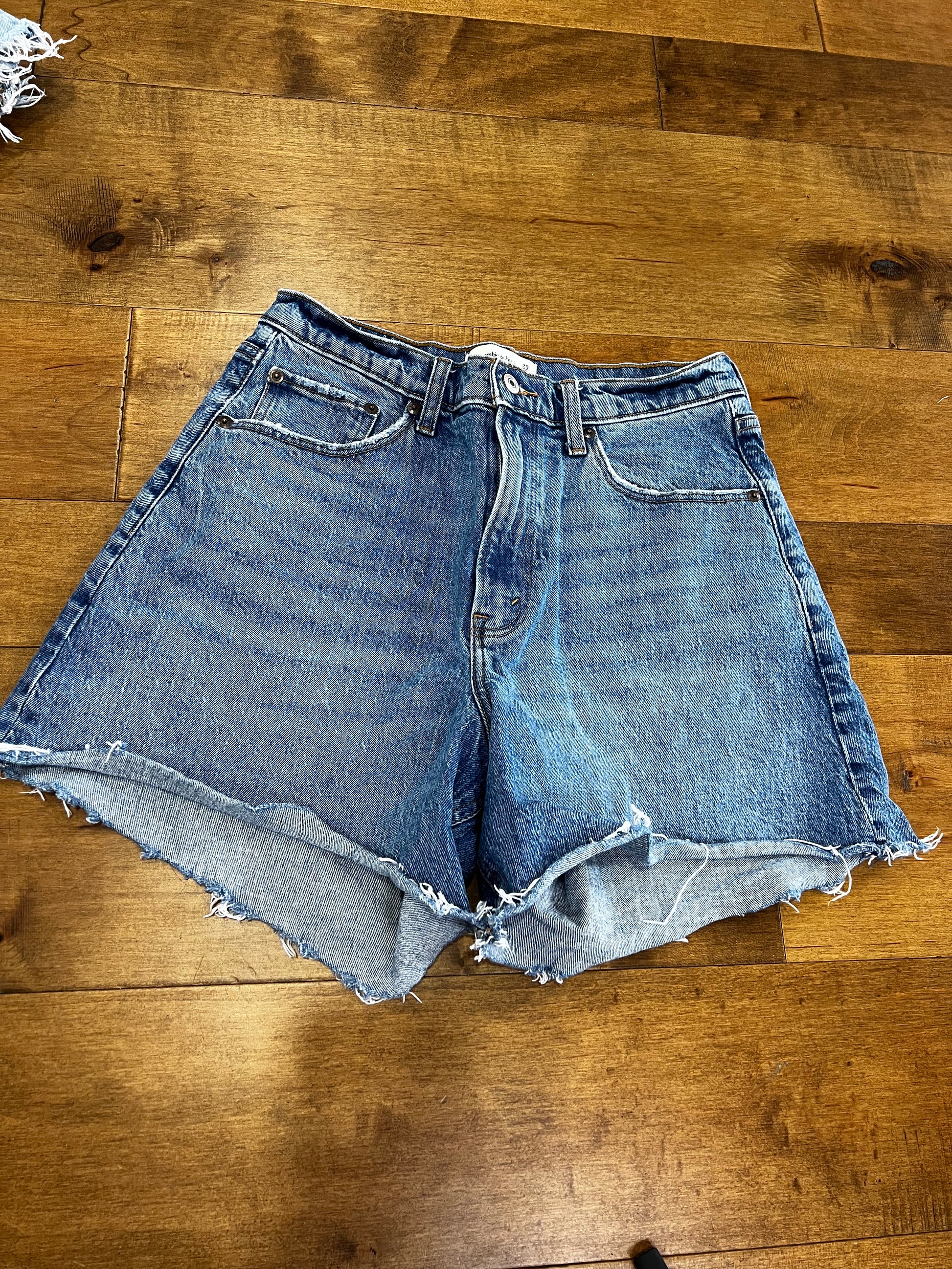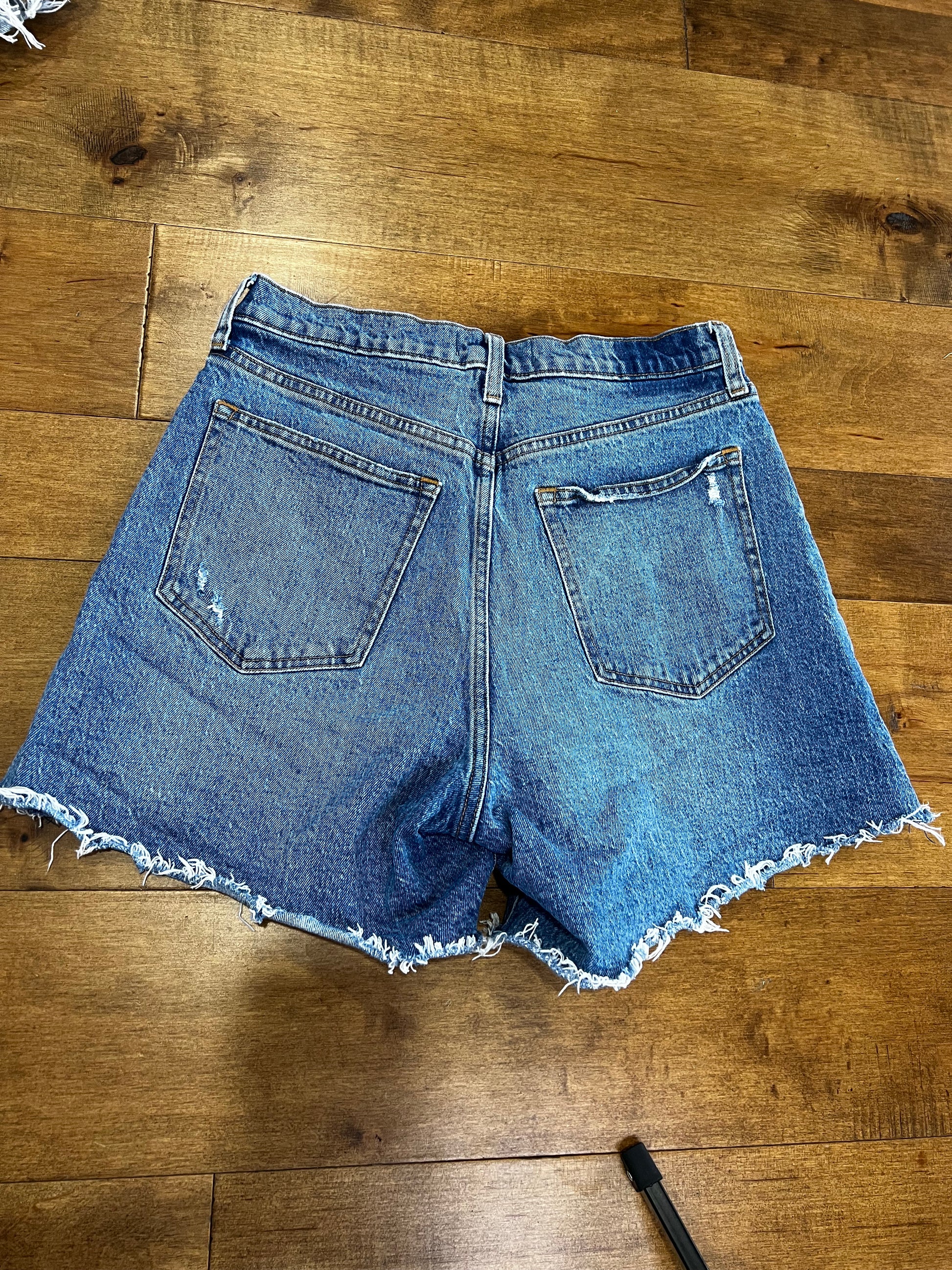 High Rise, Medium/Dark wash with on distressing. Raw hem on bottom. No flaws!