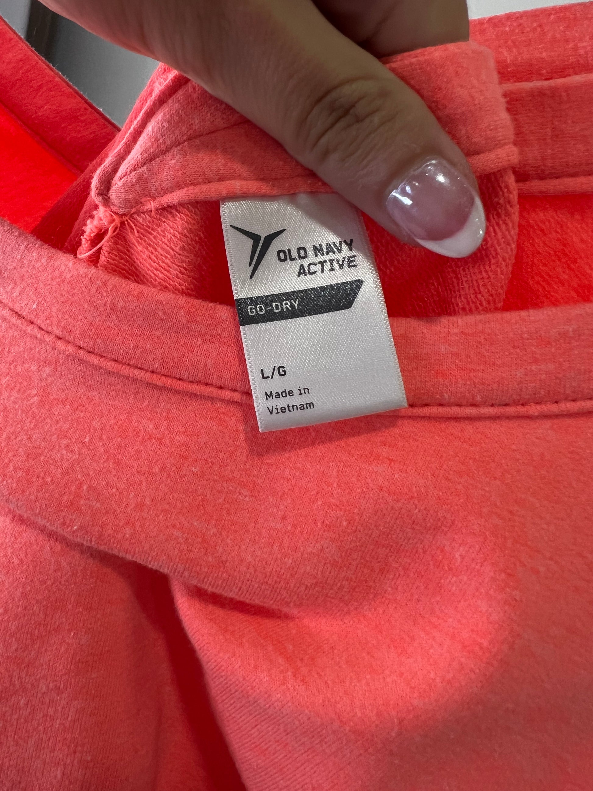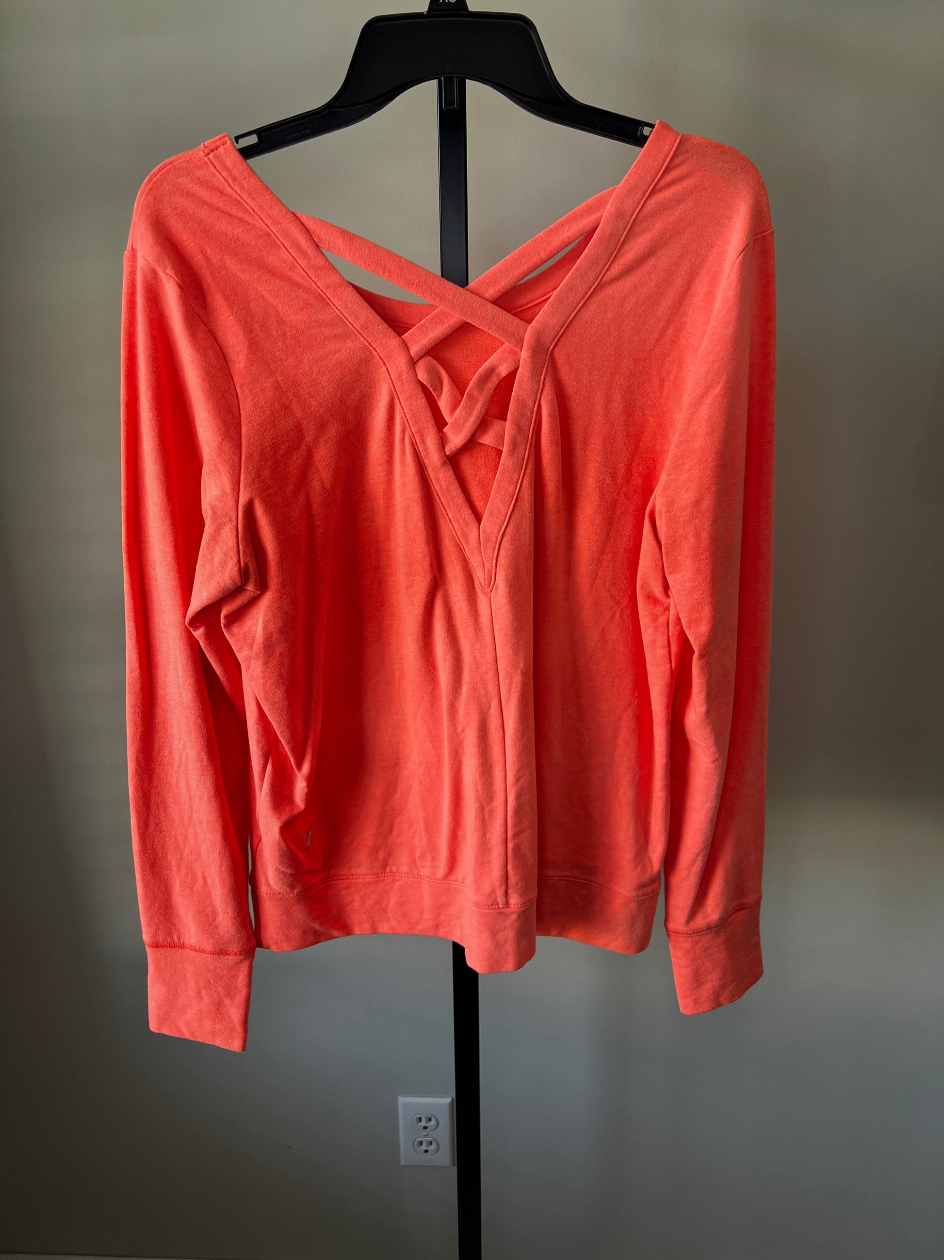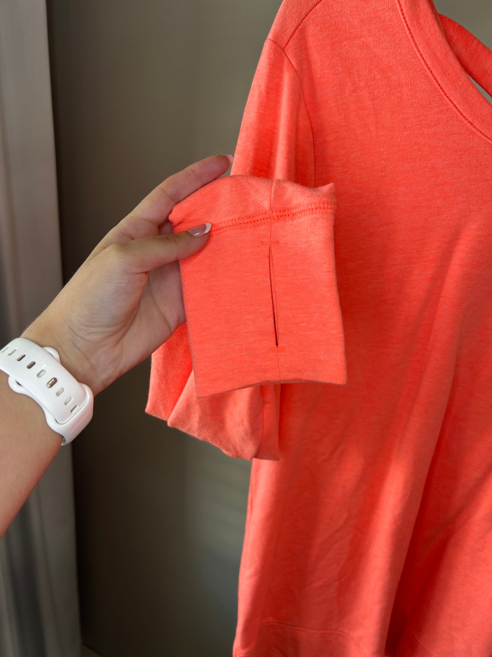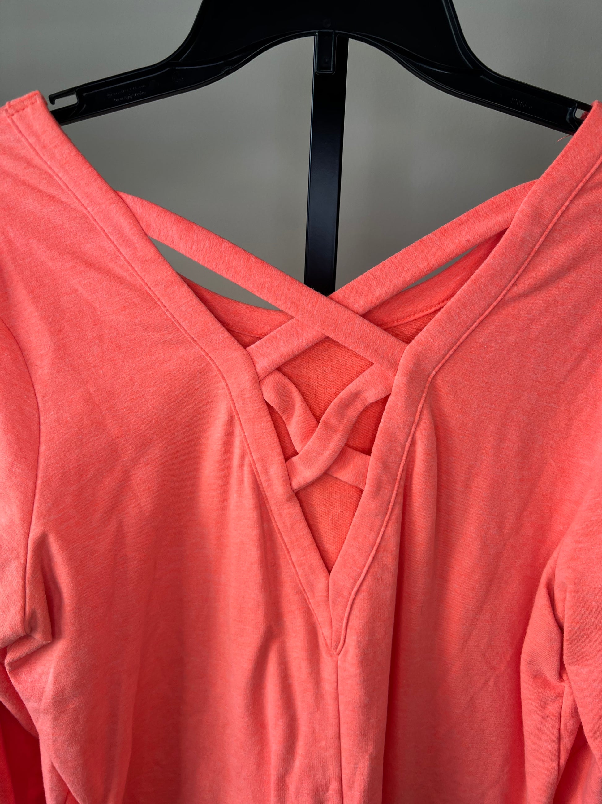 Pretty coral color with a criss cross back and thumb holes. No flaws!