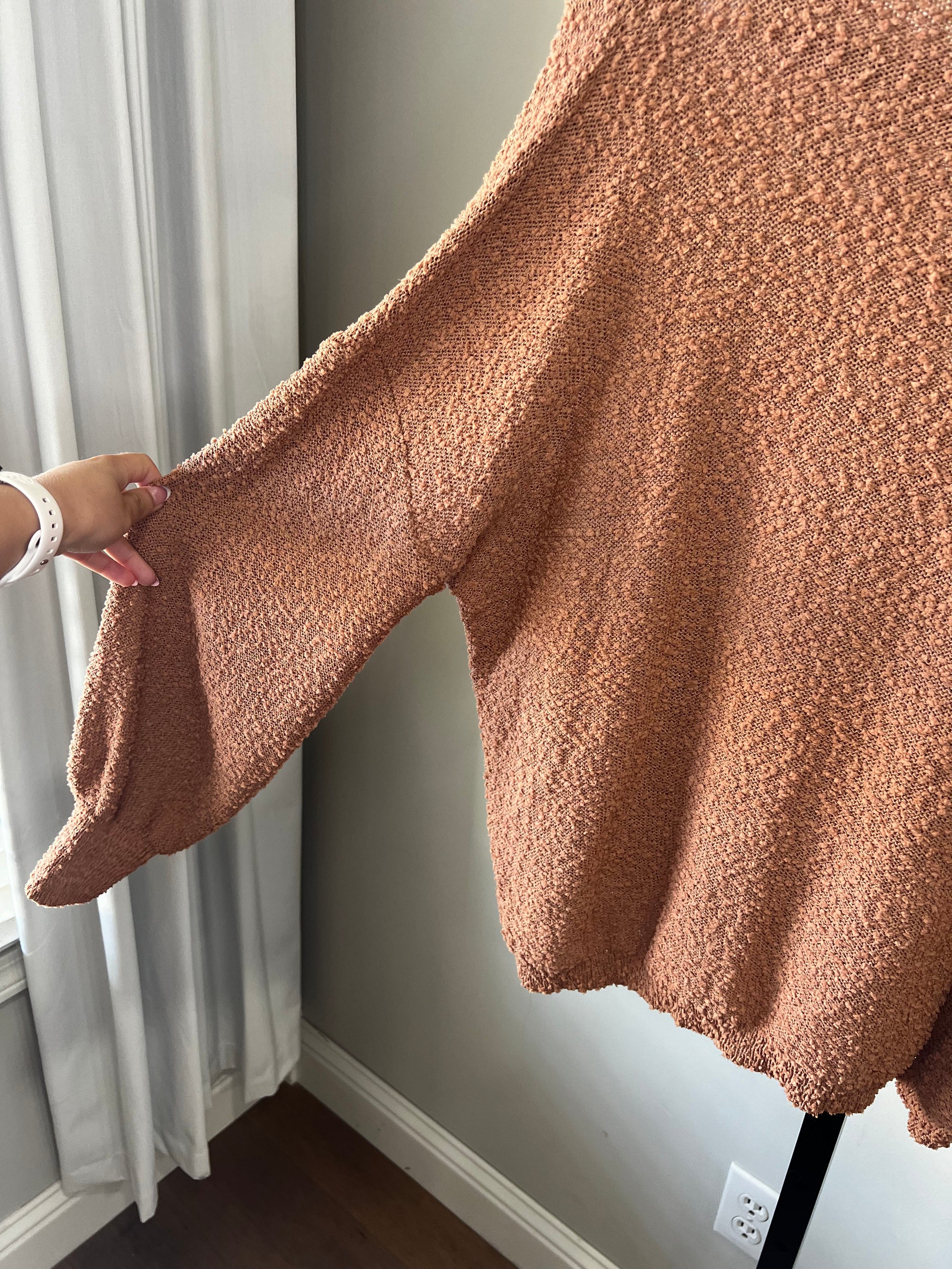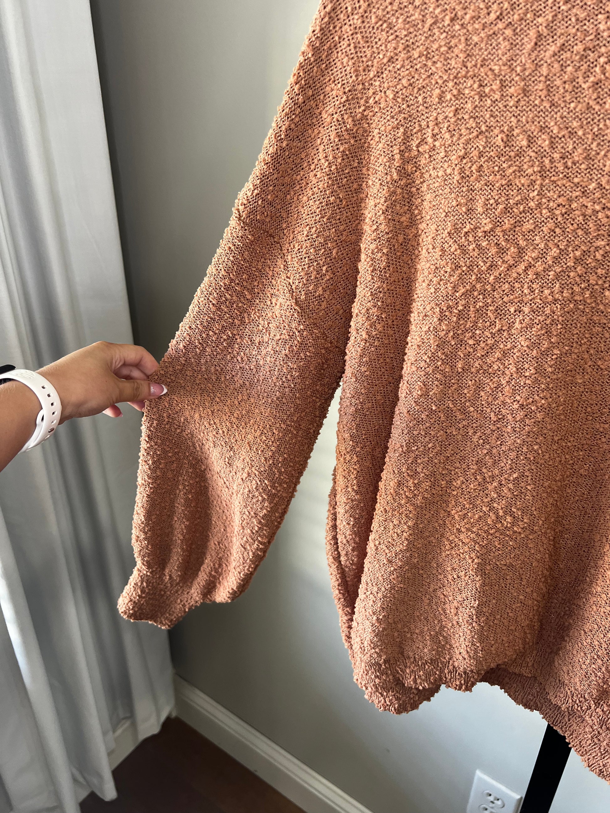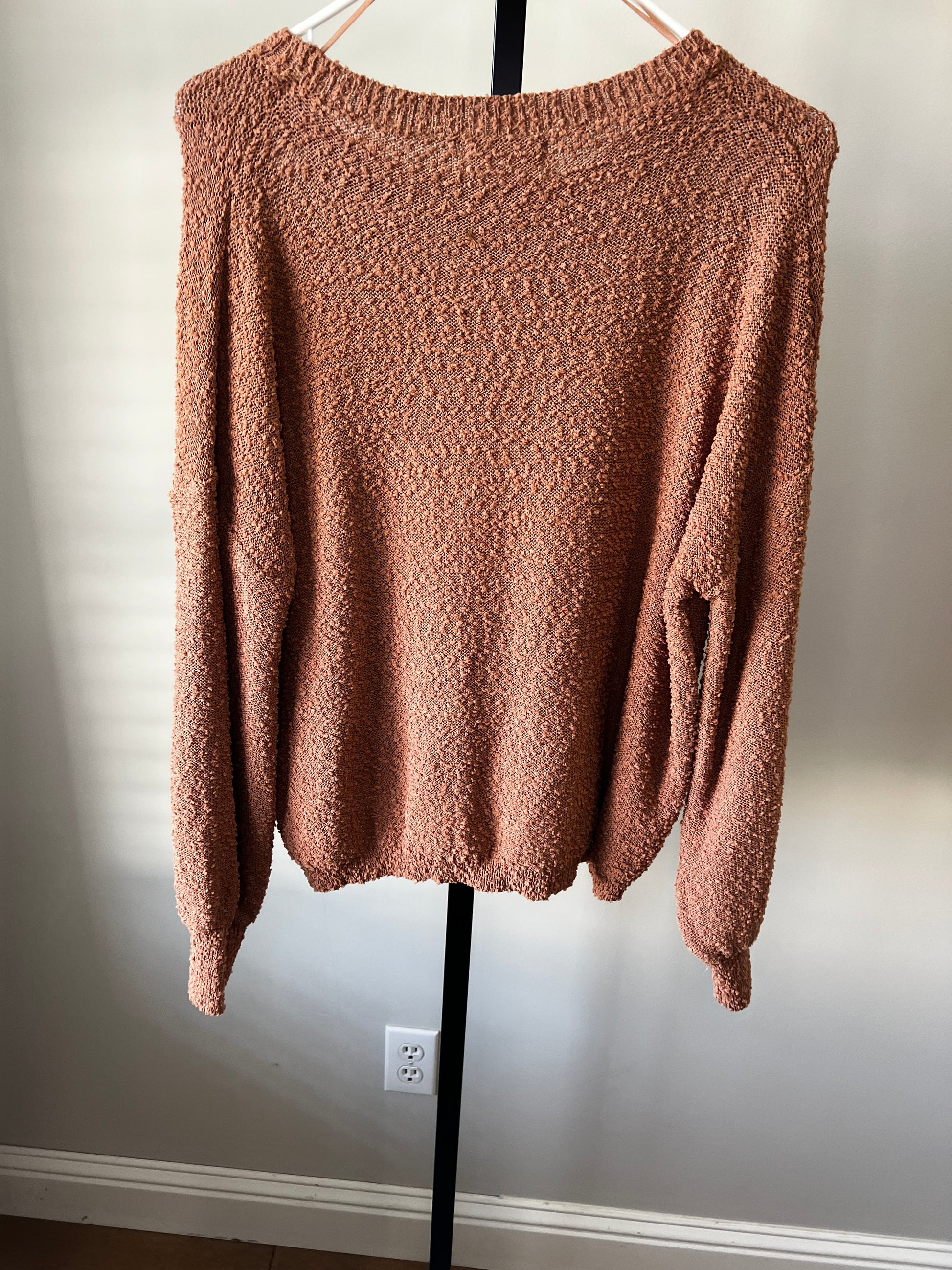 The prettiest rust color, perfect for Fall! I love the texture detail on this one. So cute with. a mini skirt or jeans and some booties! No flaws!