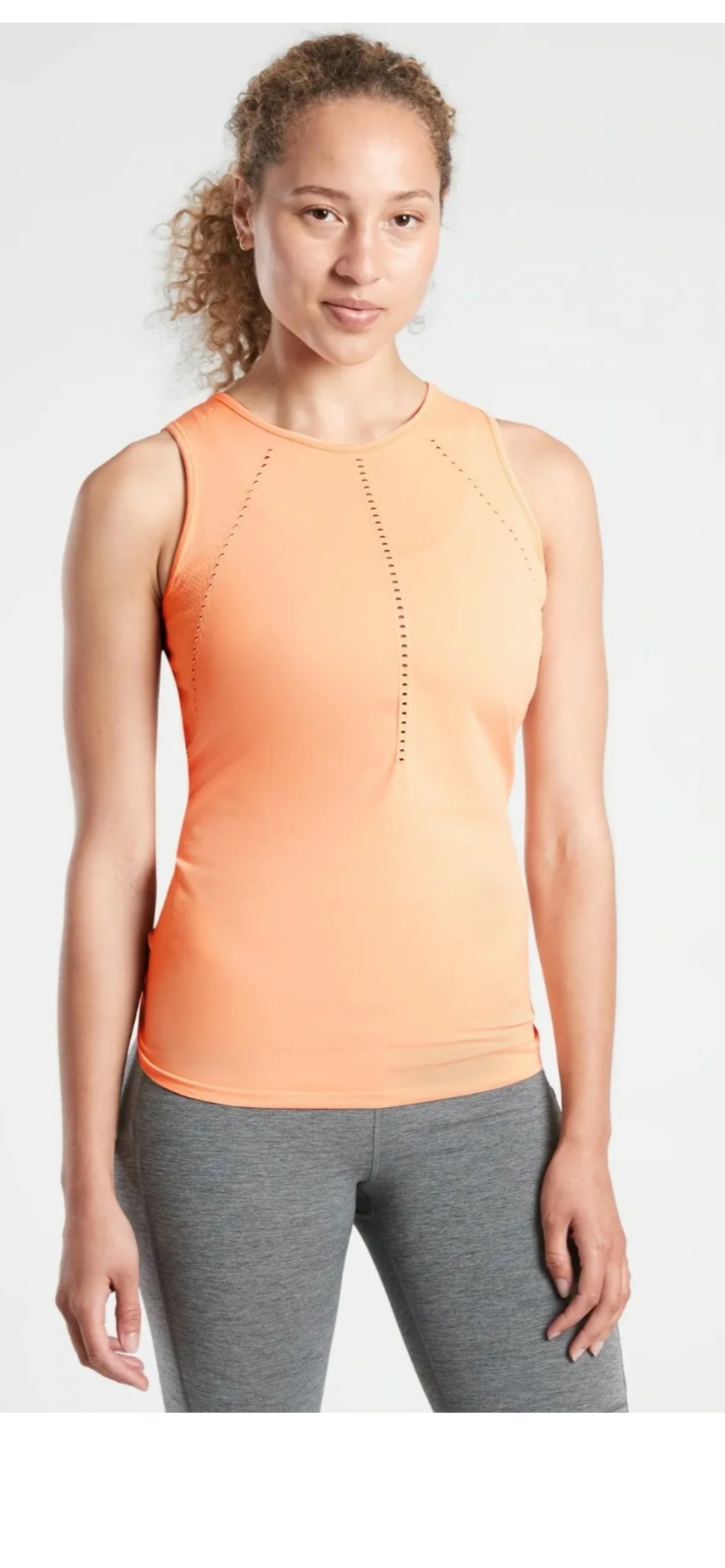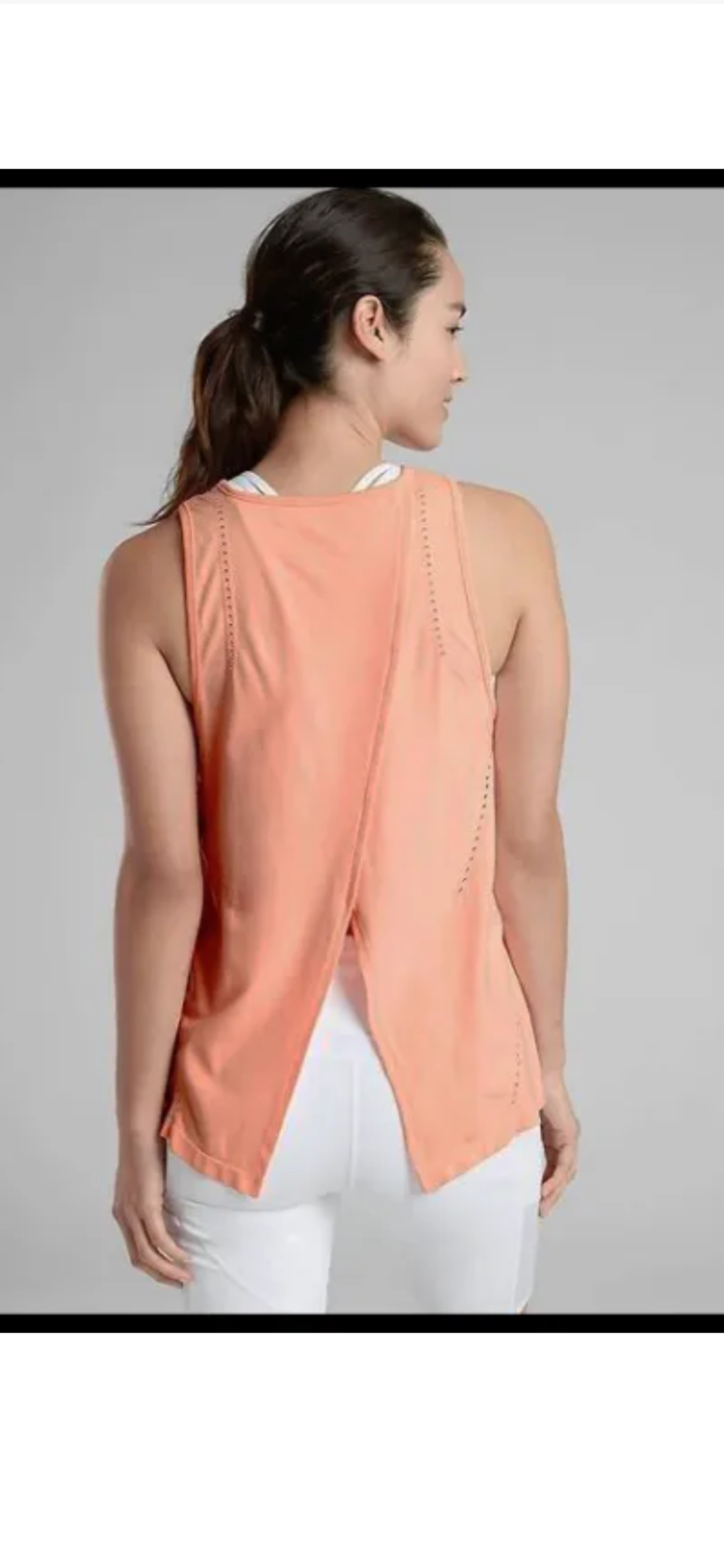 Peach in color. Can be worn with an open flowy back OR tied in the back. Perfect for a good workout, a run, yoga, or running errands. Breathable stretchy material.