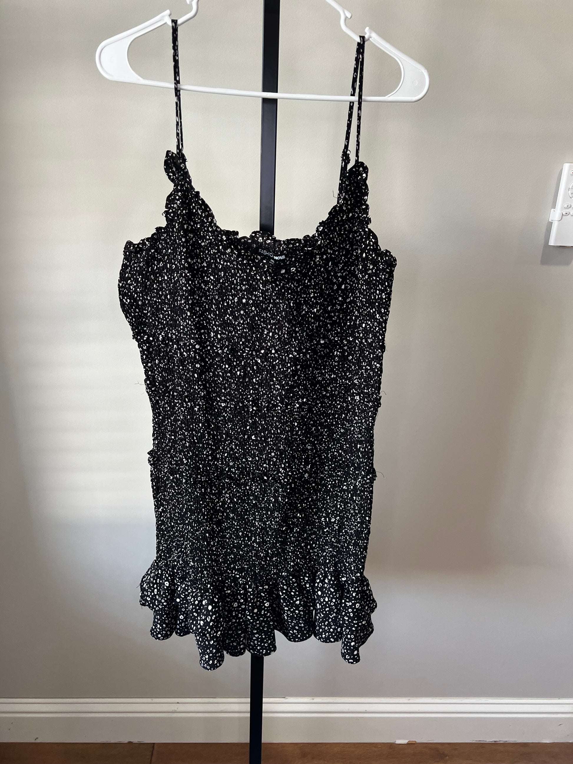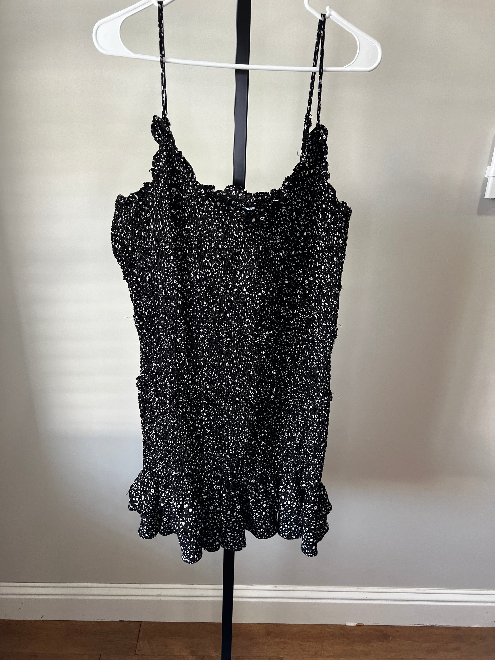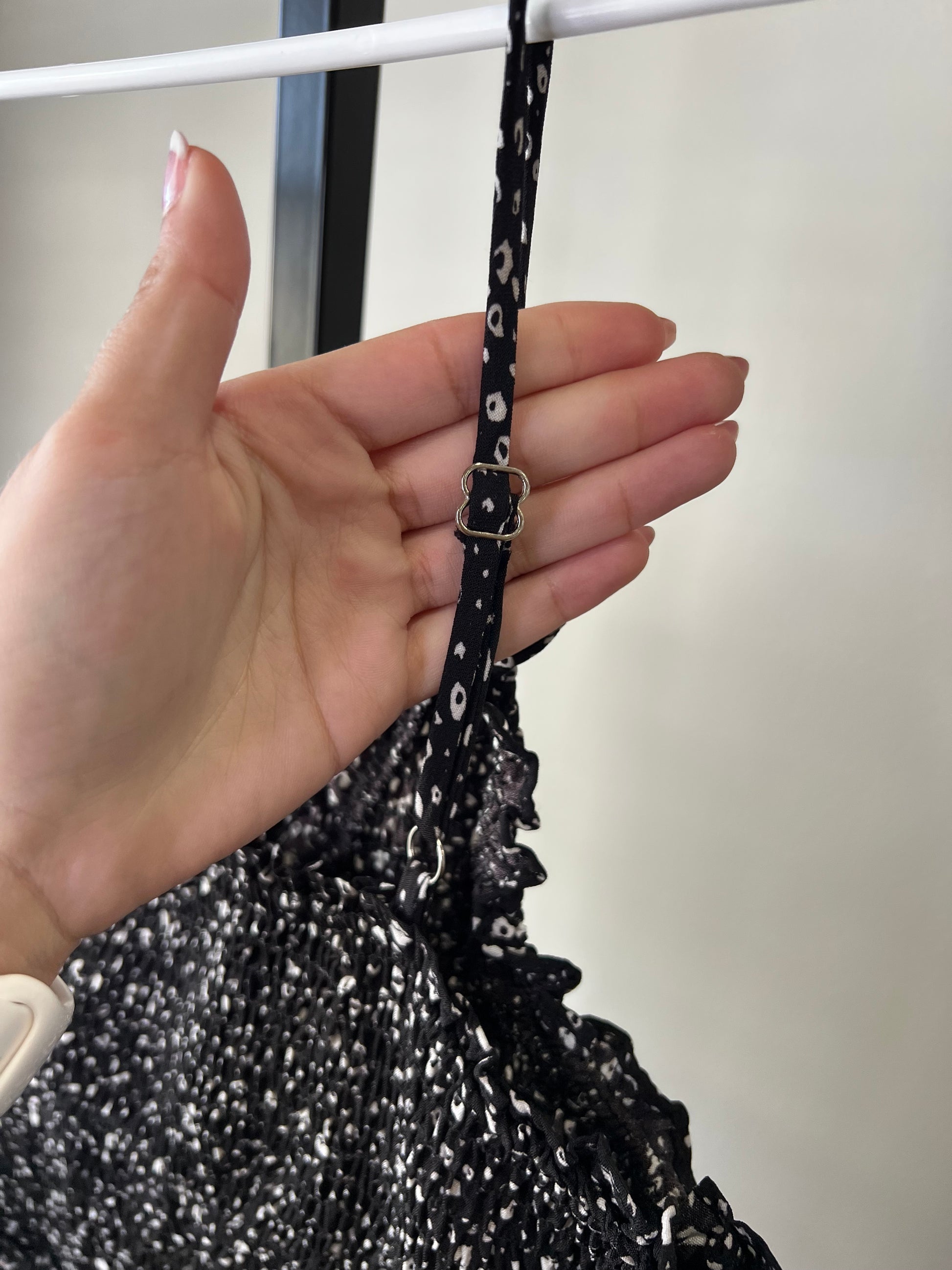This is very stretchy throughout so could fit up or down a size. Adjustable straps. The cutest little ruffle details. No flaws!