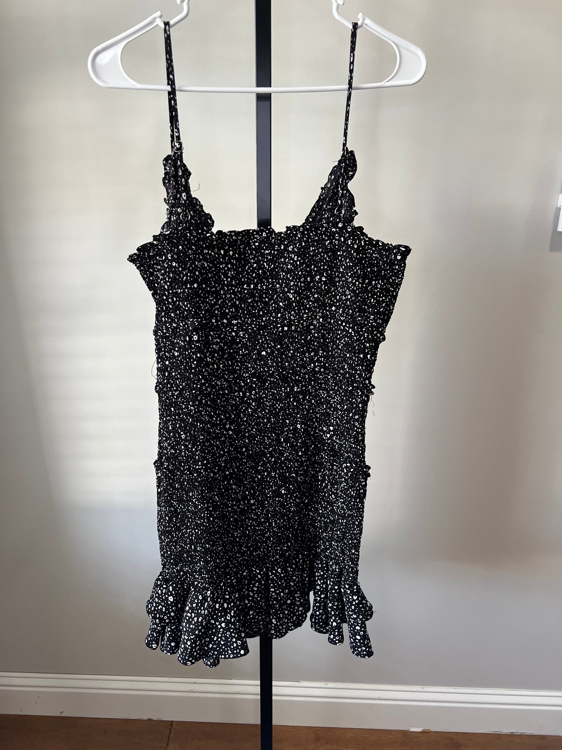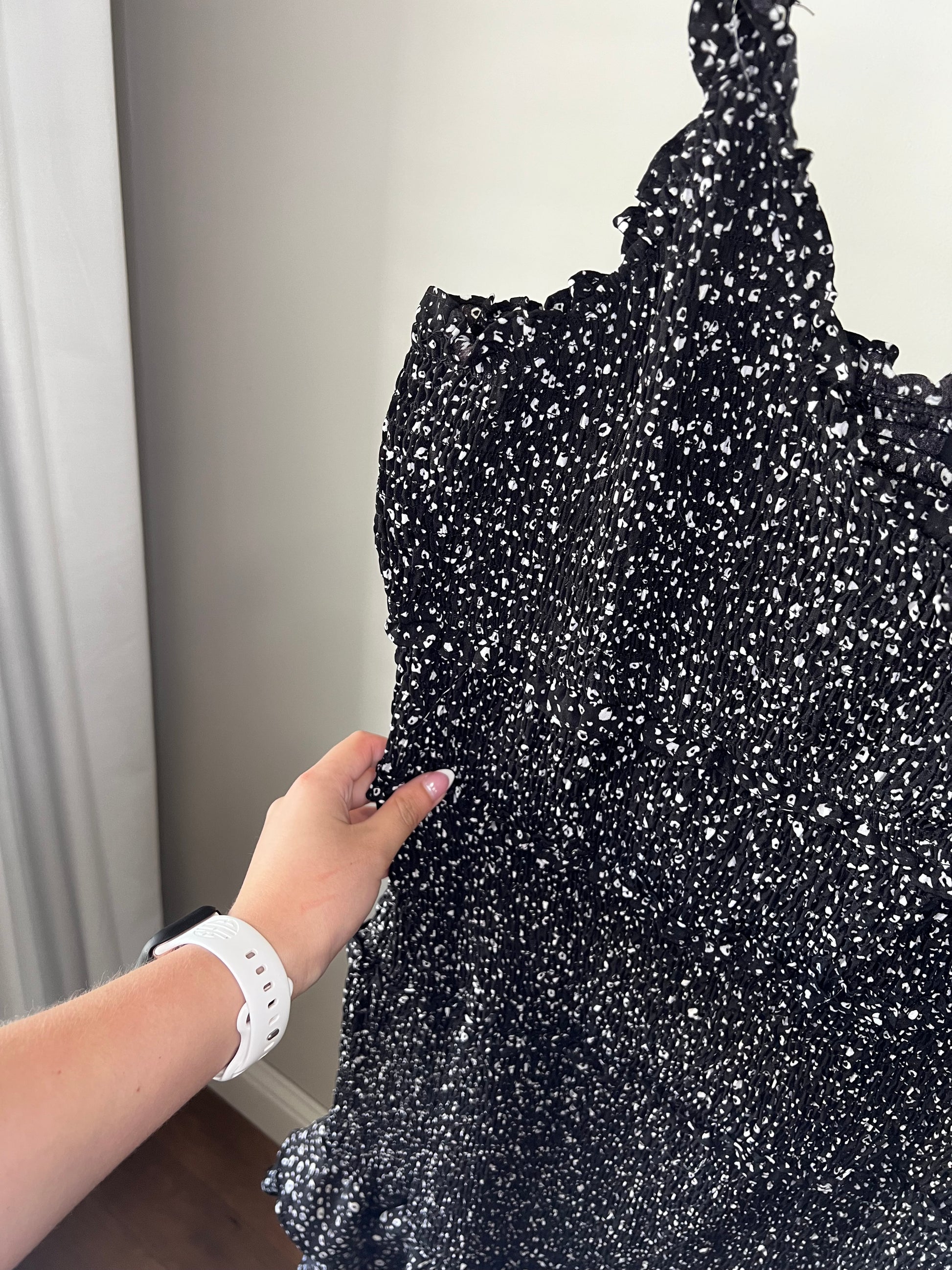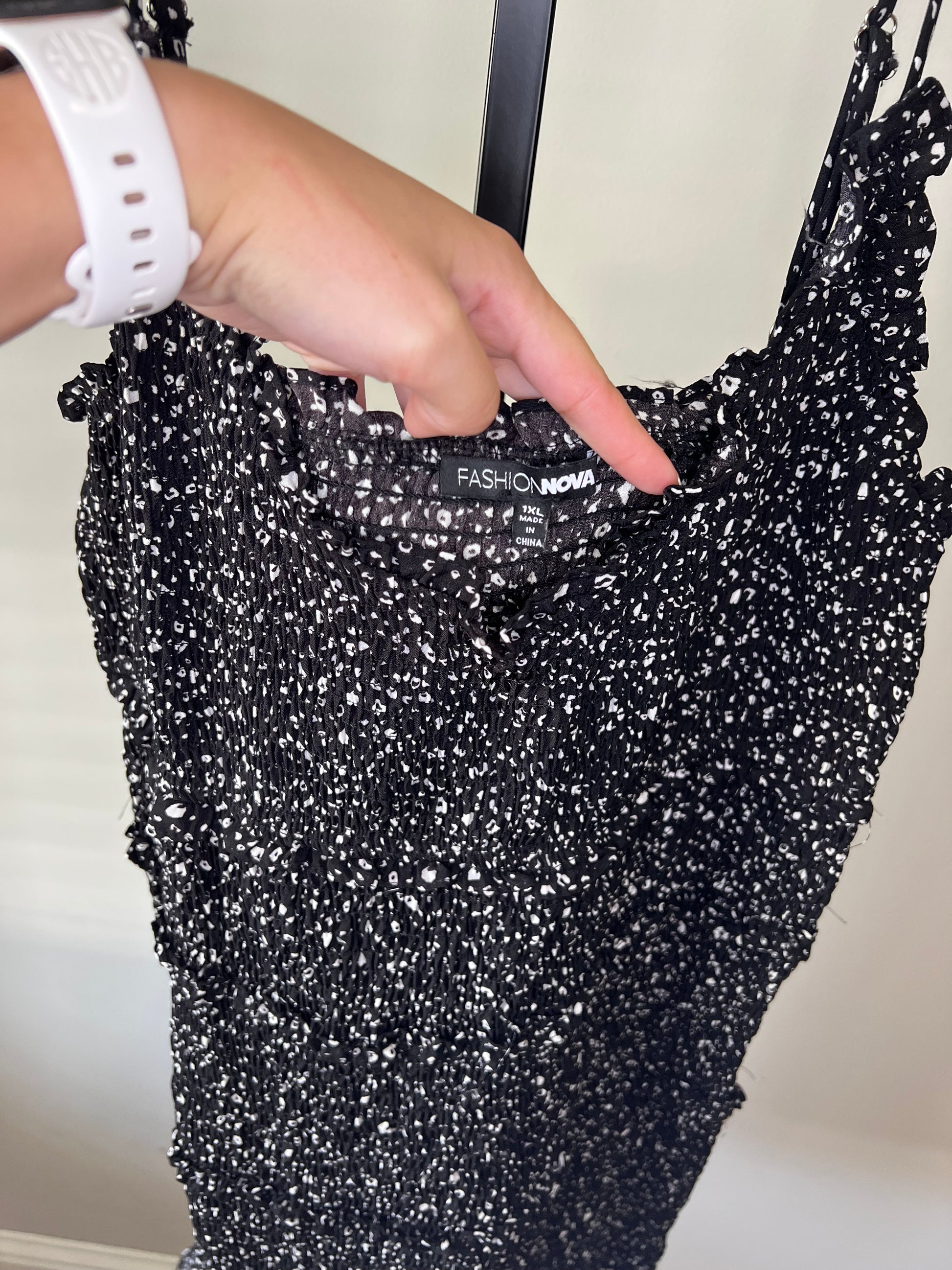 This is very stretchy throughout so could fit up or down a size. Adjustable straps. The cutest little ruffle details. No flaws!