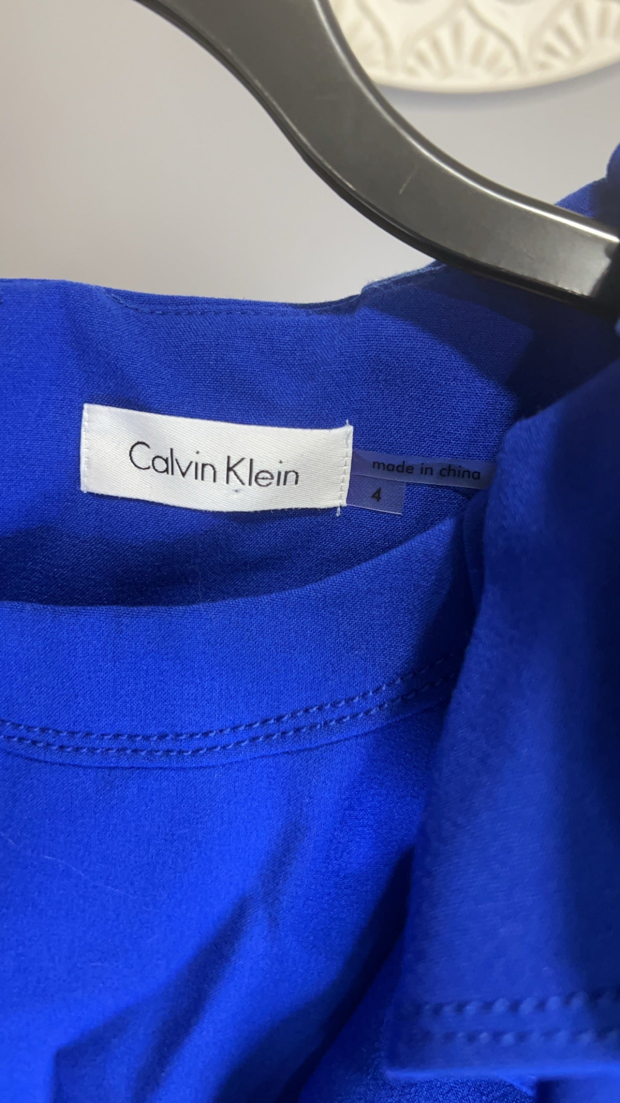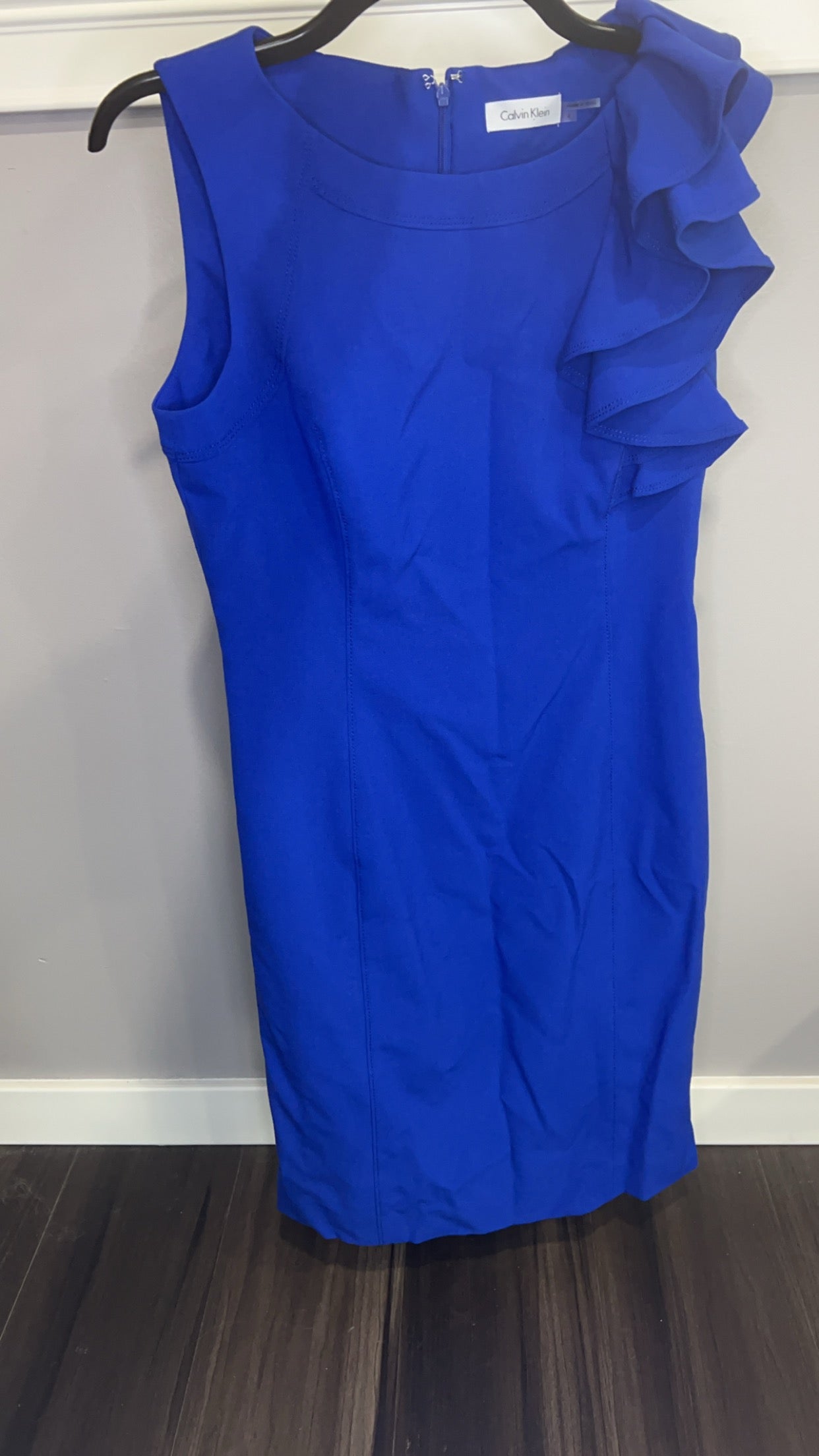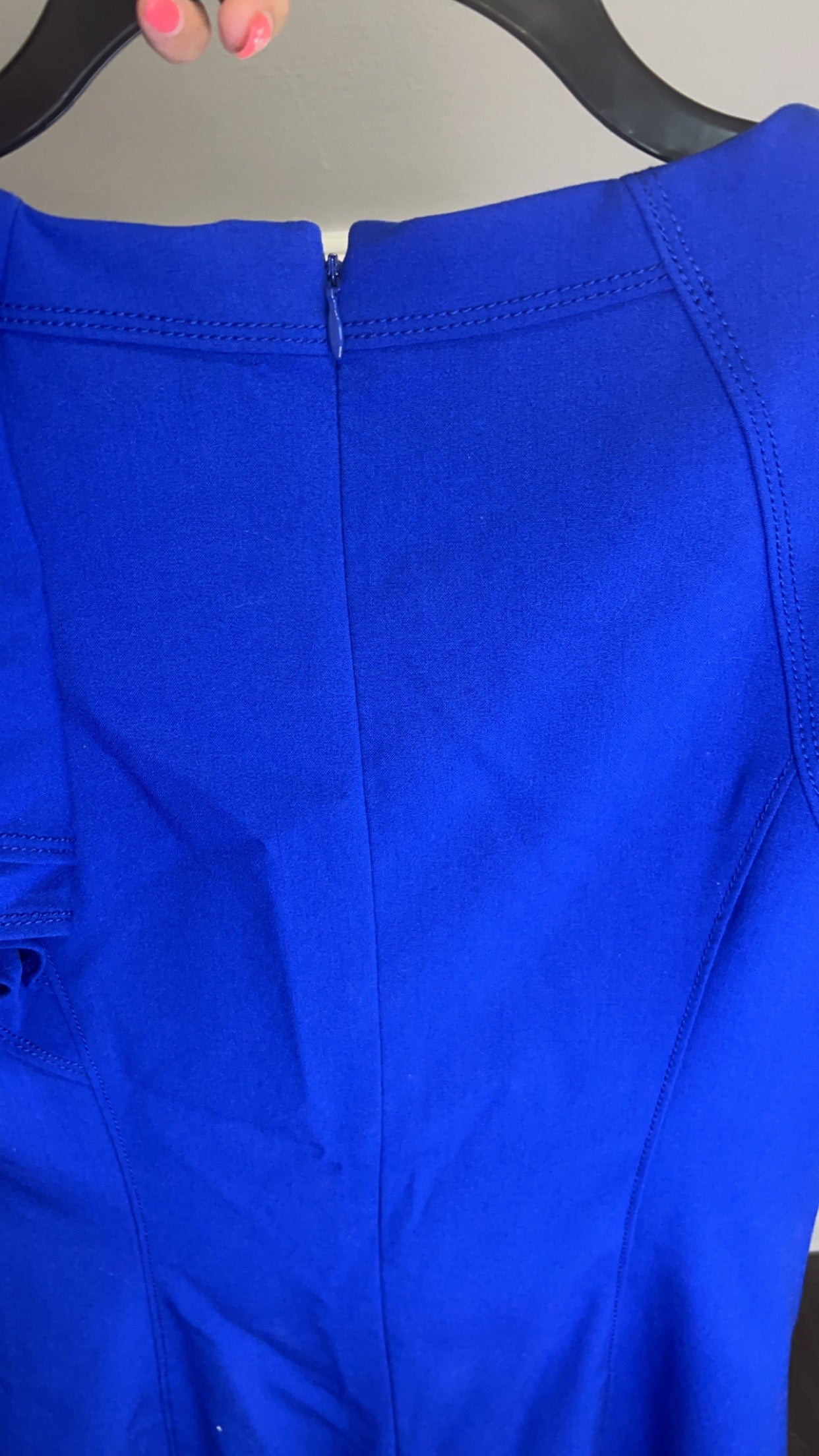 This is a beautiful royal blue. Modest length with a gorgeous ruffle detail on one side. No flaws!