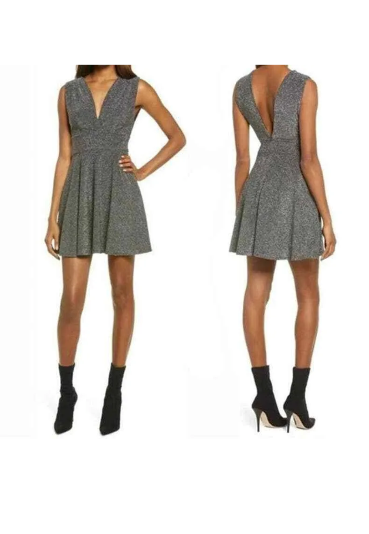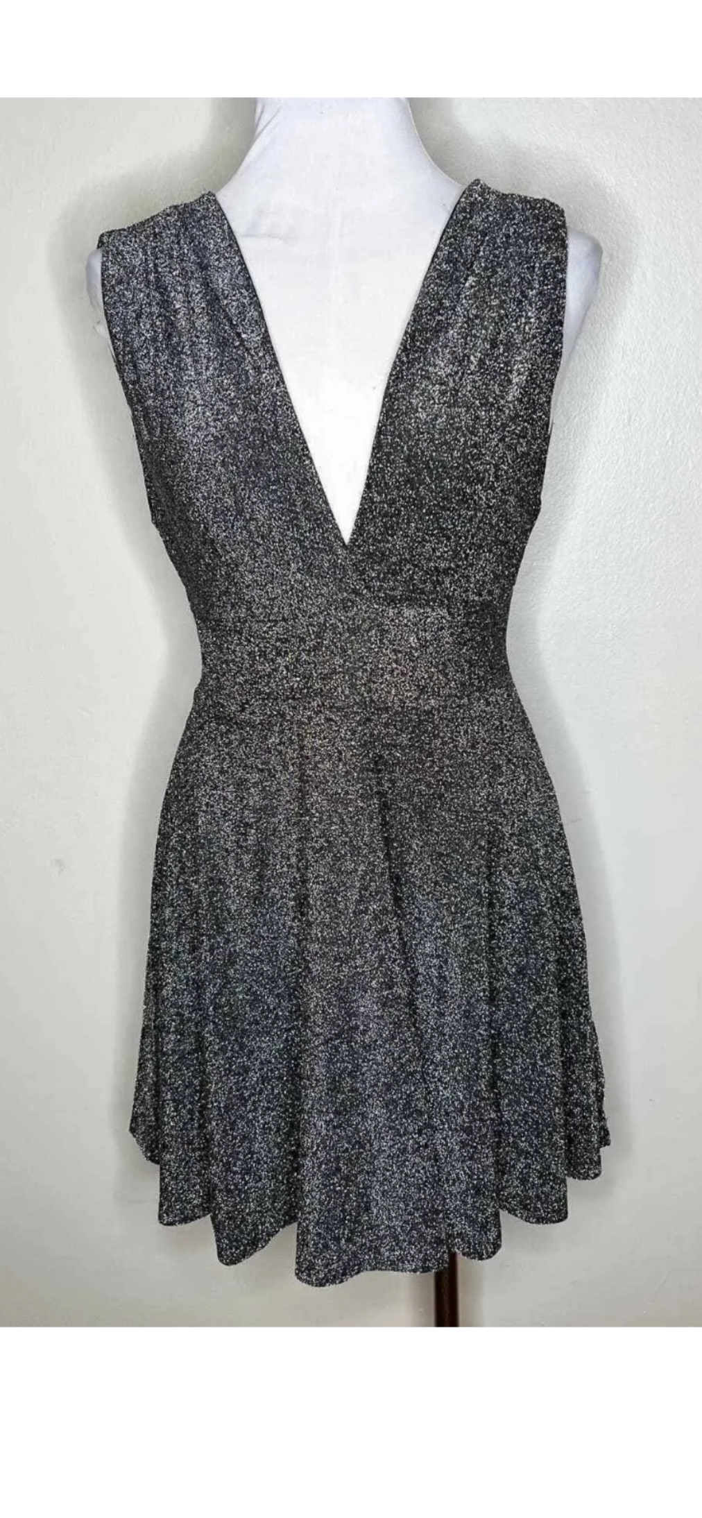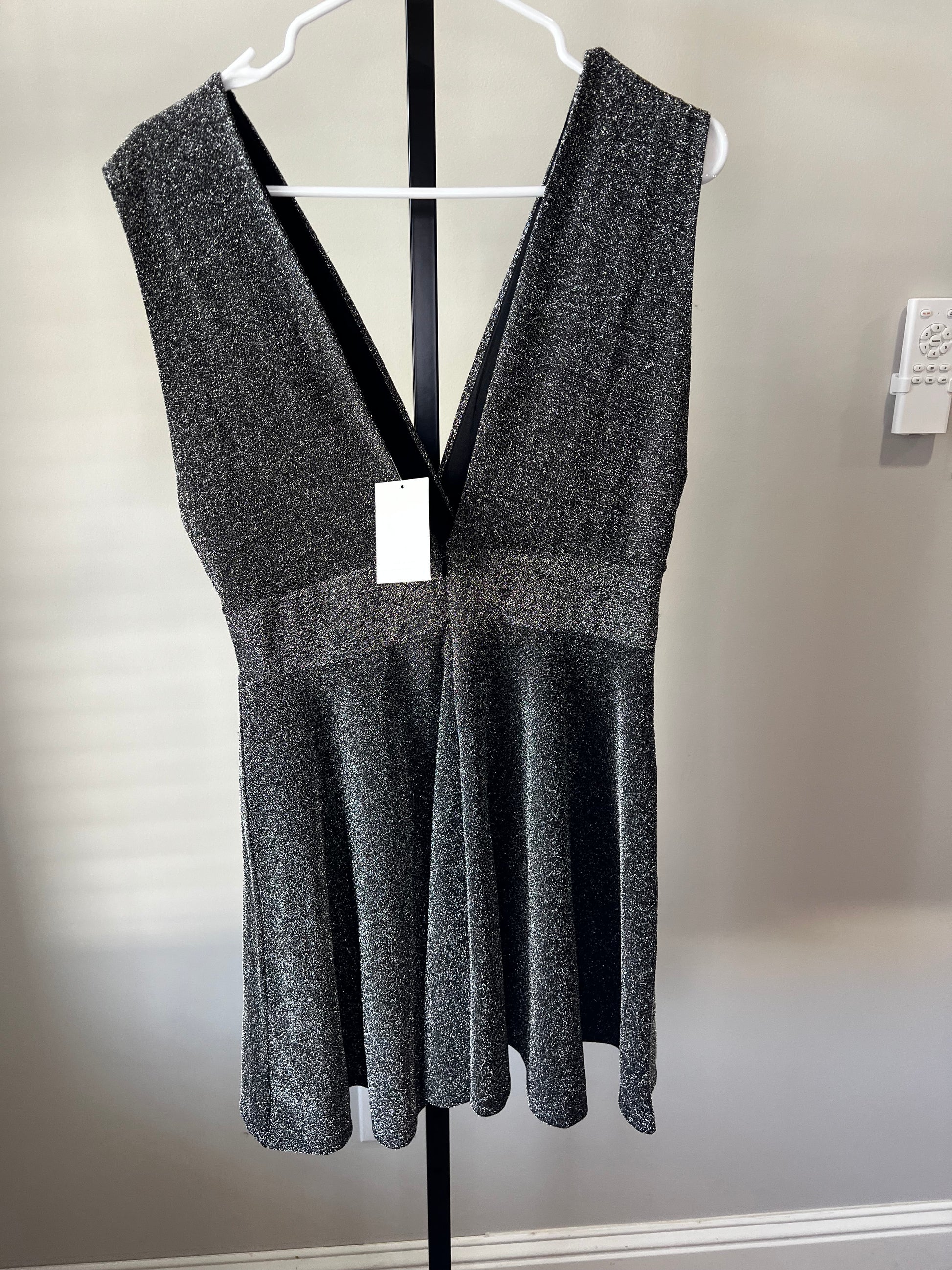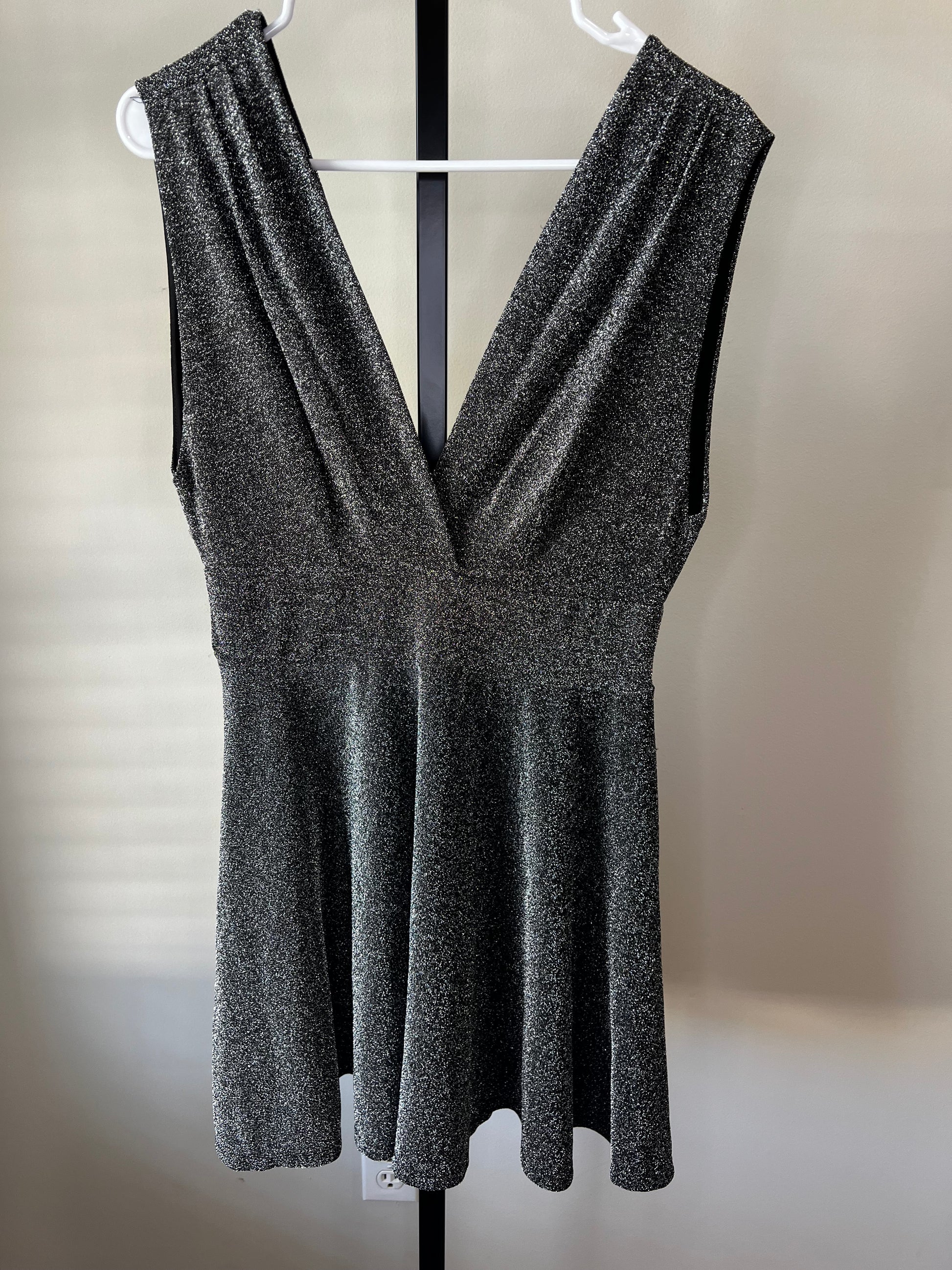 Beautiful mini dress with silver sparkles in the threading. Flattering V shape in the front and back.