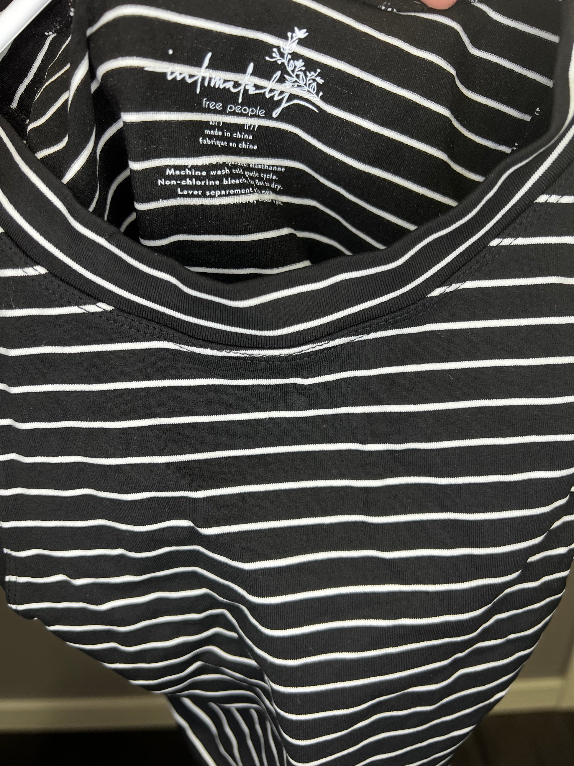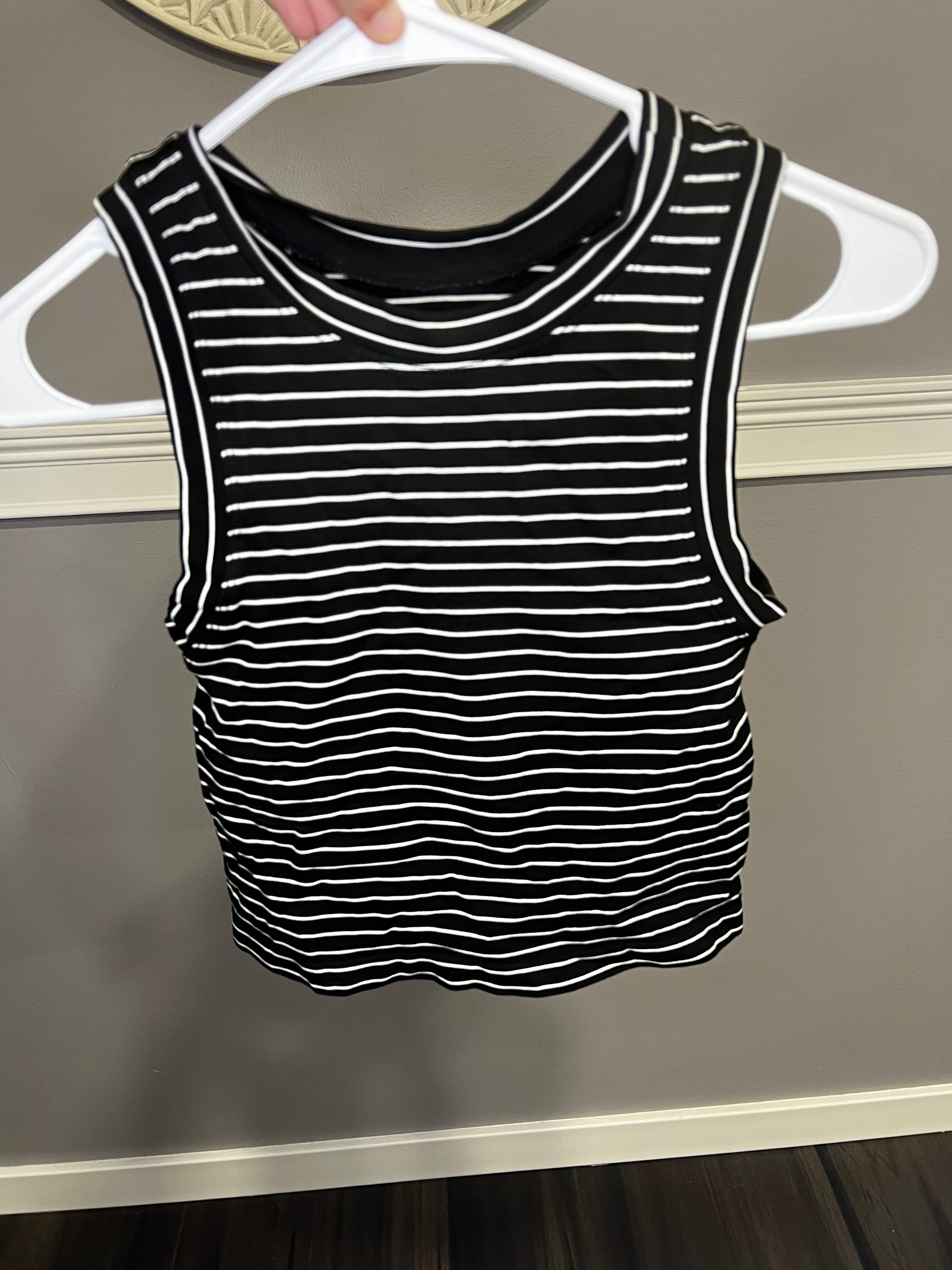In new condition. Has lots of stretch to it. Very slight crop but hits the top of your pants with high waisted pants.