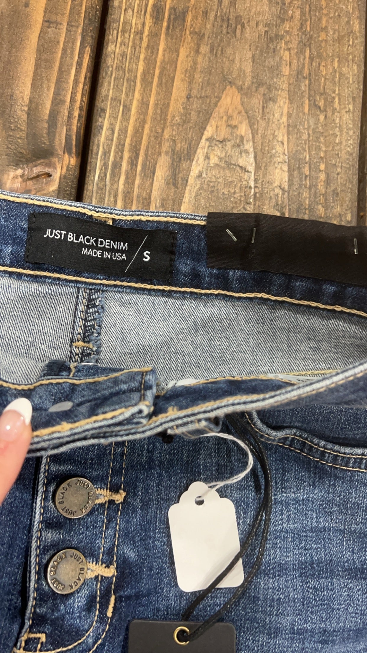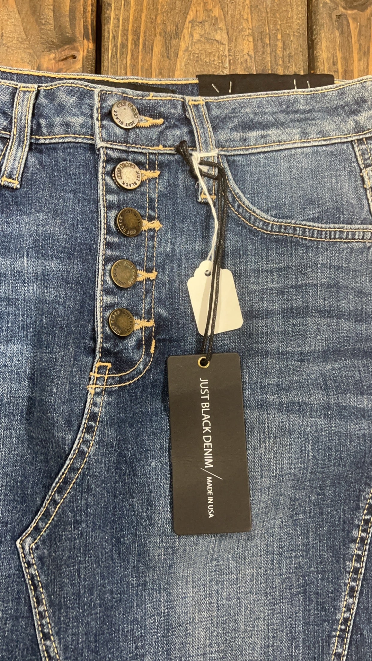 Button Fly in the front and a Medium/dark wash. No distressing except the cutoff detail on bottom