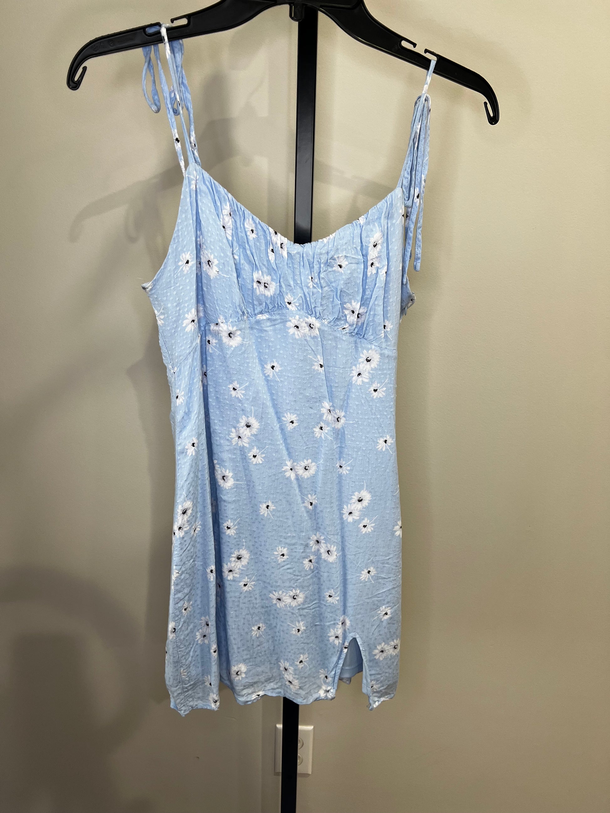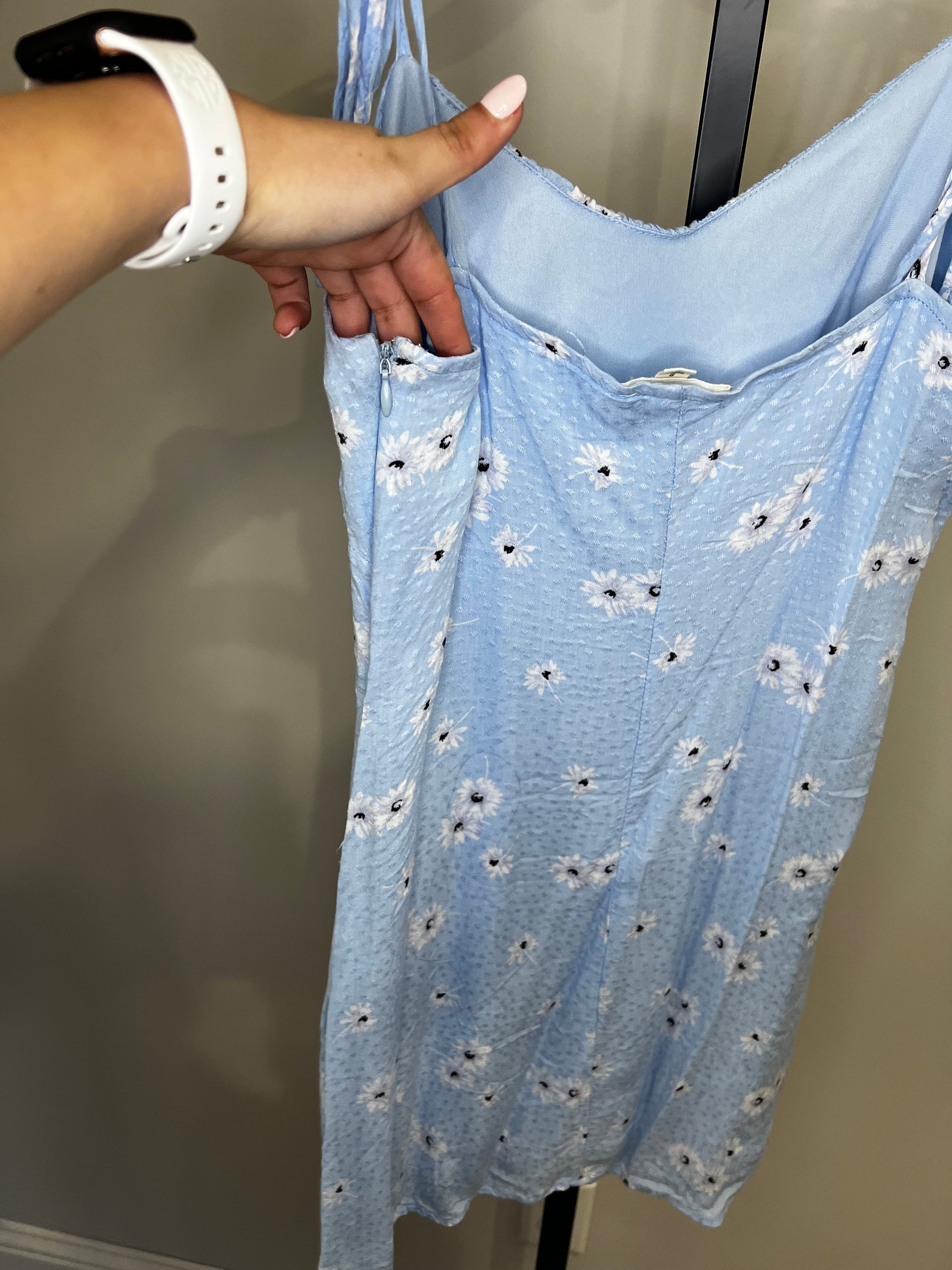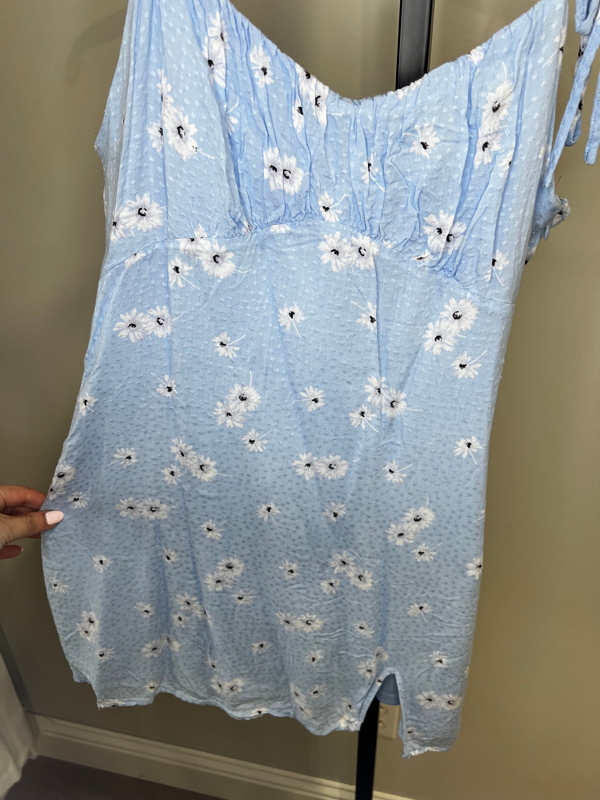 Stunning baby blue mini dress with white flowers. Small slit on side and adjustable, tie straps. This is adorable on an actual person, double lined. No flaws!