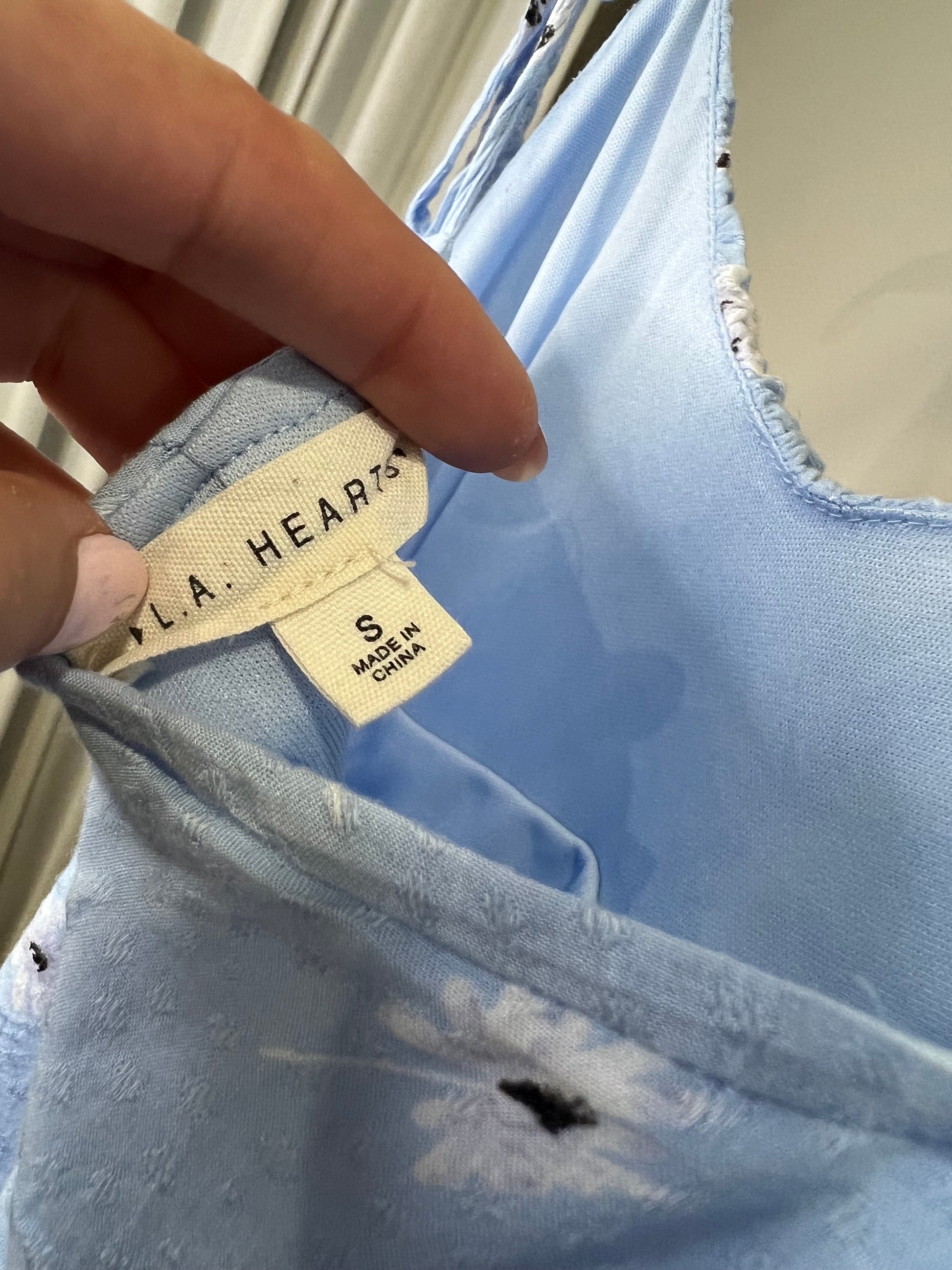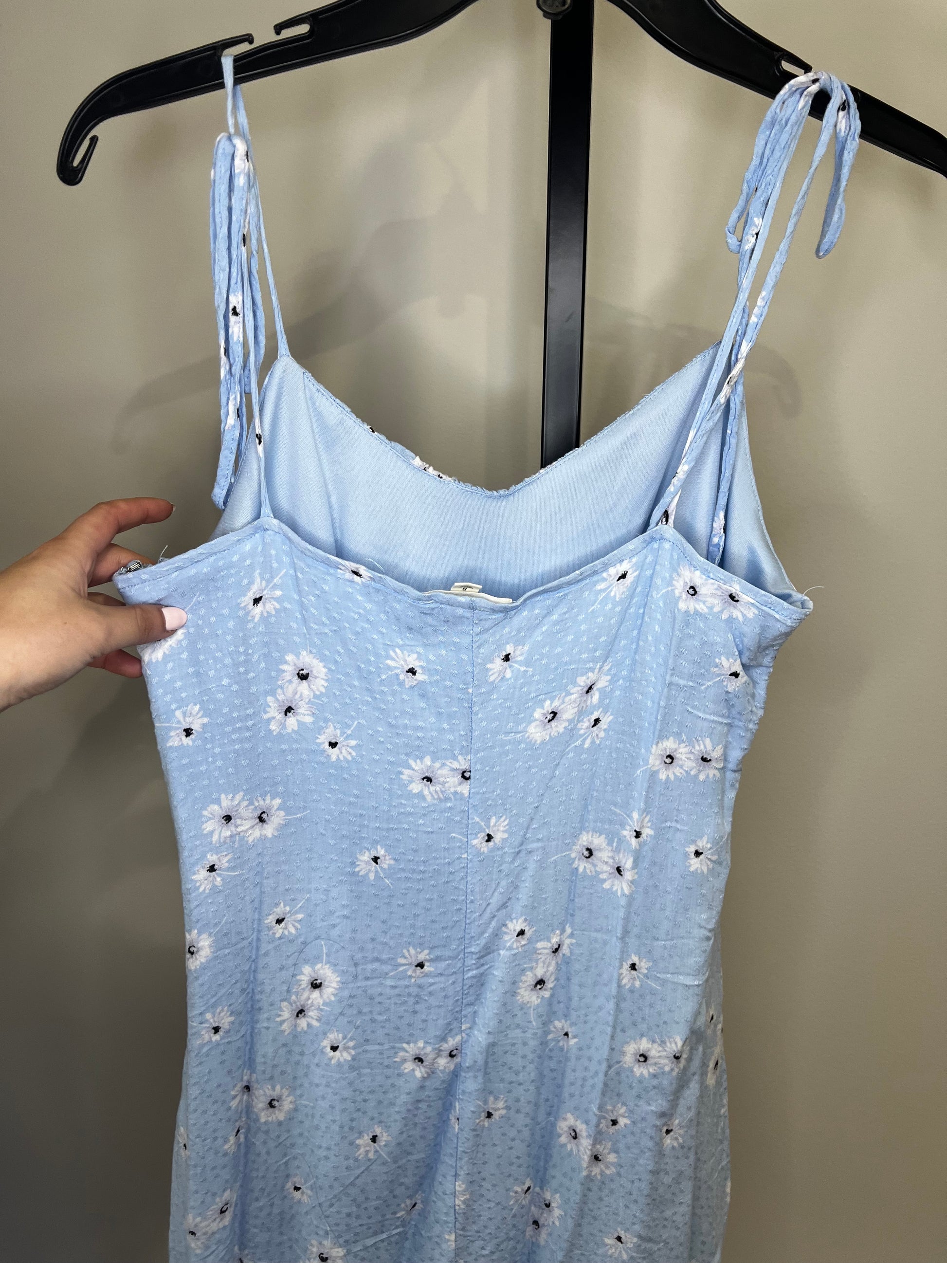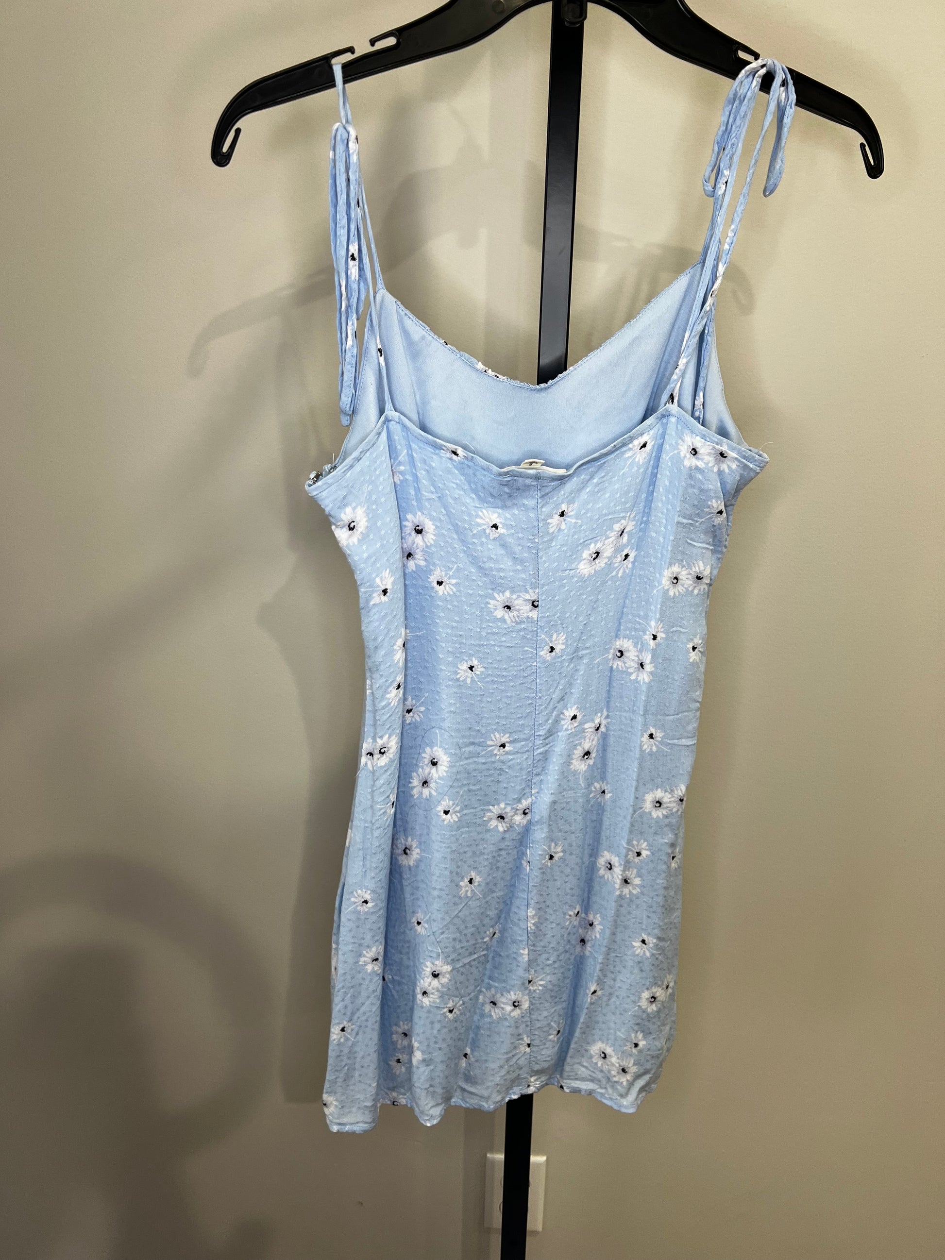 Stunning baby blue mini dress with white flowers. Small slit on side and adjustable, tie straps. This is adorable on an actual person, double lined. No flaws!