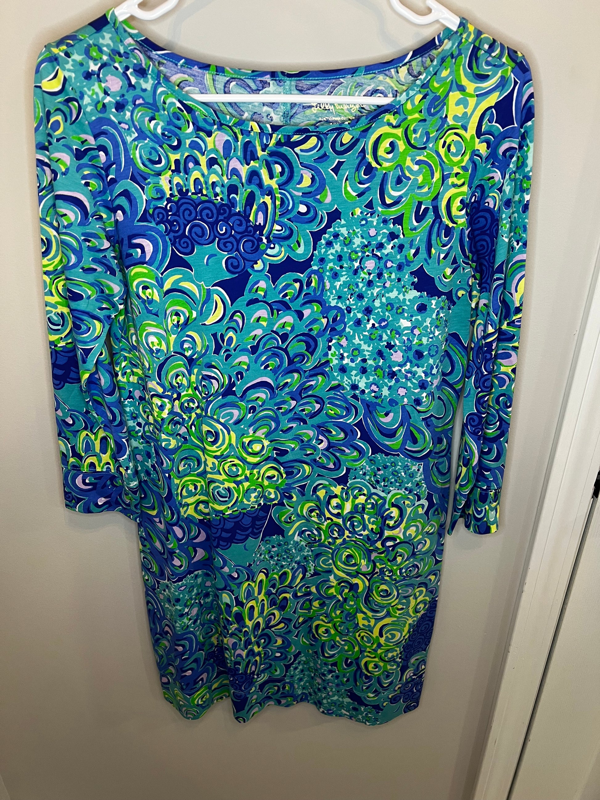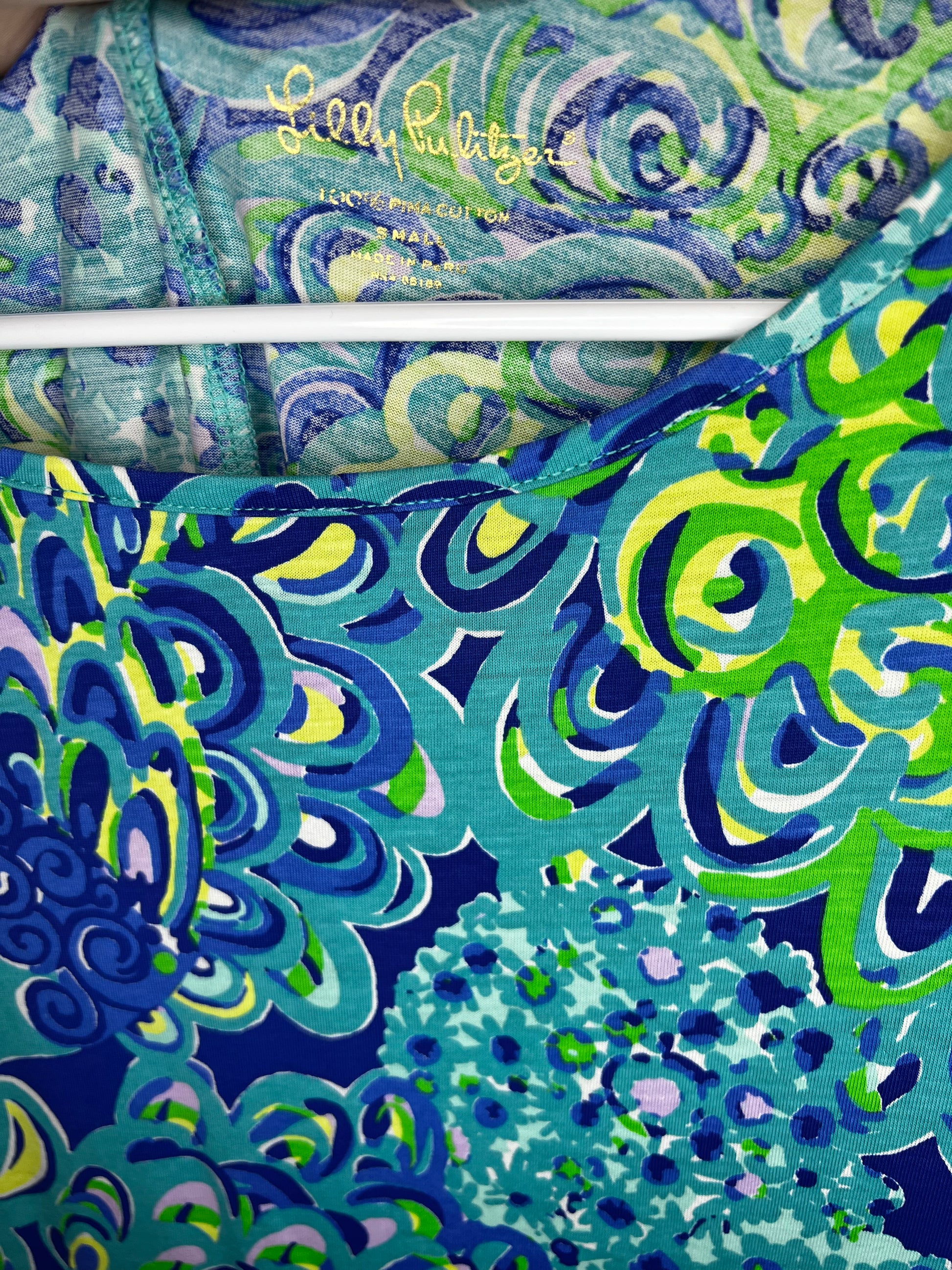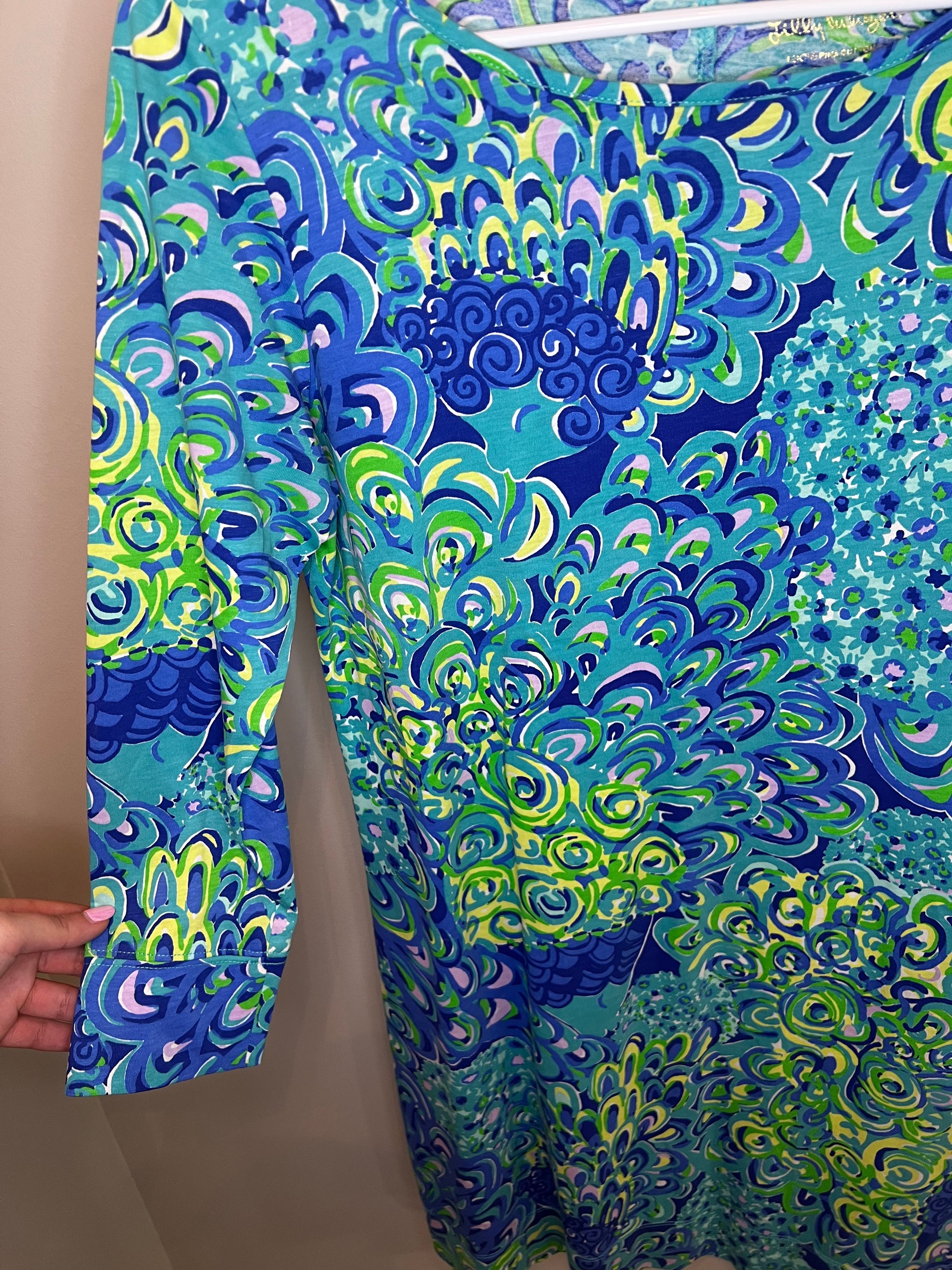 The colors on this are a gorgeous mix of blues and greens. Would be so cute styled with a belt and sandals or a denim jacket. No flaws!