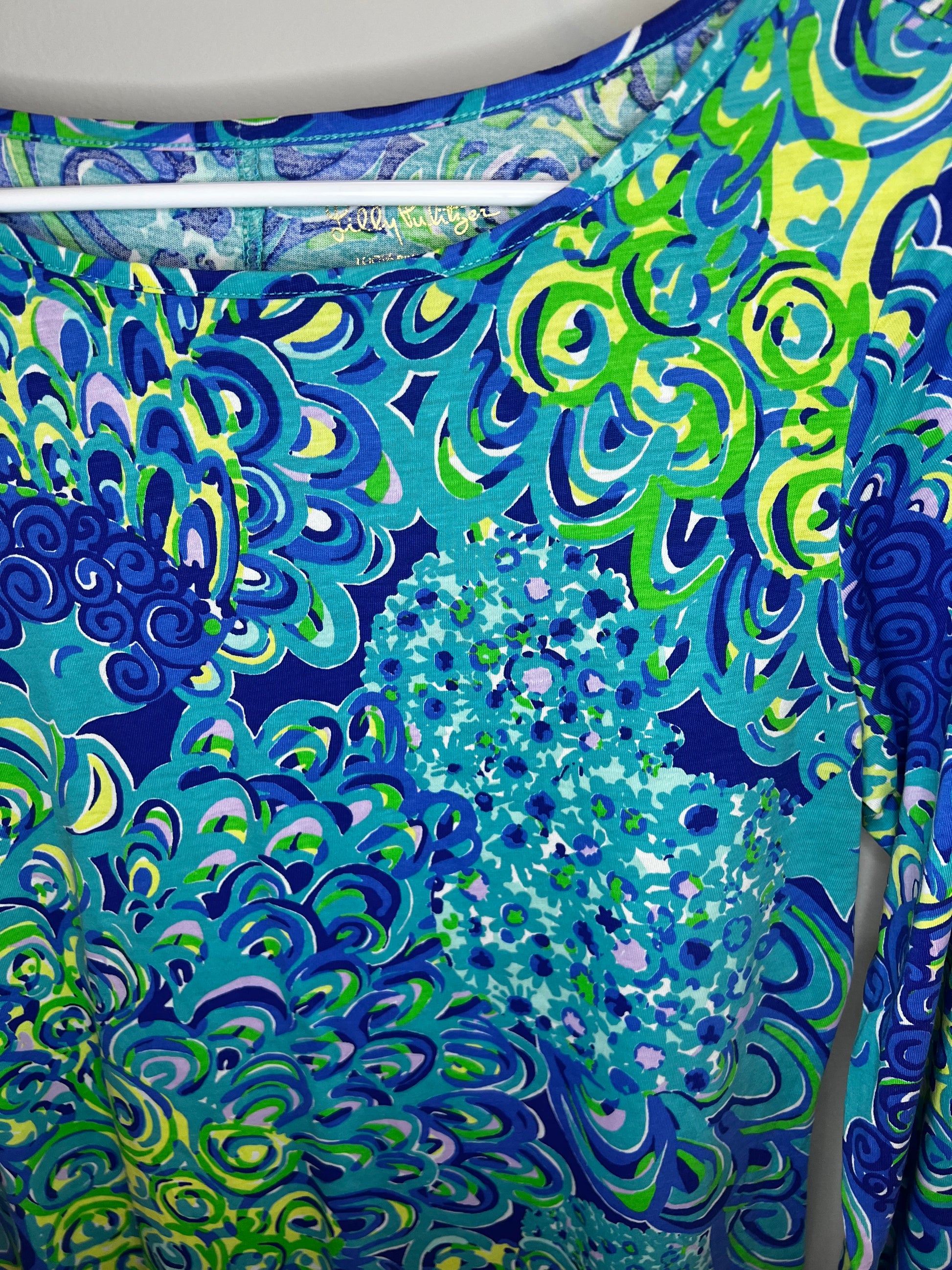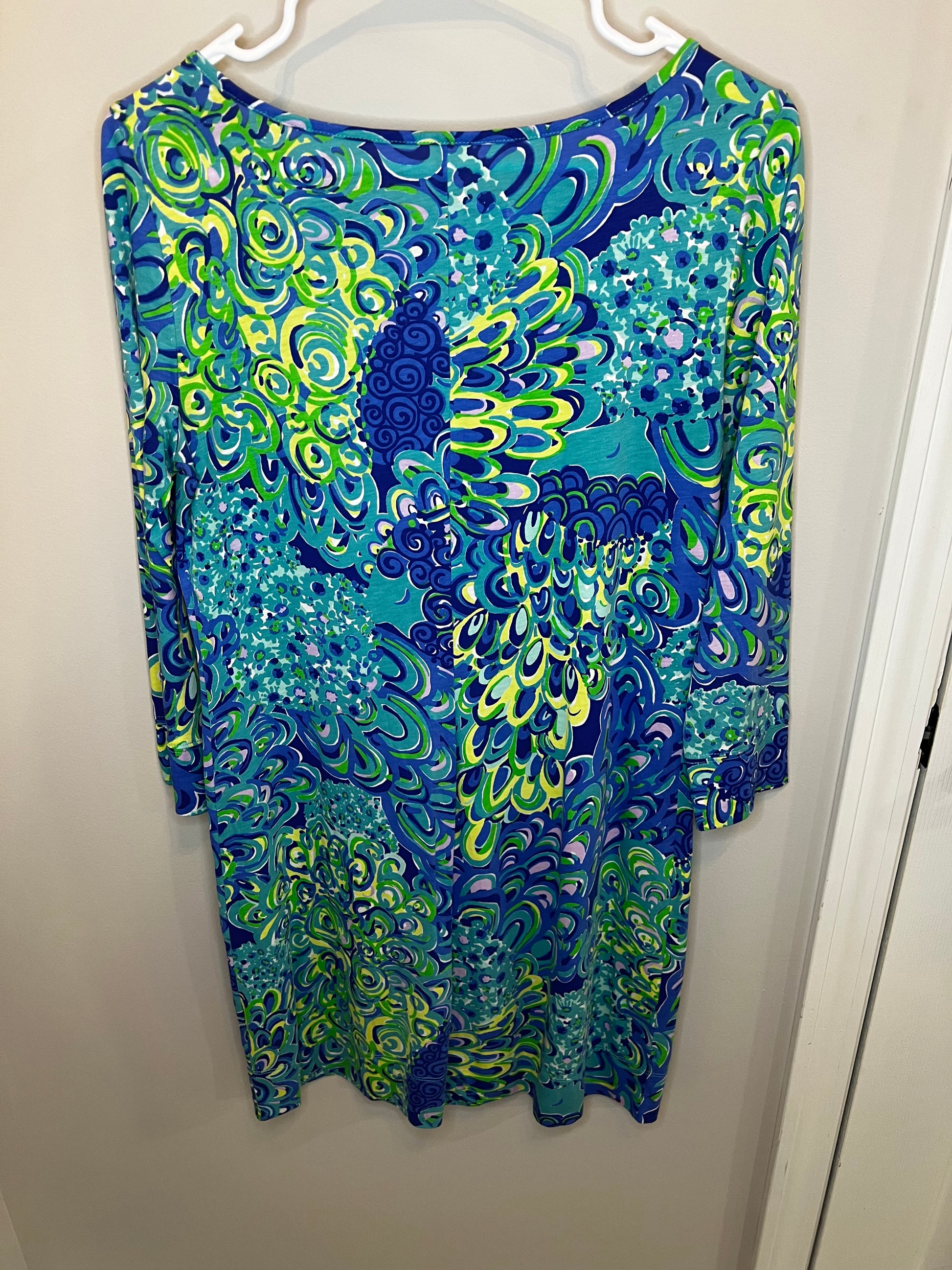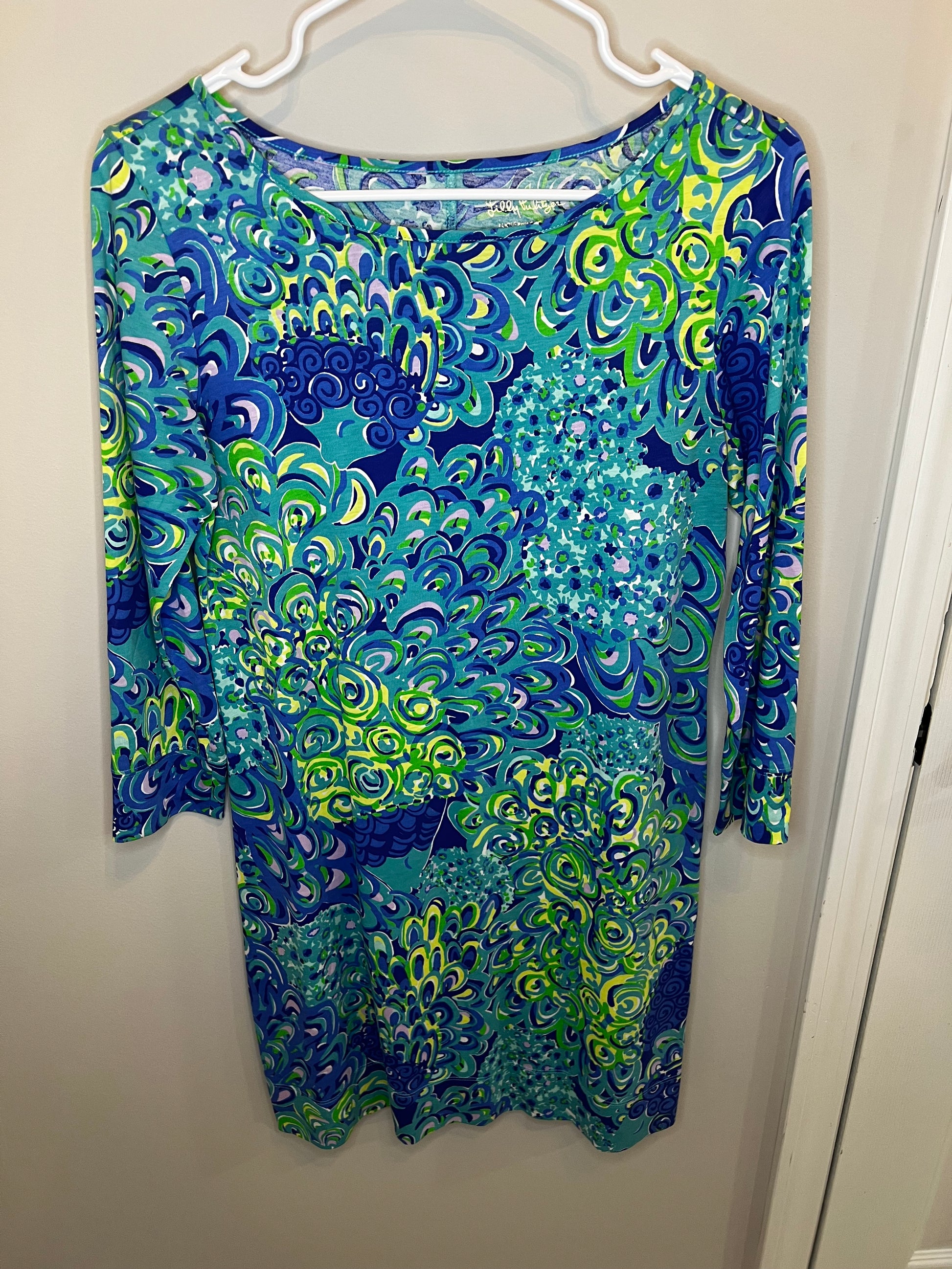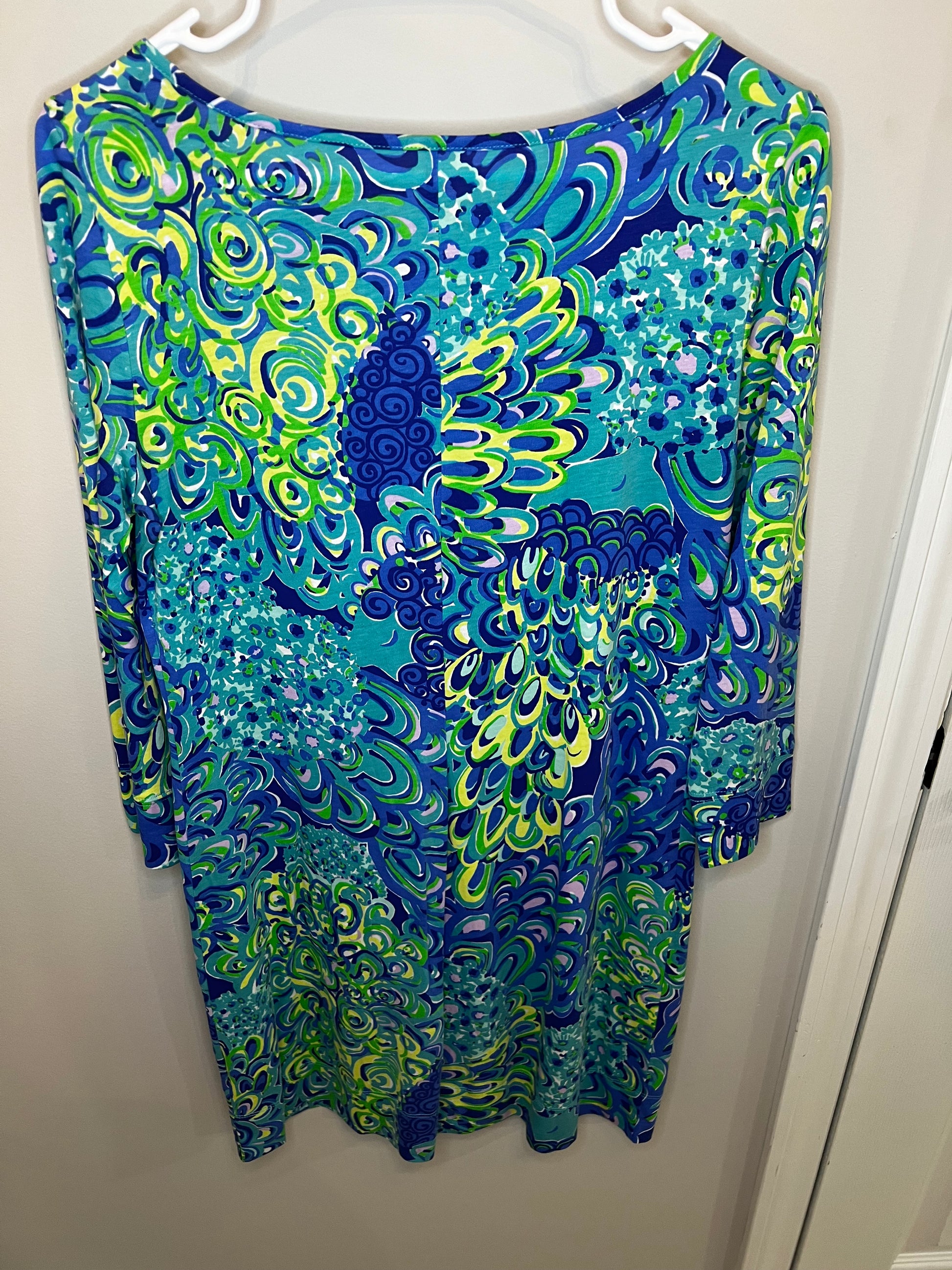 The colors on this are a gorgeous mix of blues and greens. Would be so cute styled with a belt and sandals or a denim jacket. No flaws!