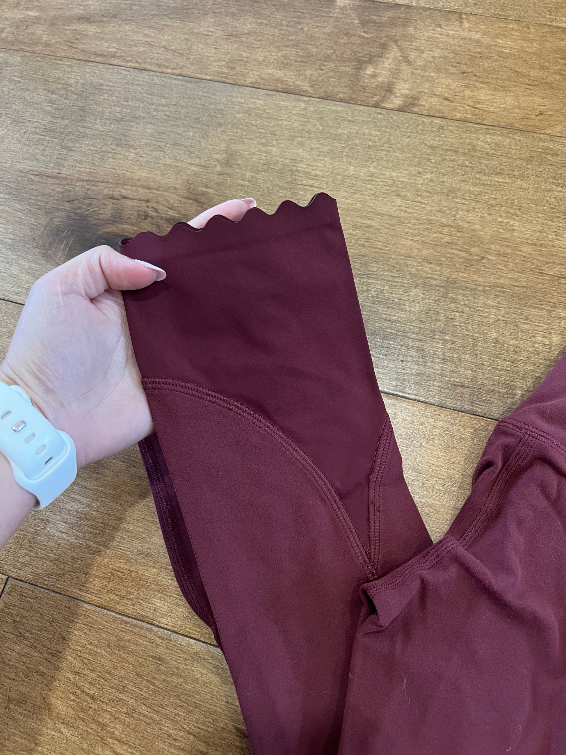 The scallop hem on these are so stinking cute! These aligns are in great condition. No flaws! Color is so versatile. Slight crop, depending on your height would hit above ankle or slightly higher. Color is red merlot. Nulu material.
