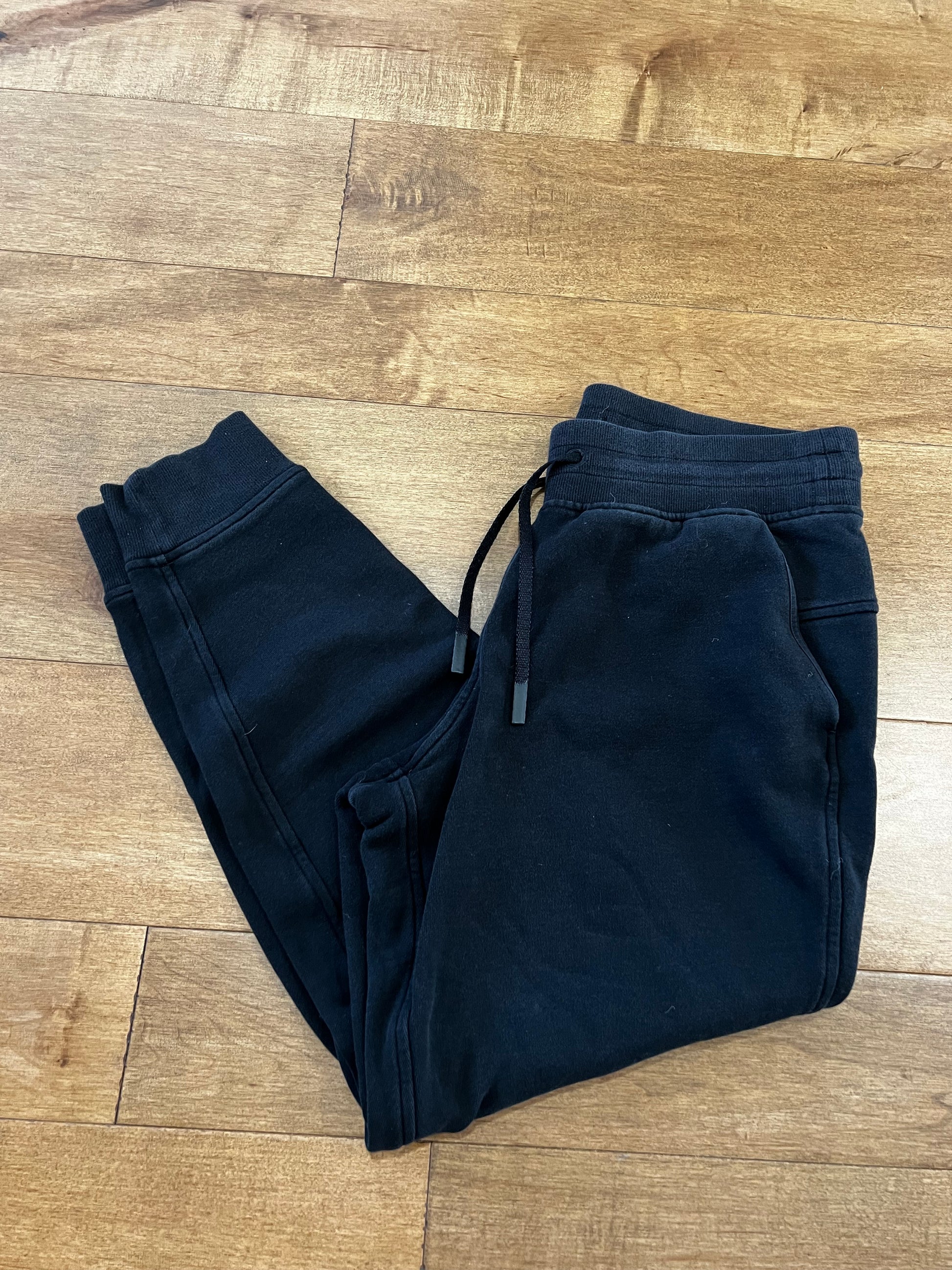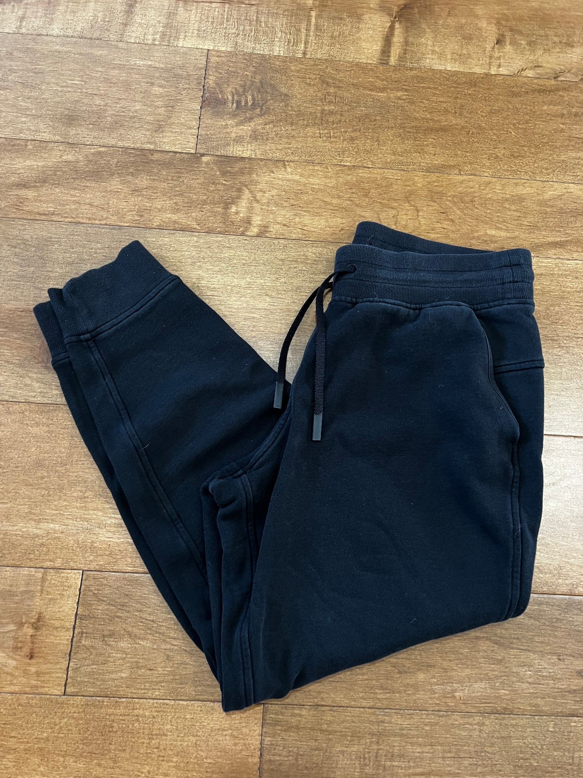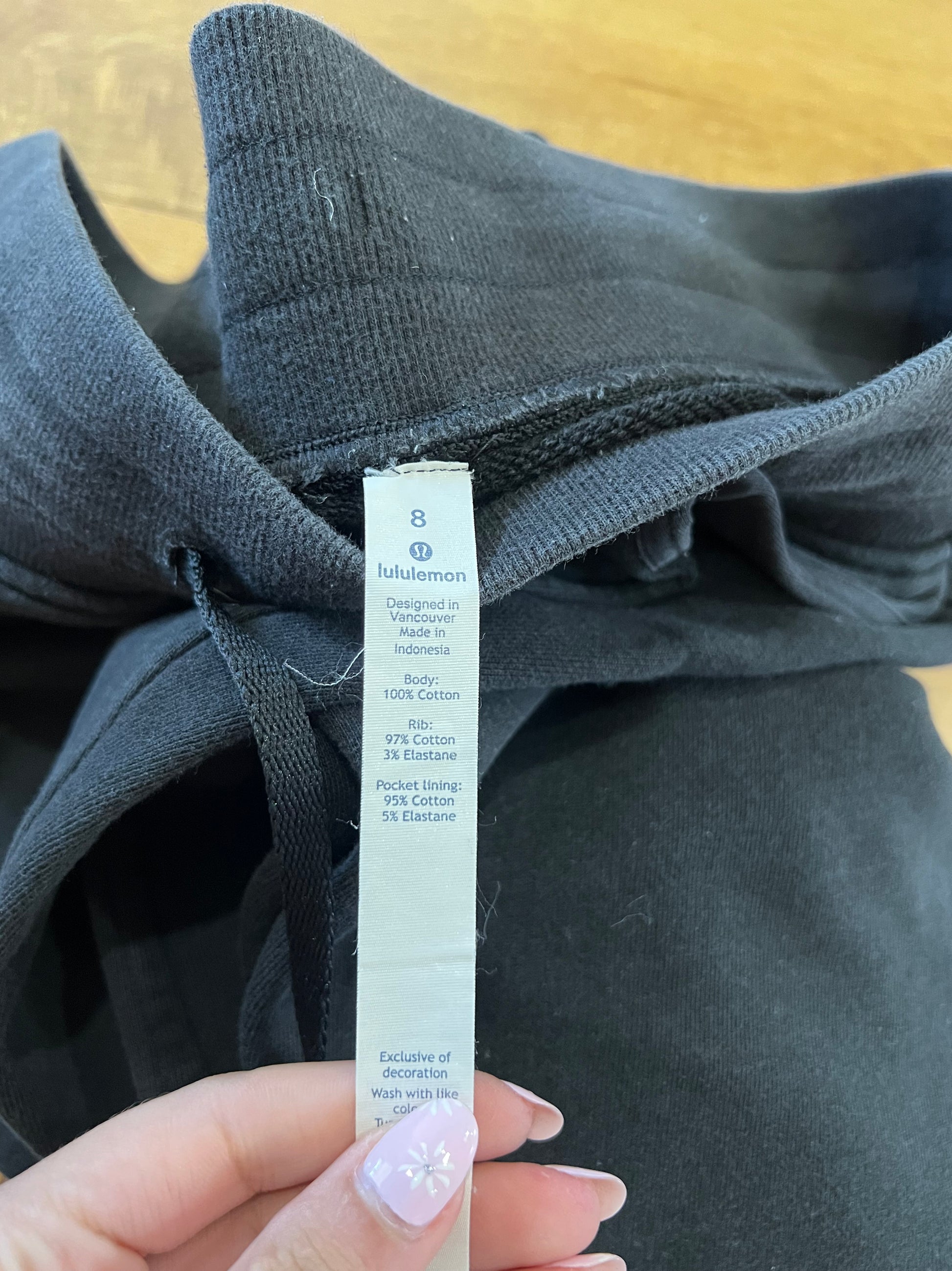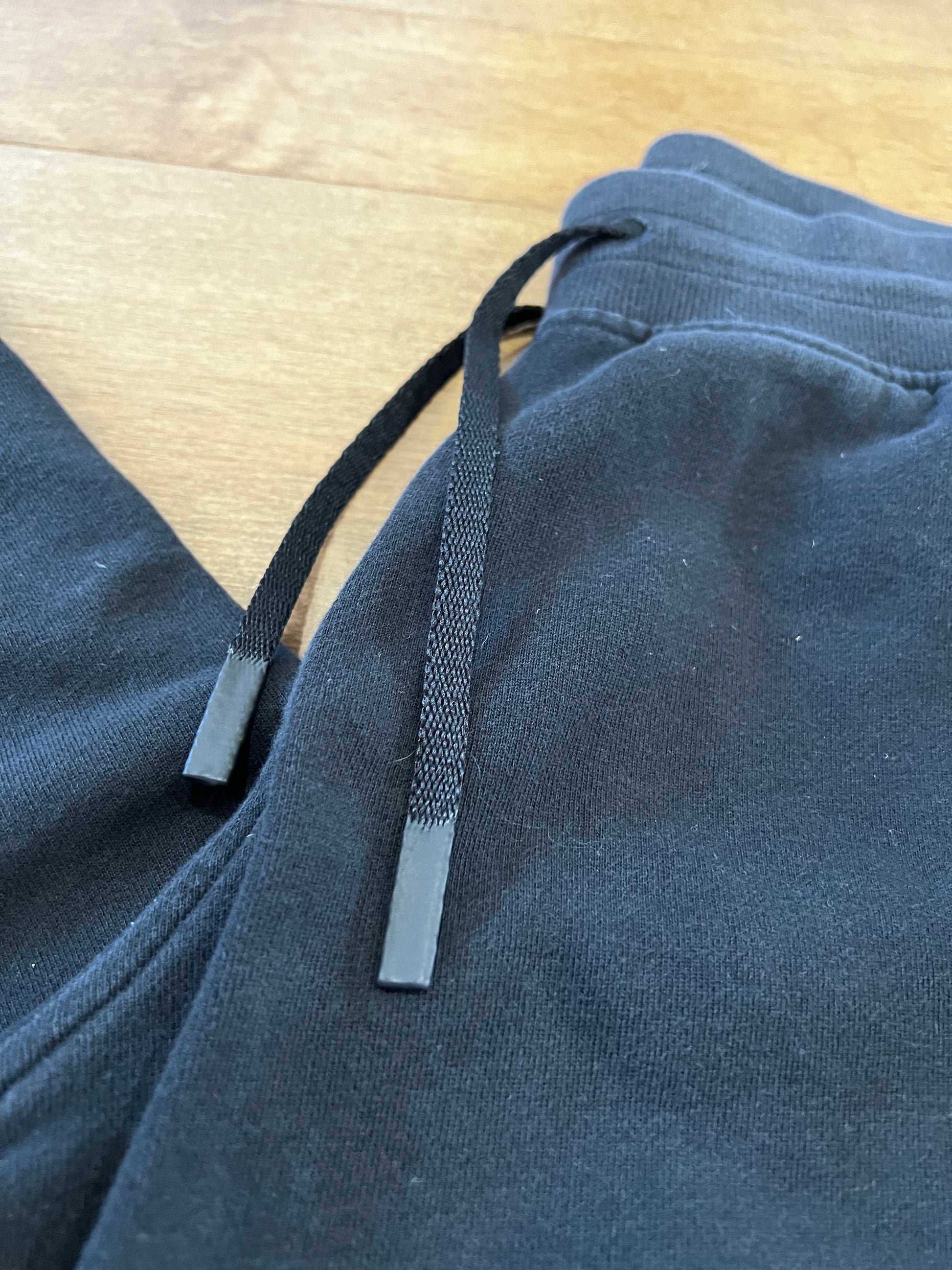 No flaws! I am unsure if these are the Warm Down or the Scuba Joggers but they are a thick cotton material, perfect for the Fall/Winter. 28inch inseam. Jelly logo.