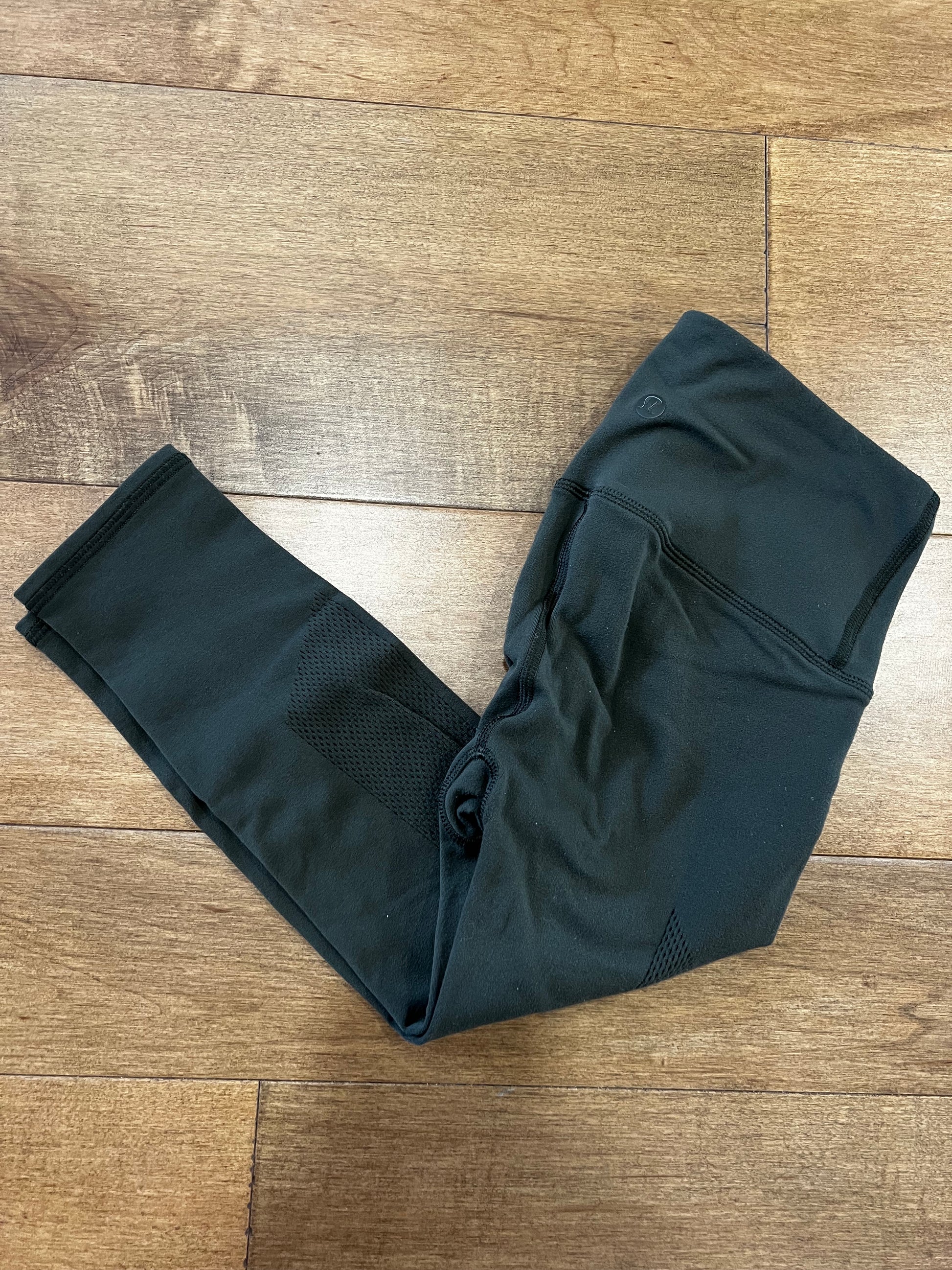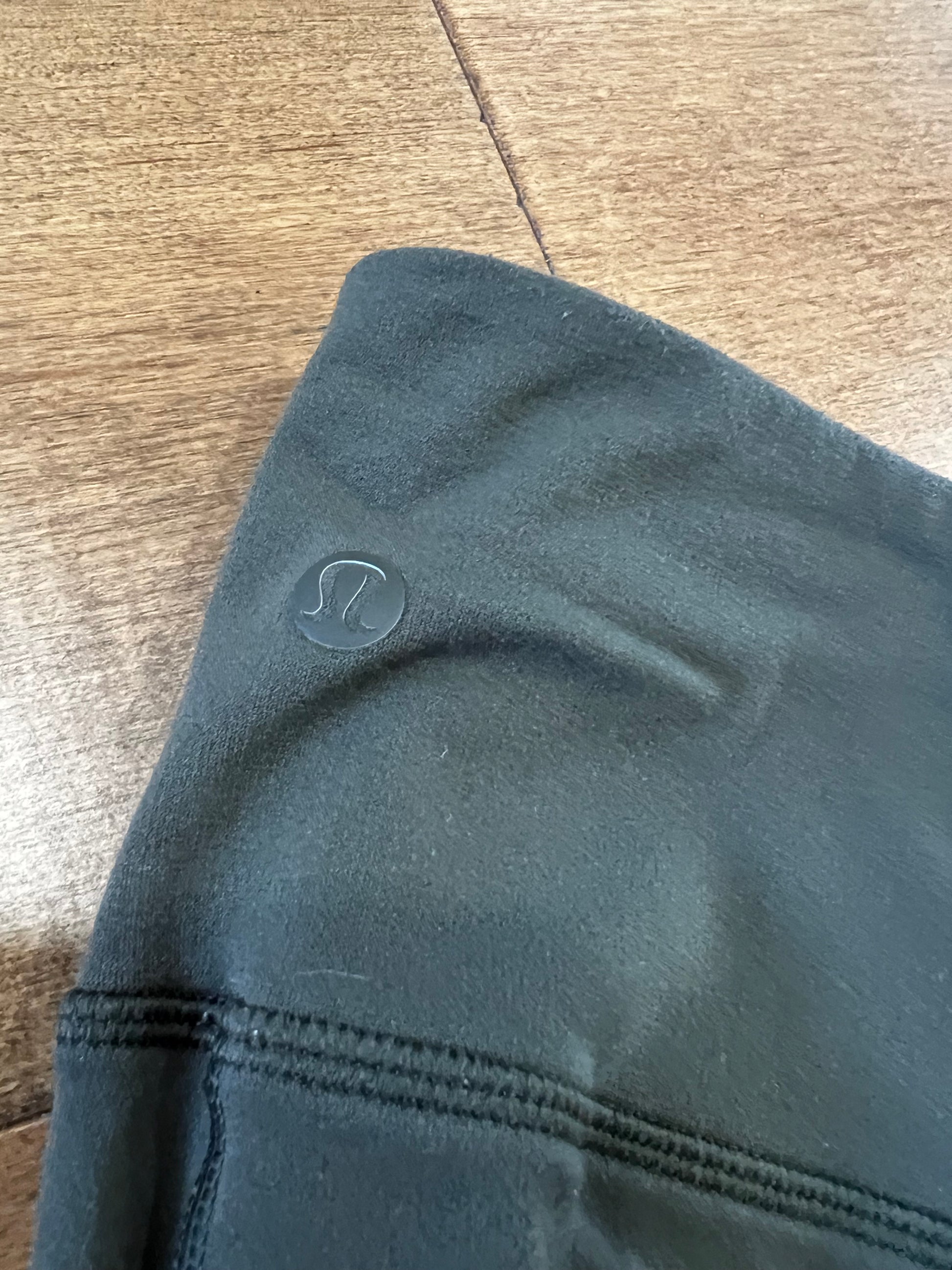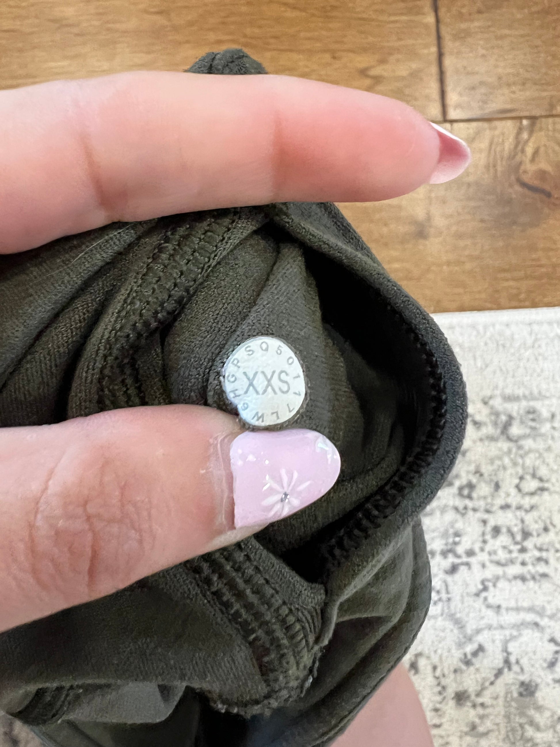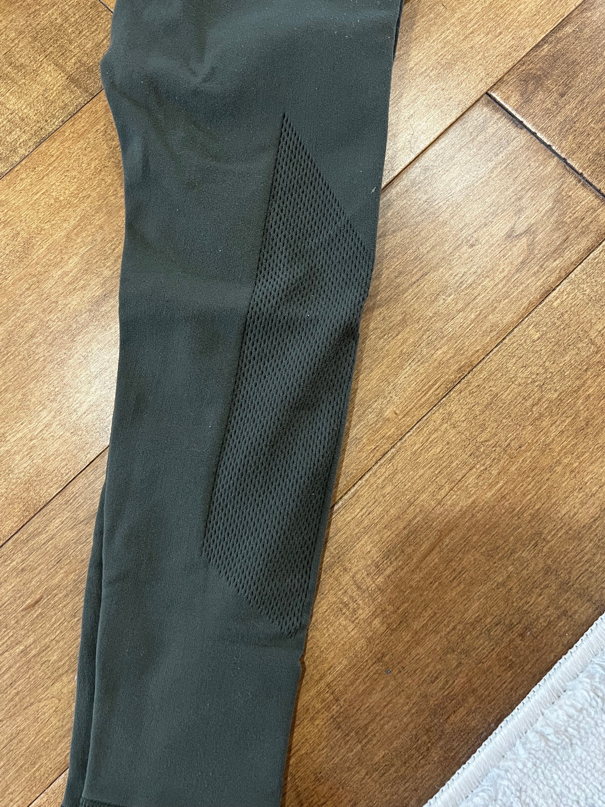 No flaws! Dark Olive is the color. Capri length. Has mesh at bottom that makes them really breathable.