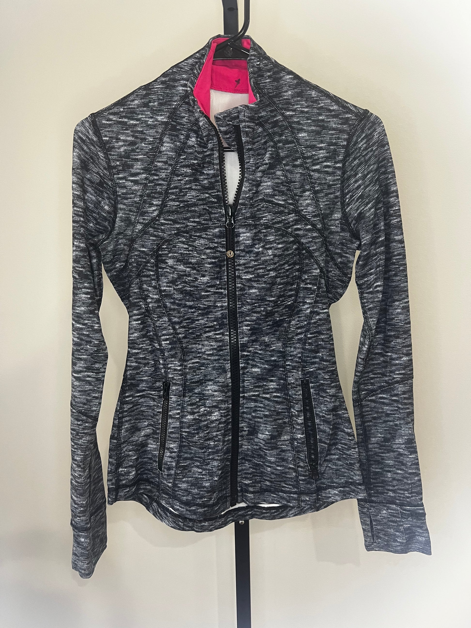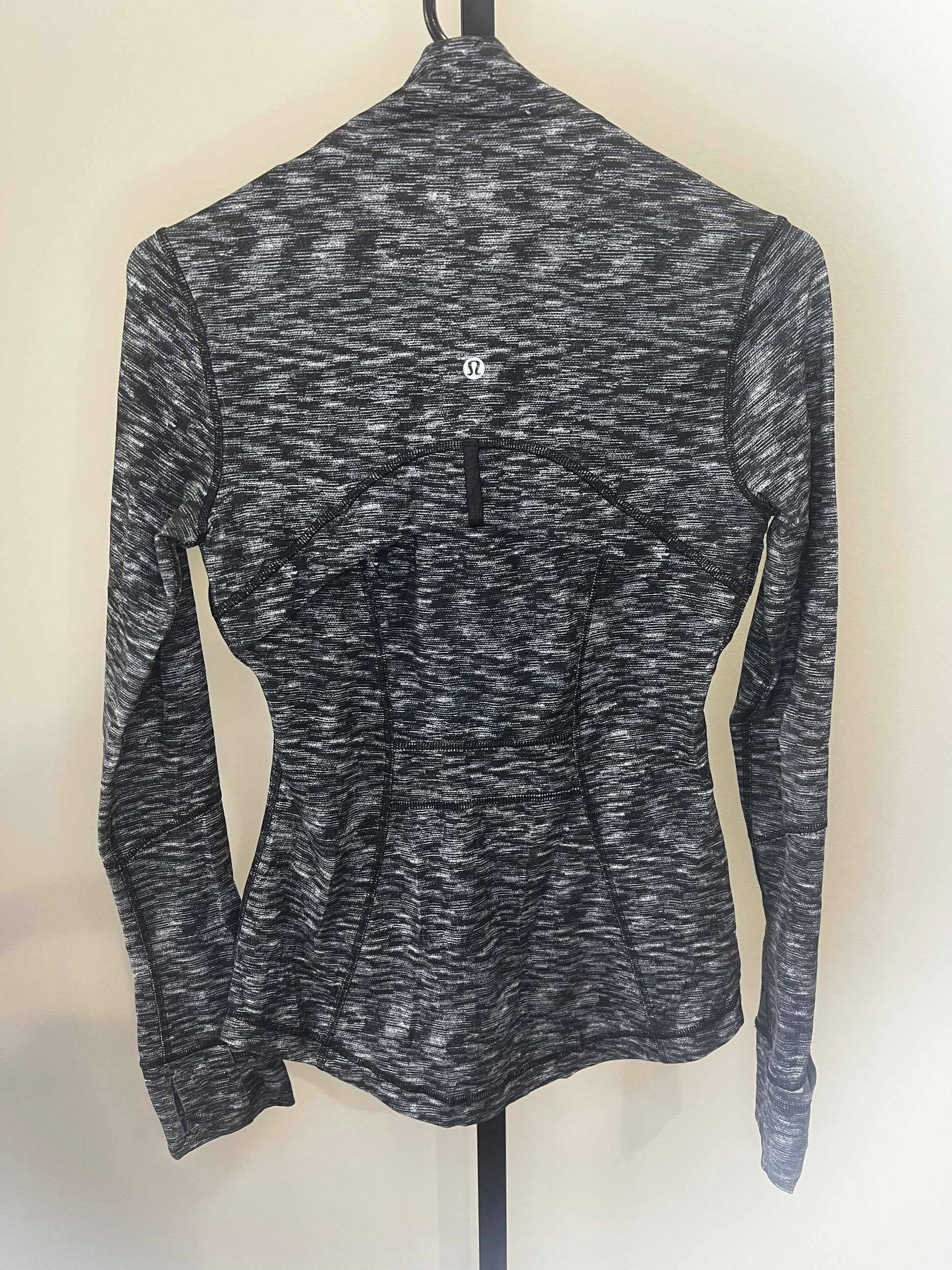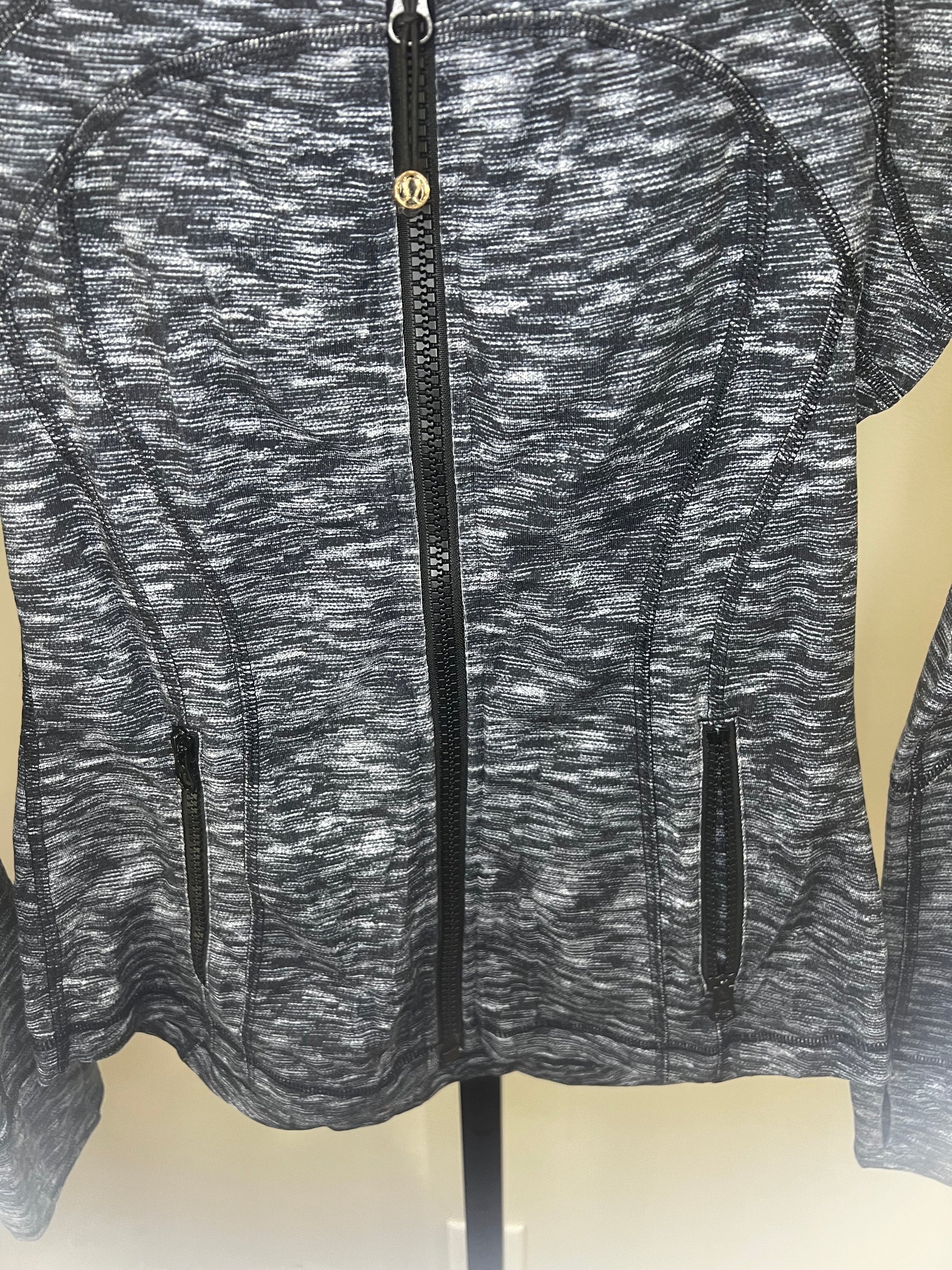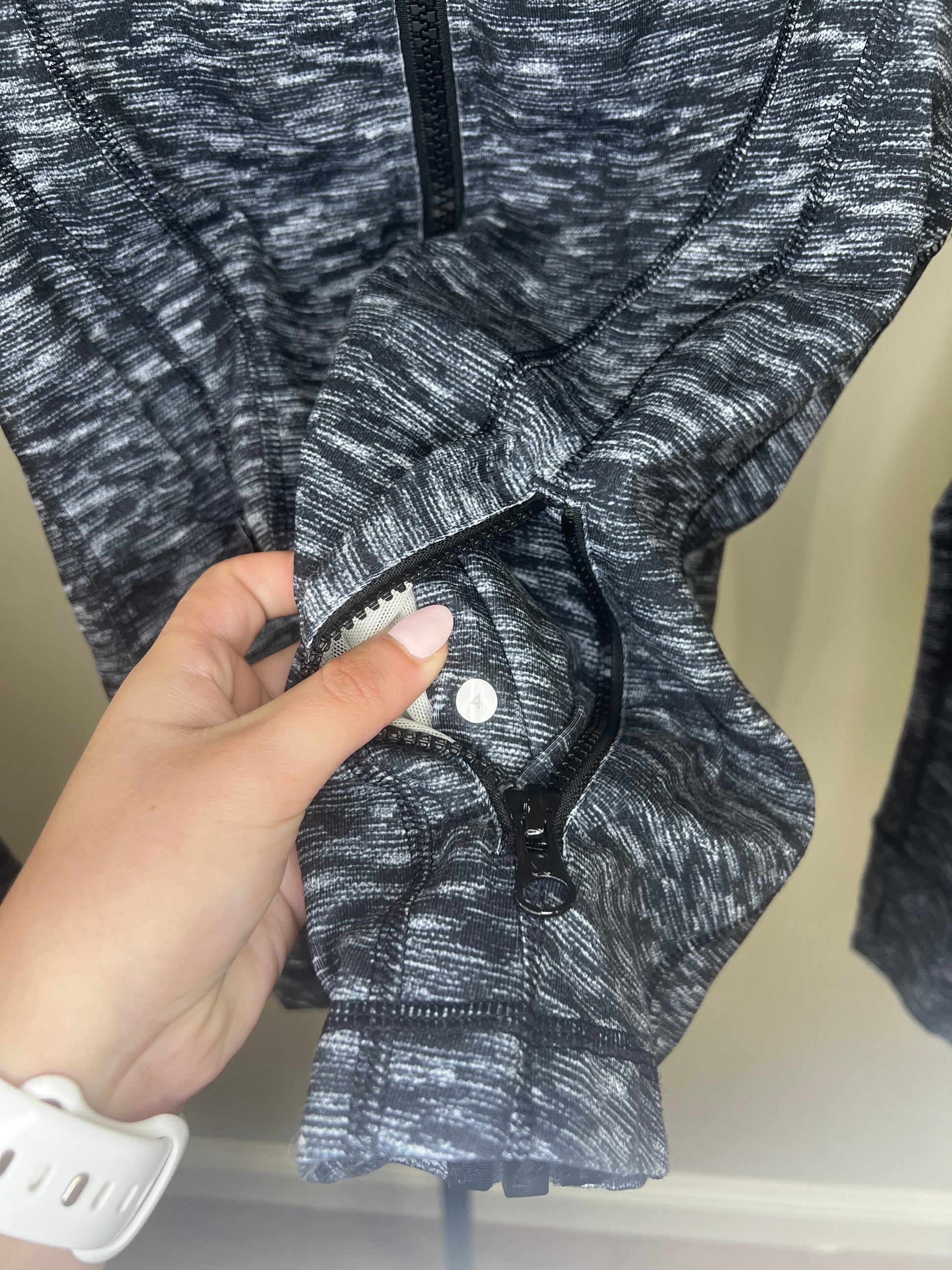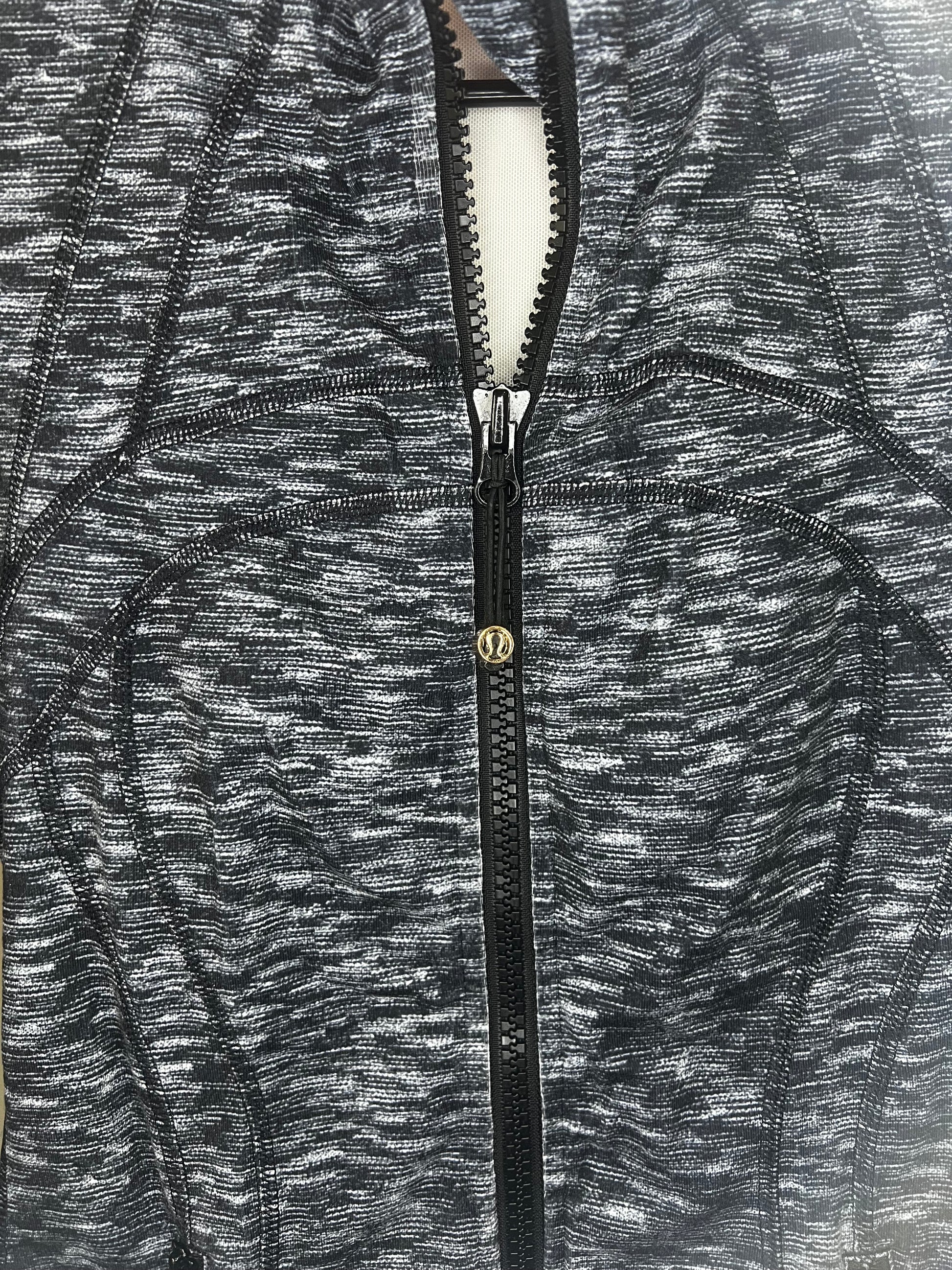 Zipper pockets on sides, emergency hair tie still attached. No flaws, only sign of wear is on the zipper (shown in last picture). Full length. Thumb holes on sleeves.
