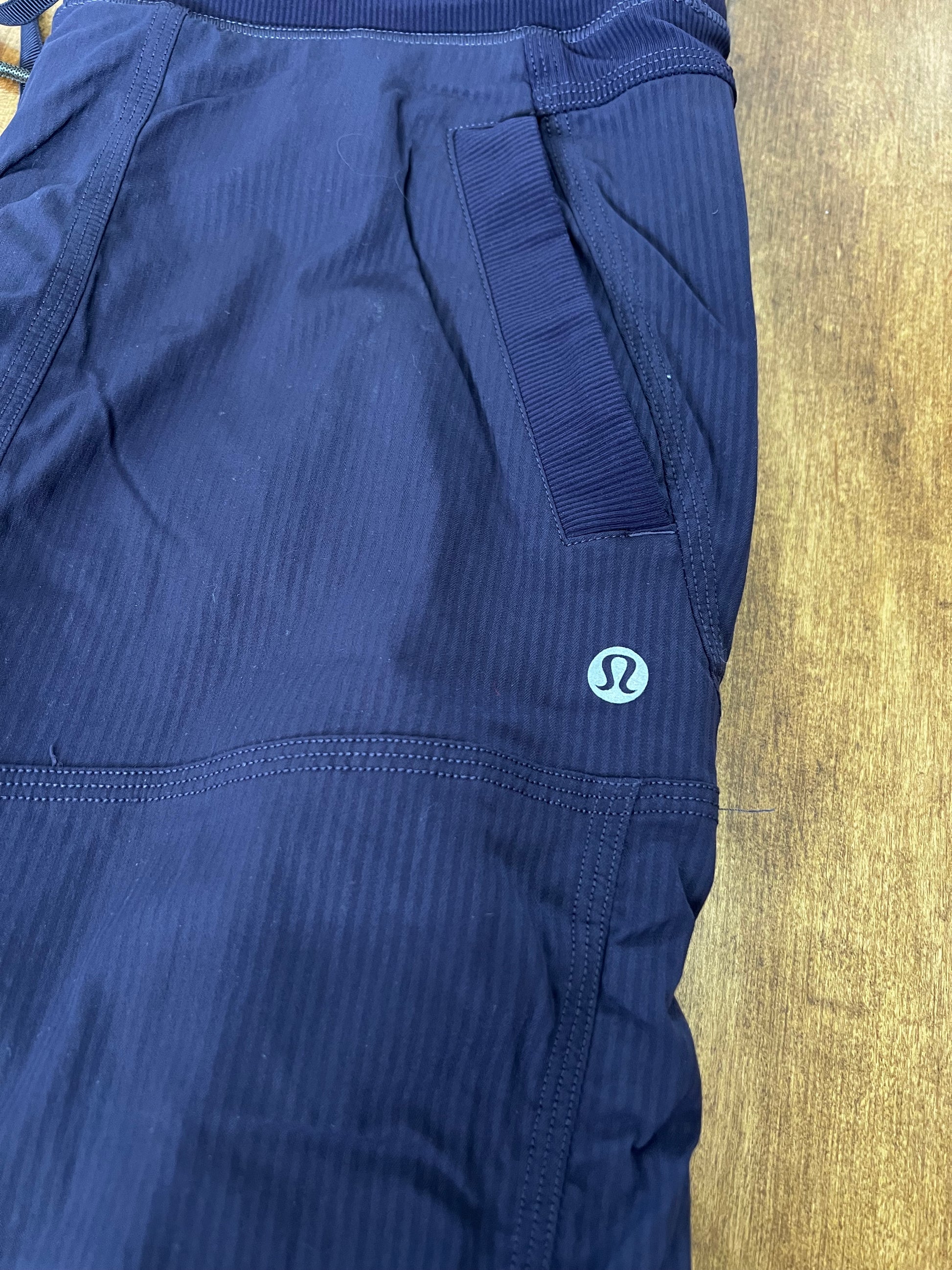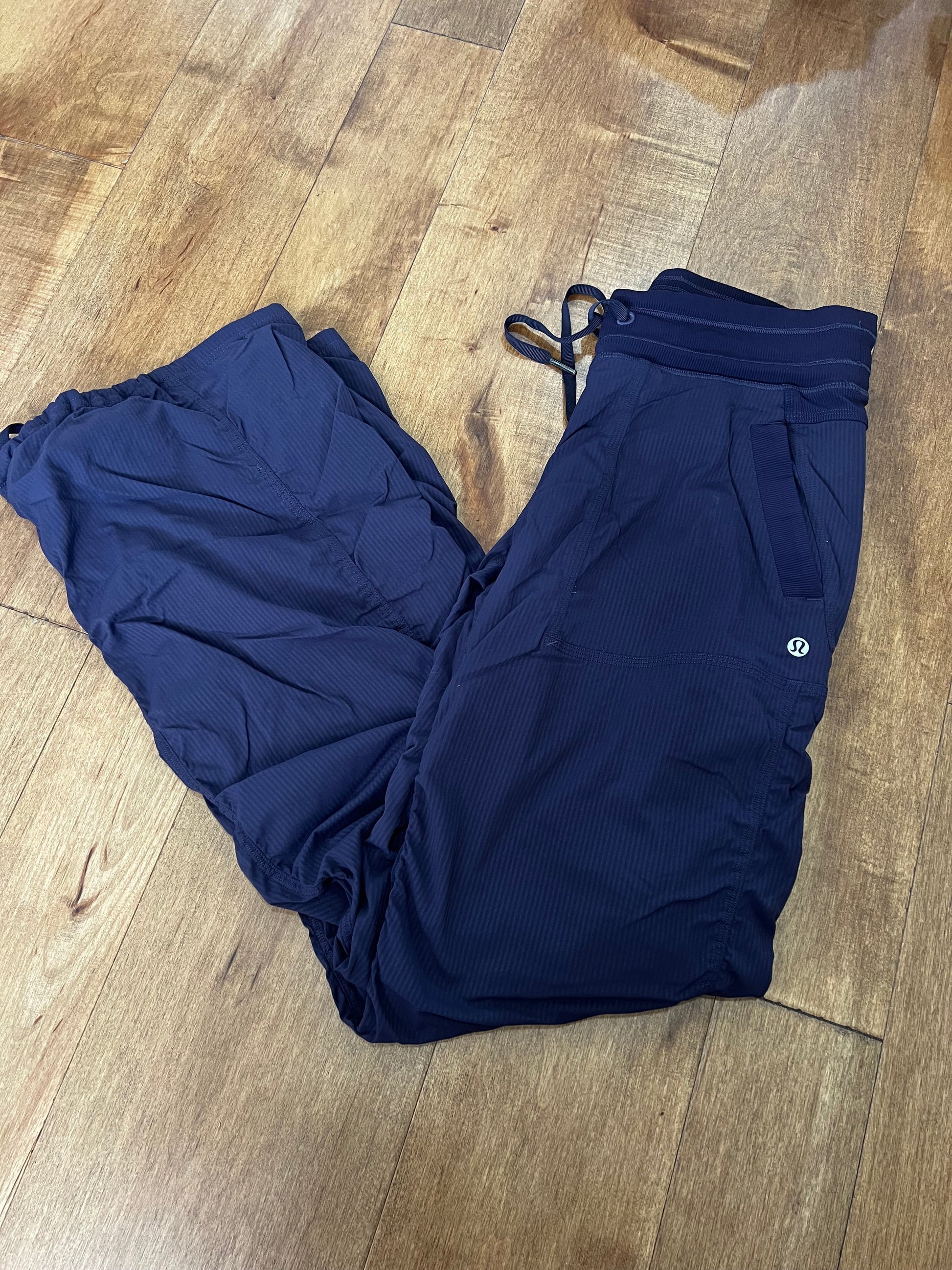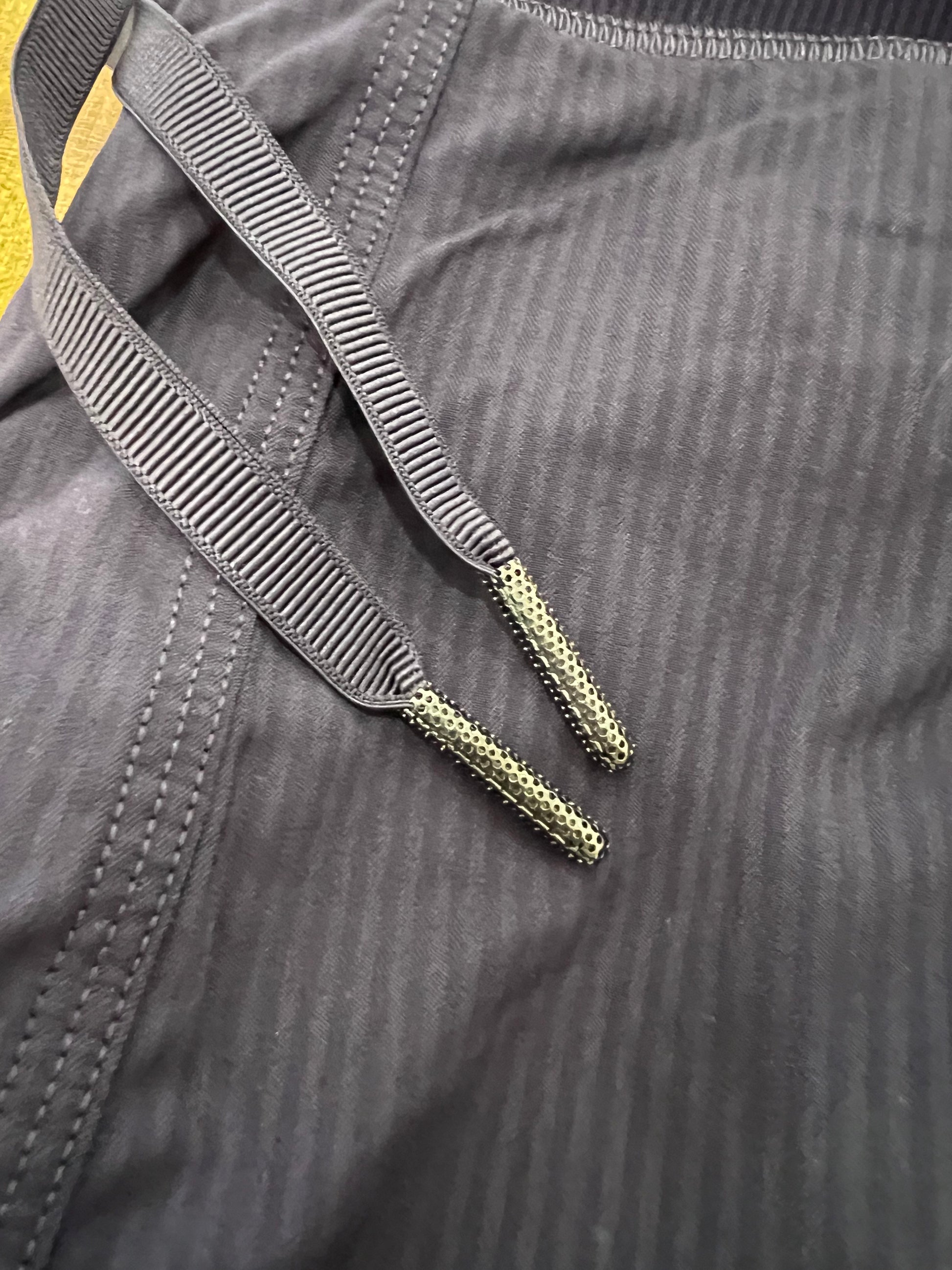 No flaws! These are in amazing condition. The bottoms can be left as wide leg or cinched in for more of a jogger look. Drawstrings at the waist. Even when they go on sale, they only drop to about $80... This is such a steal!