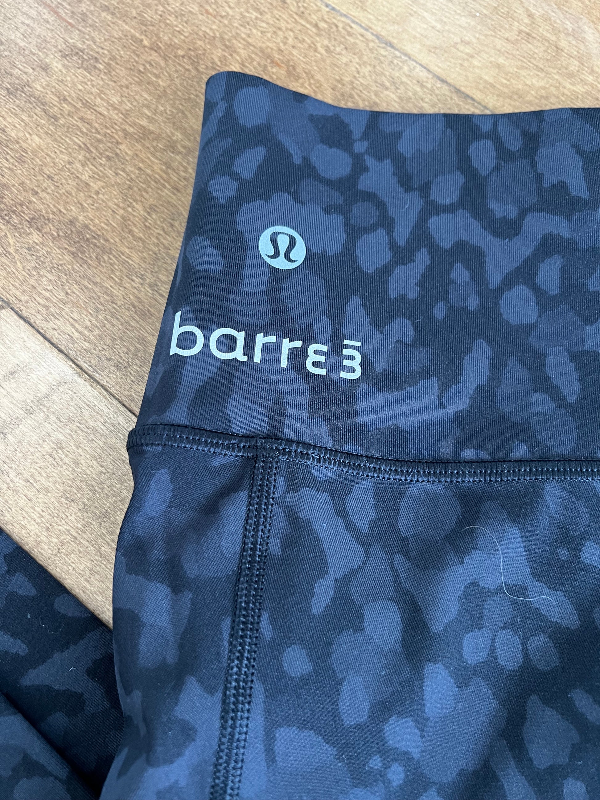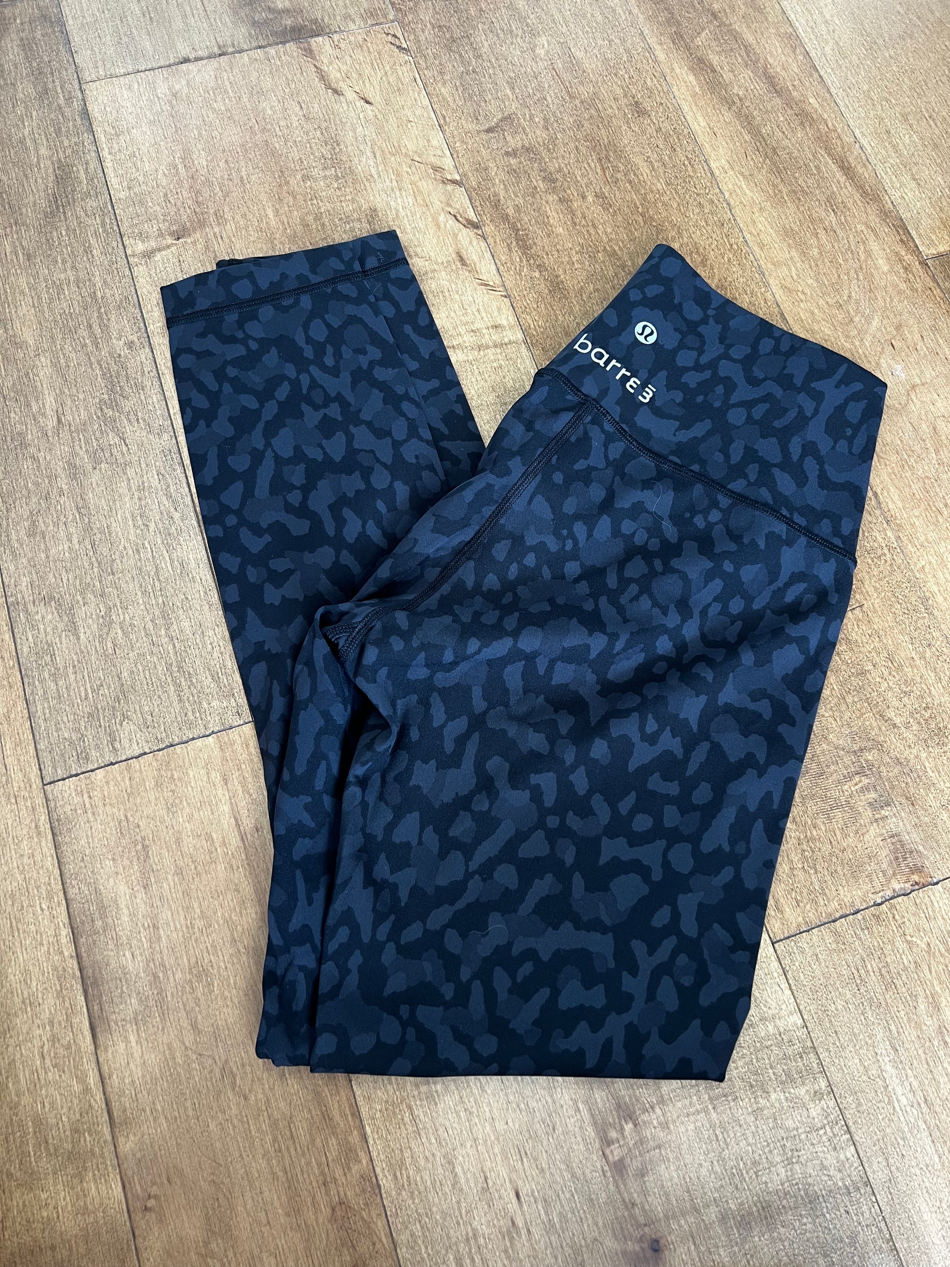 This was a collab between Barre and Lulu. They are highwaisted with black camo print throughout. In new condition. No flaws!