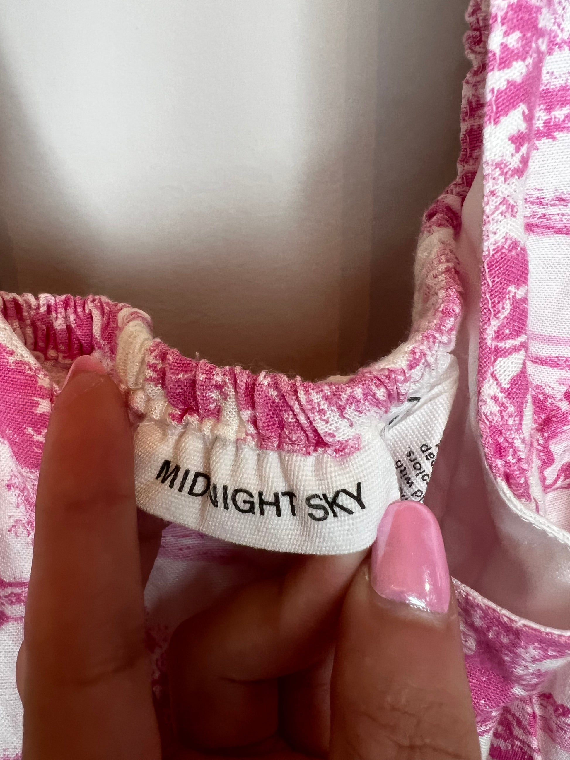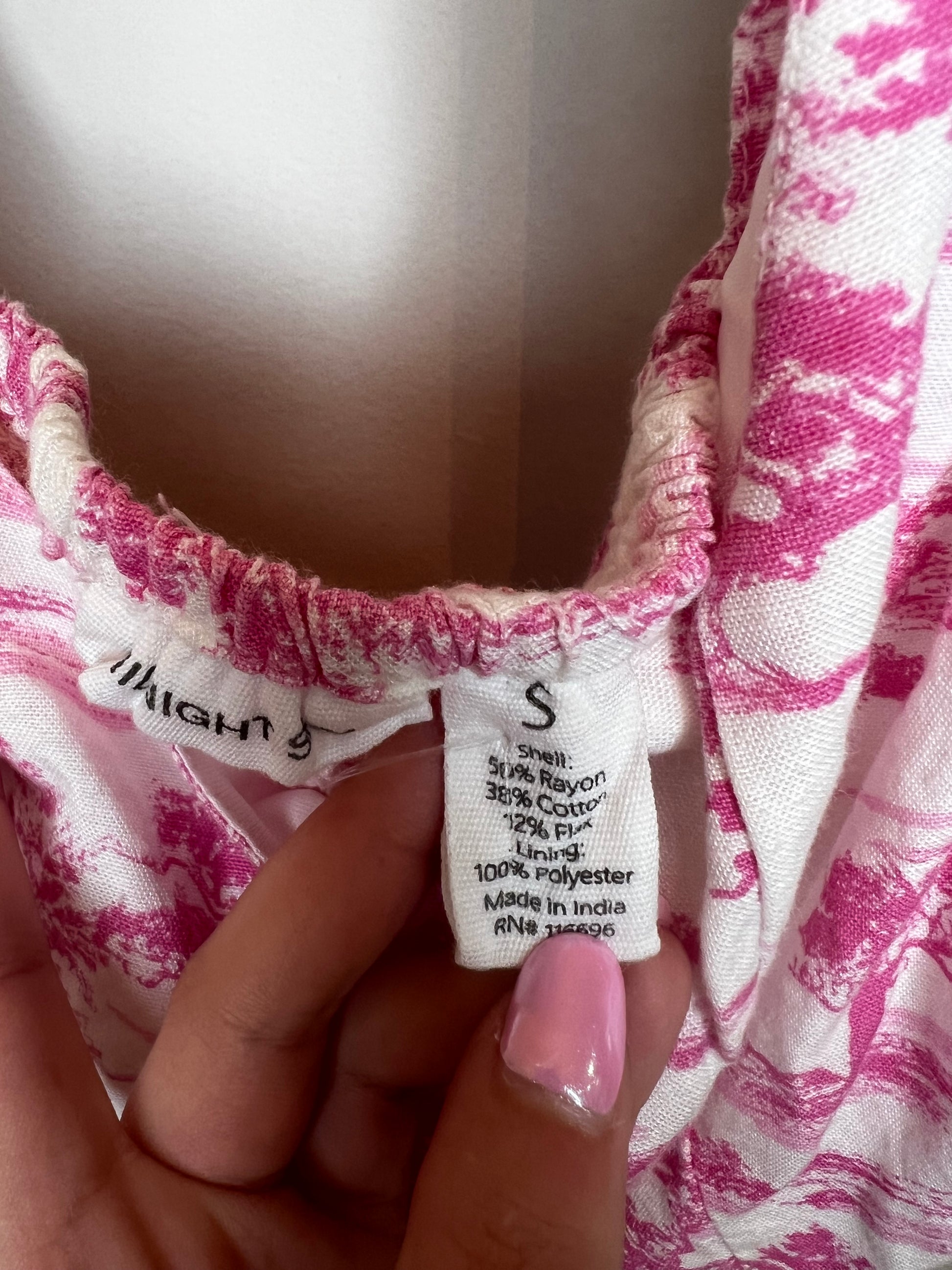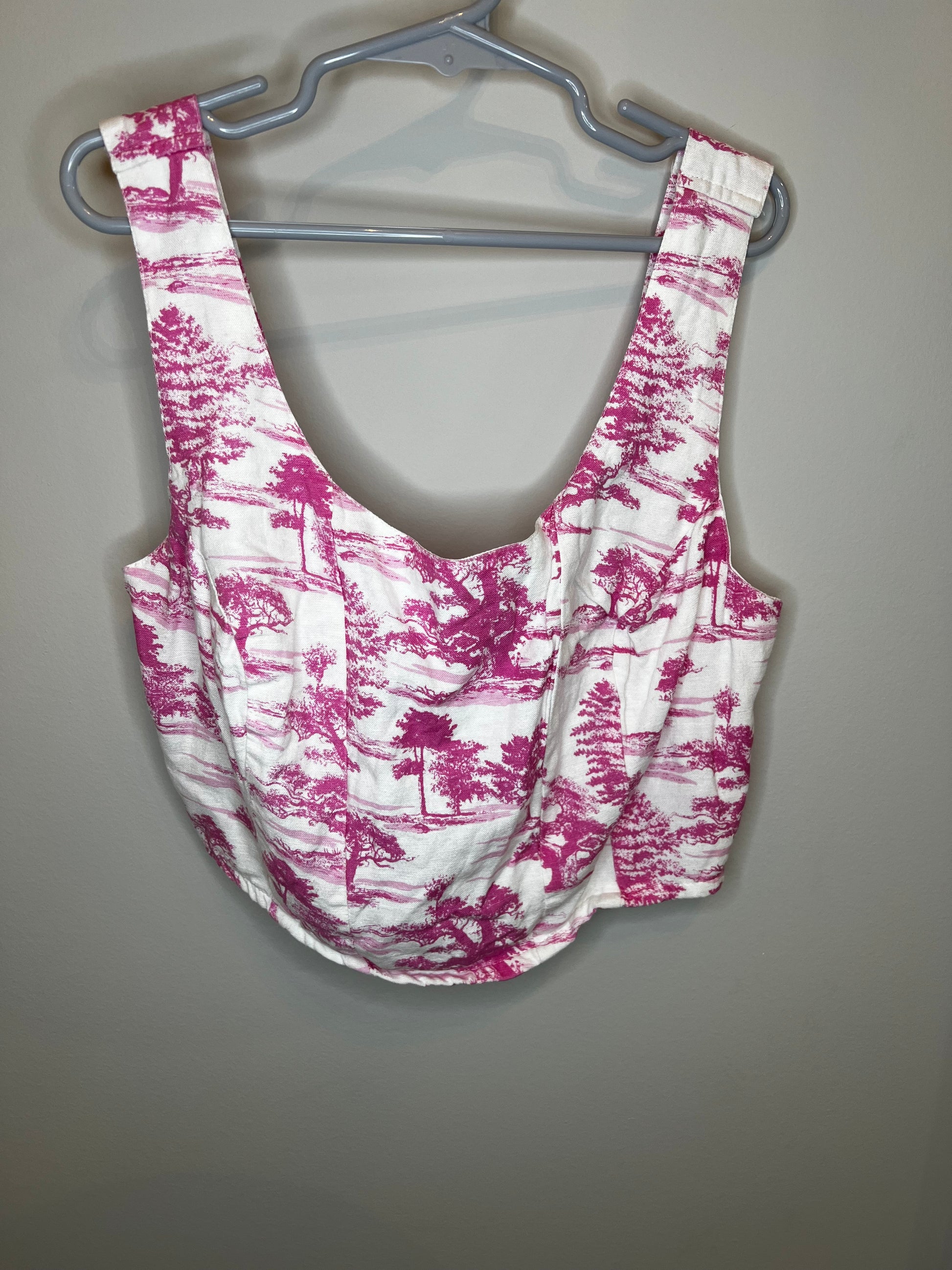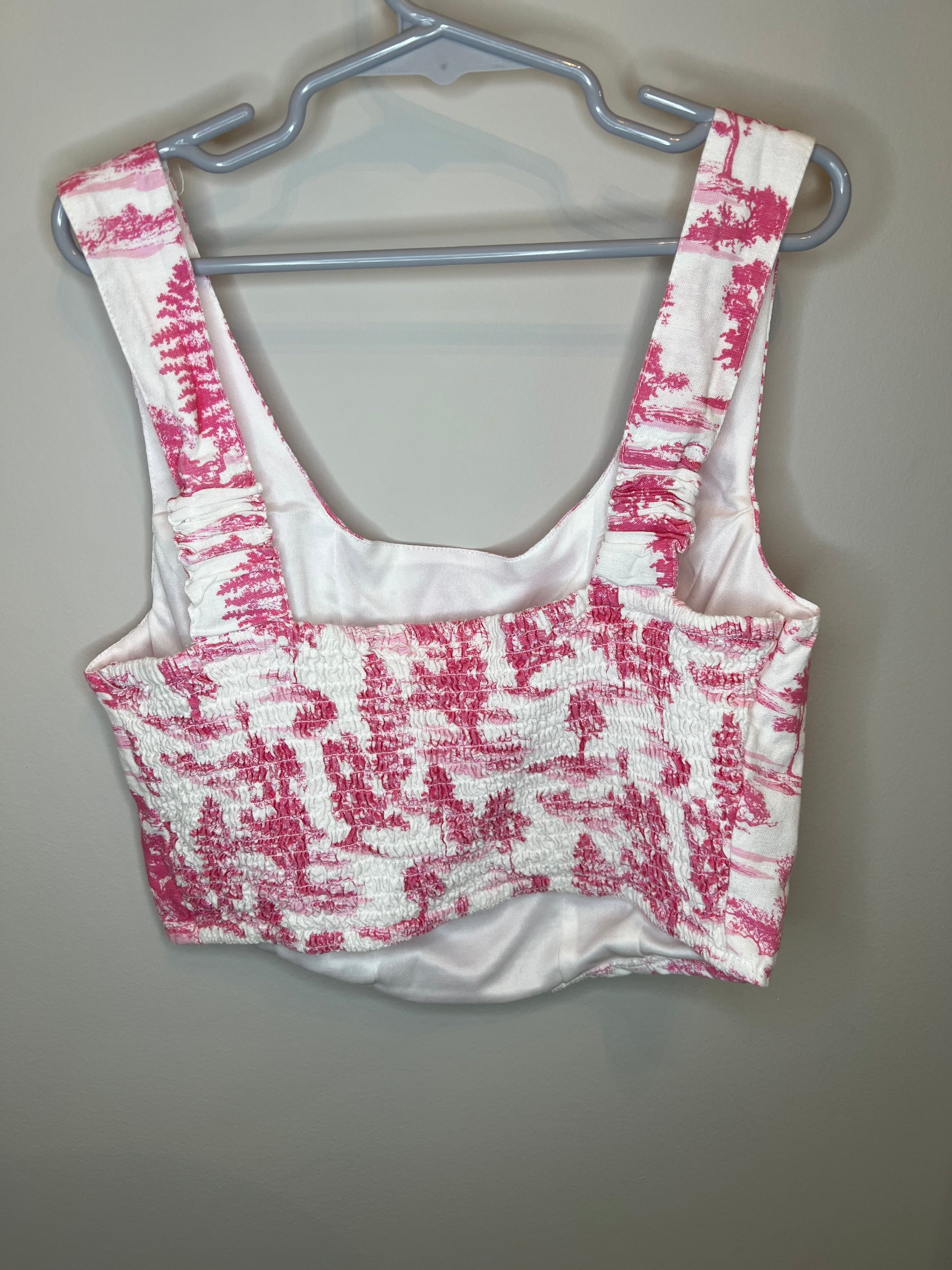 Cropped. Smocked back (very stretchy). No flaws! The most pretty pink!