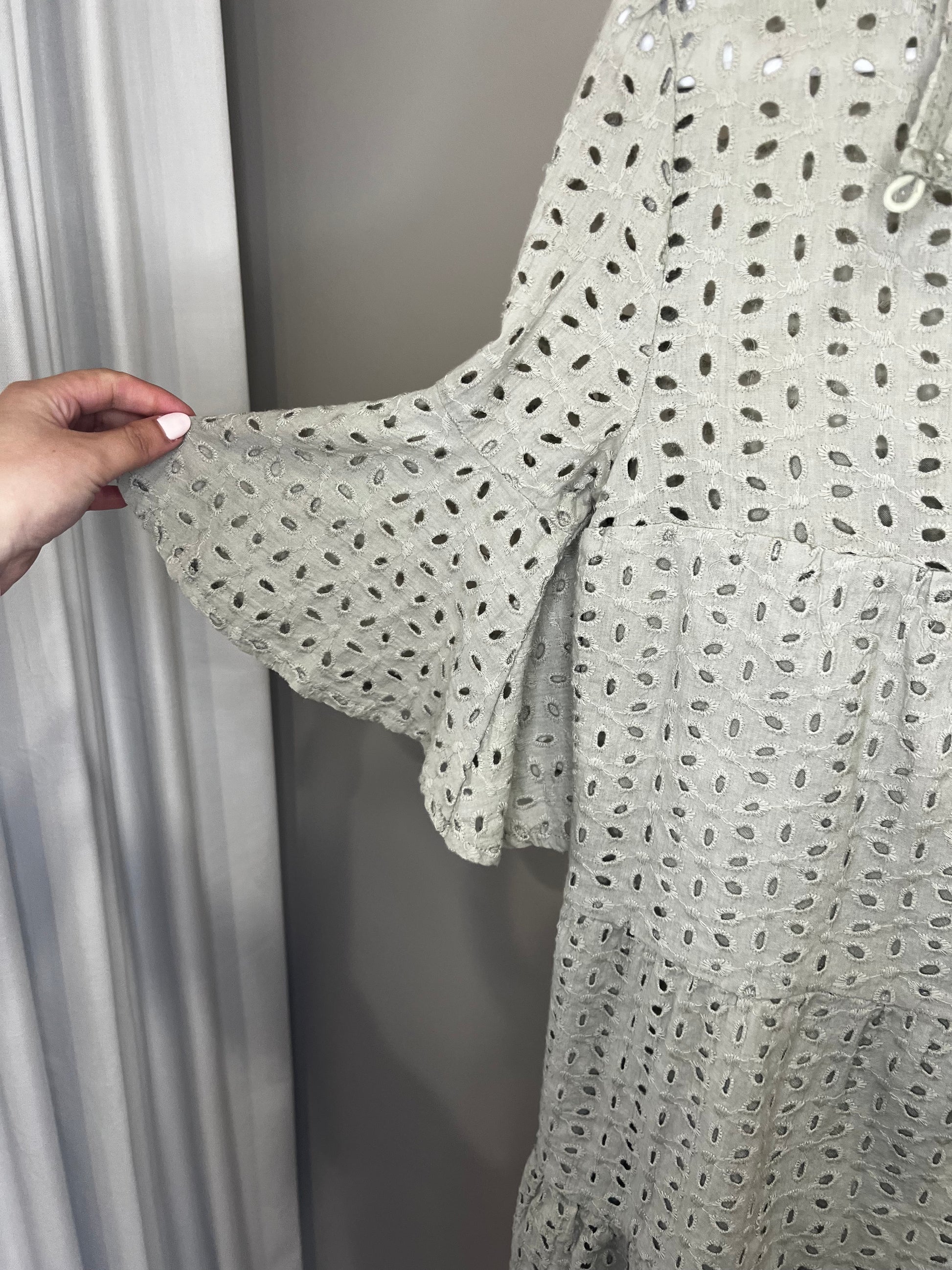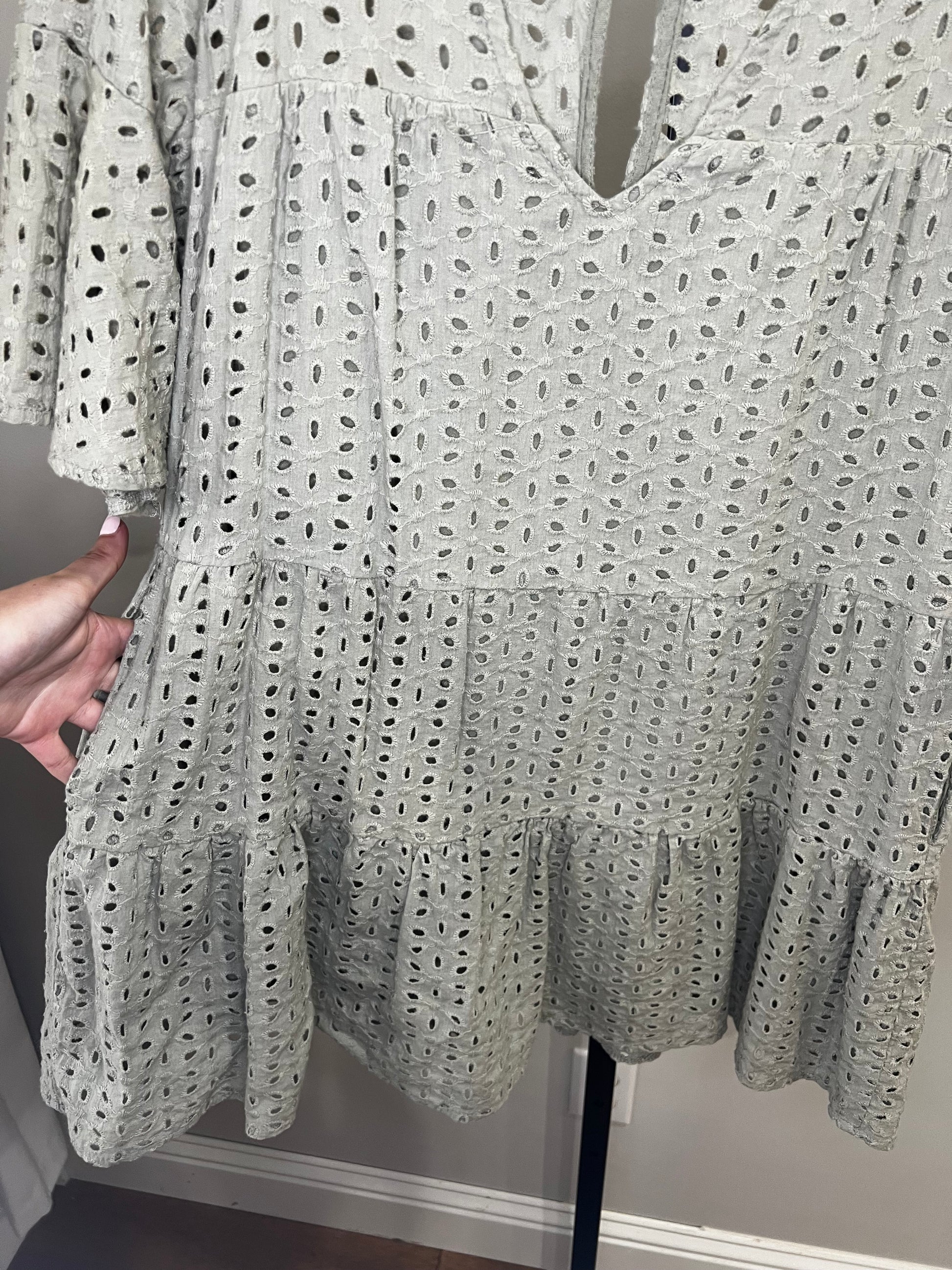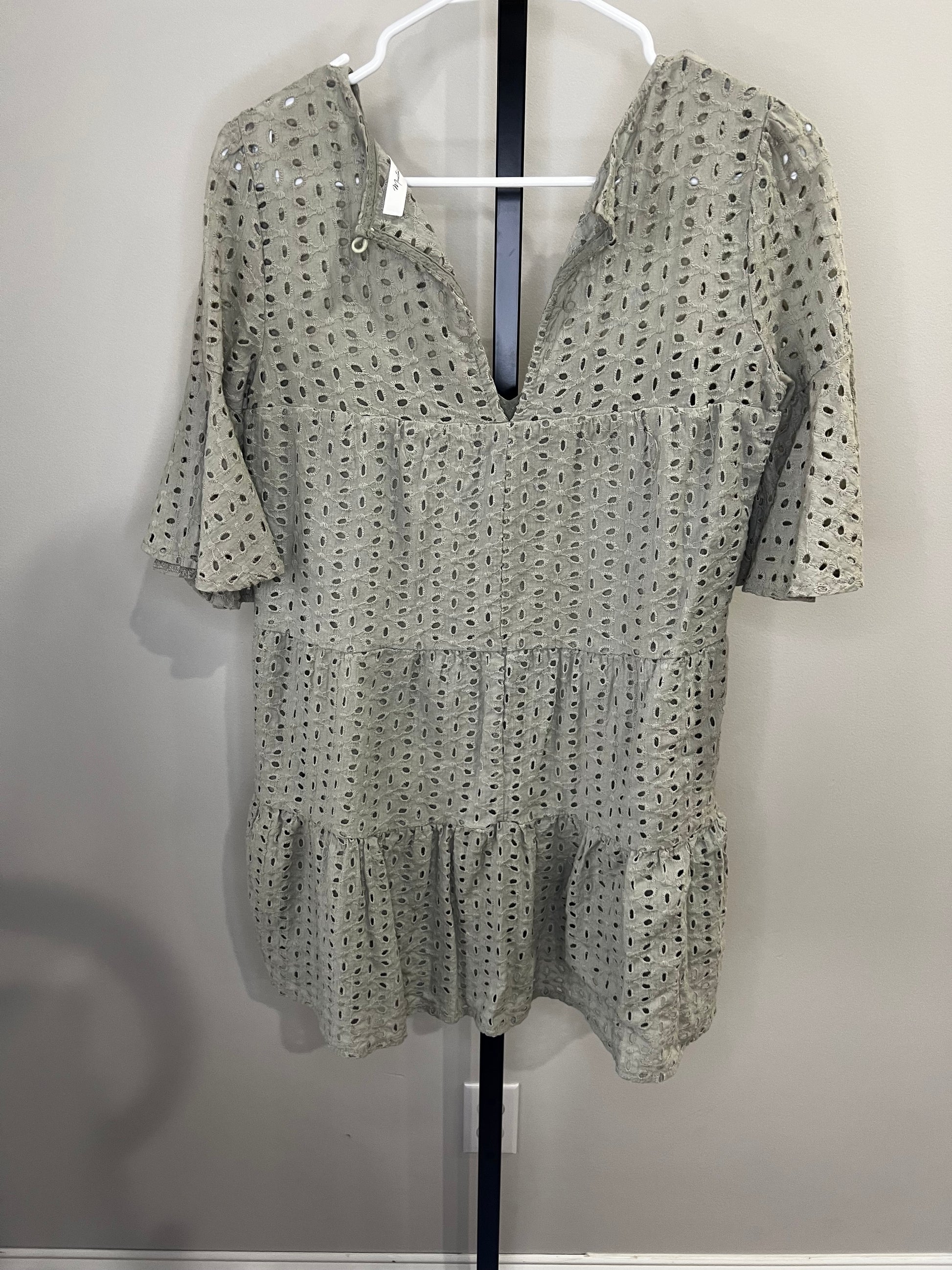 Muted olive green color with the prettiest eyelet lace throughout. Tiered bottom with ruffle sleeves and double lined. No flaws!