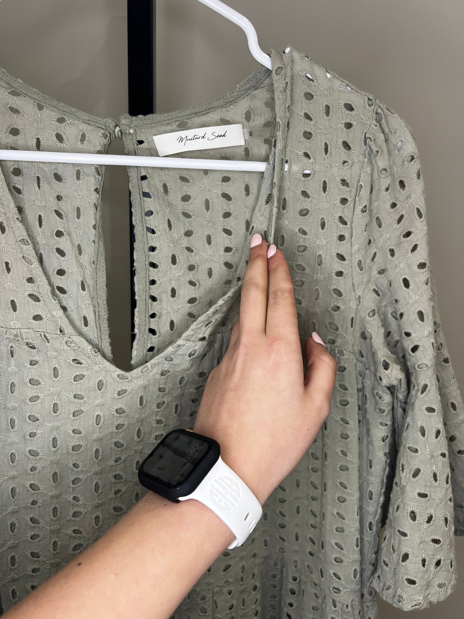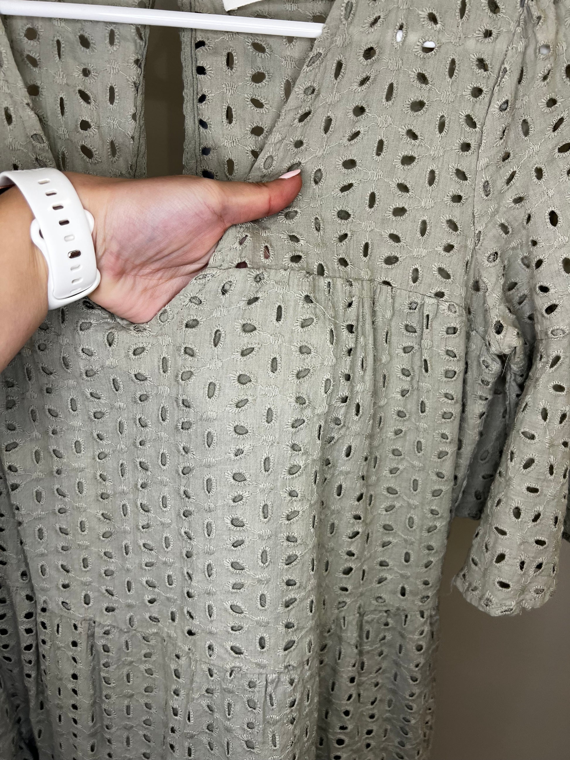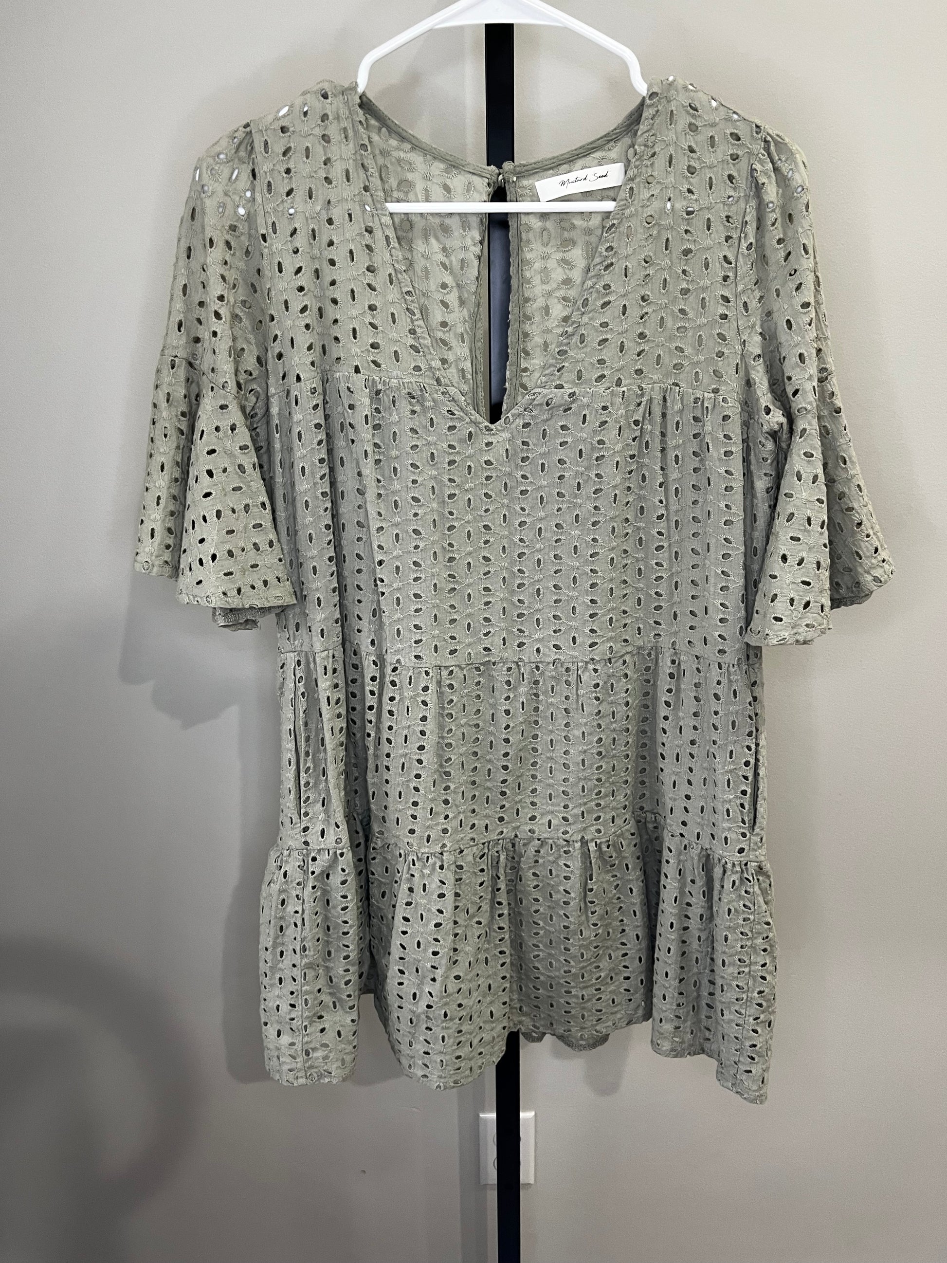 Muted olive green color with the prettiest eyelet lace throughout. Tiered bottom with ruffle sleeves and double lined. No flaws!