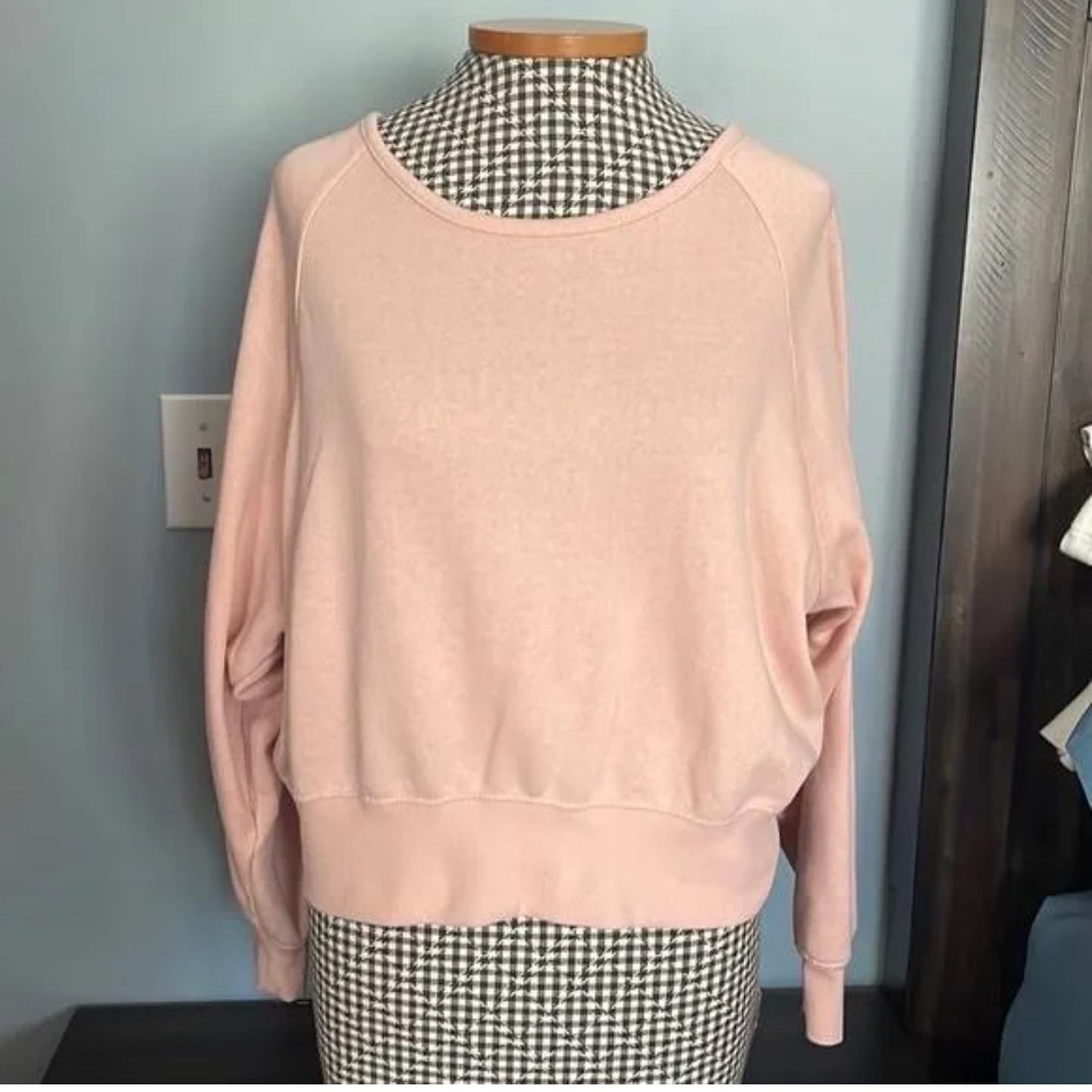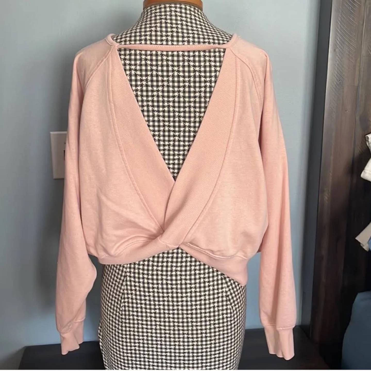 This is a beautiful baby pink crewneck material. The open back detail is so cute to show off some skin or showcase a cute bra/bralette.