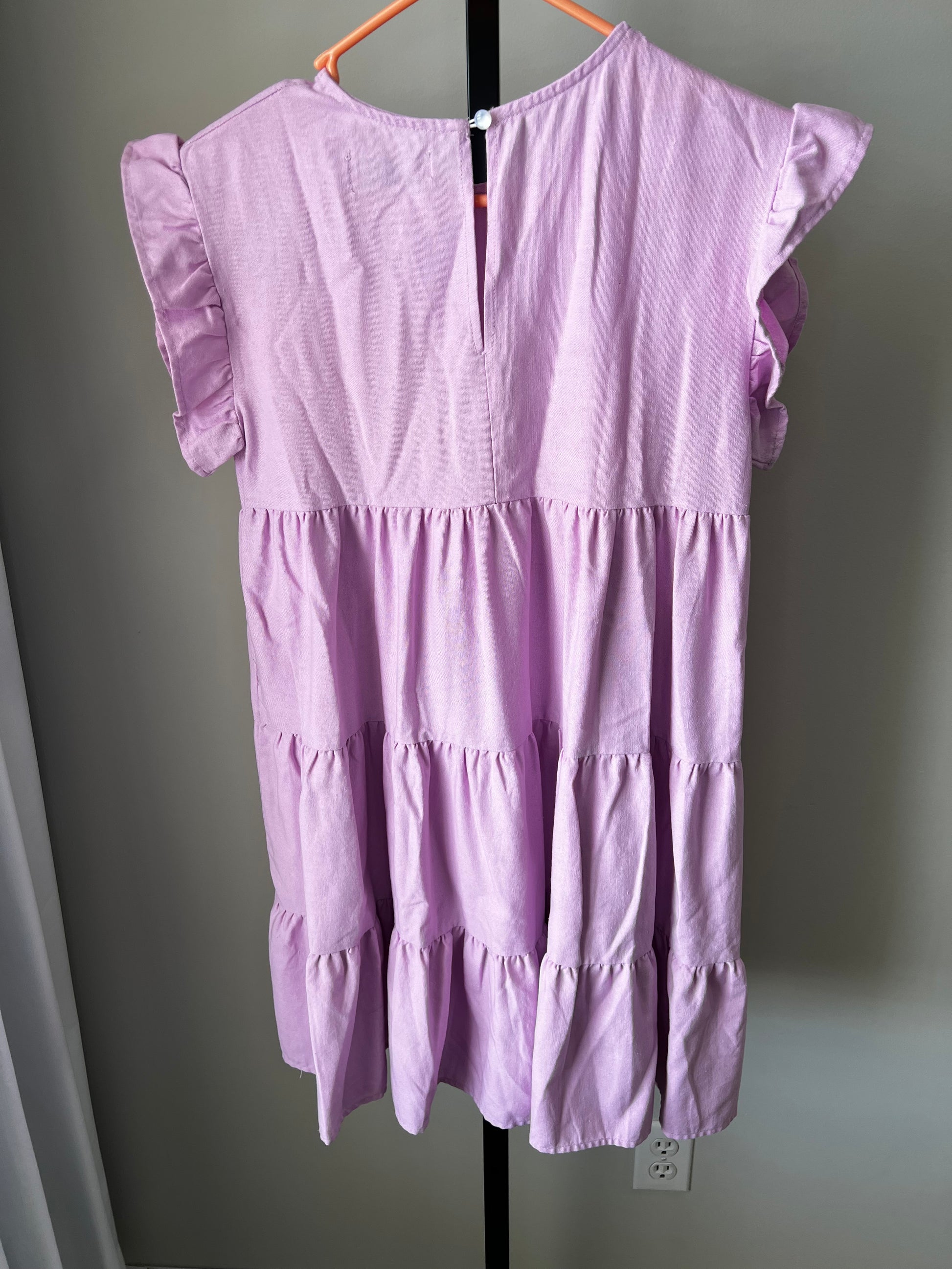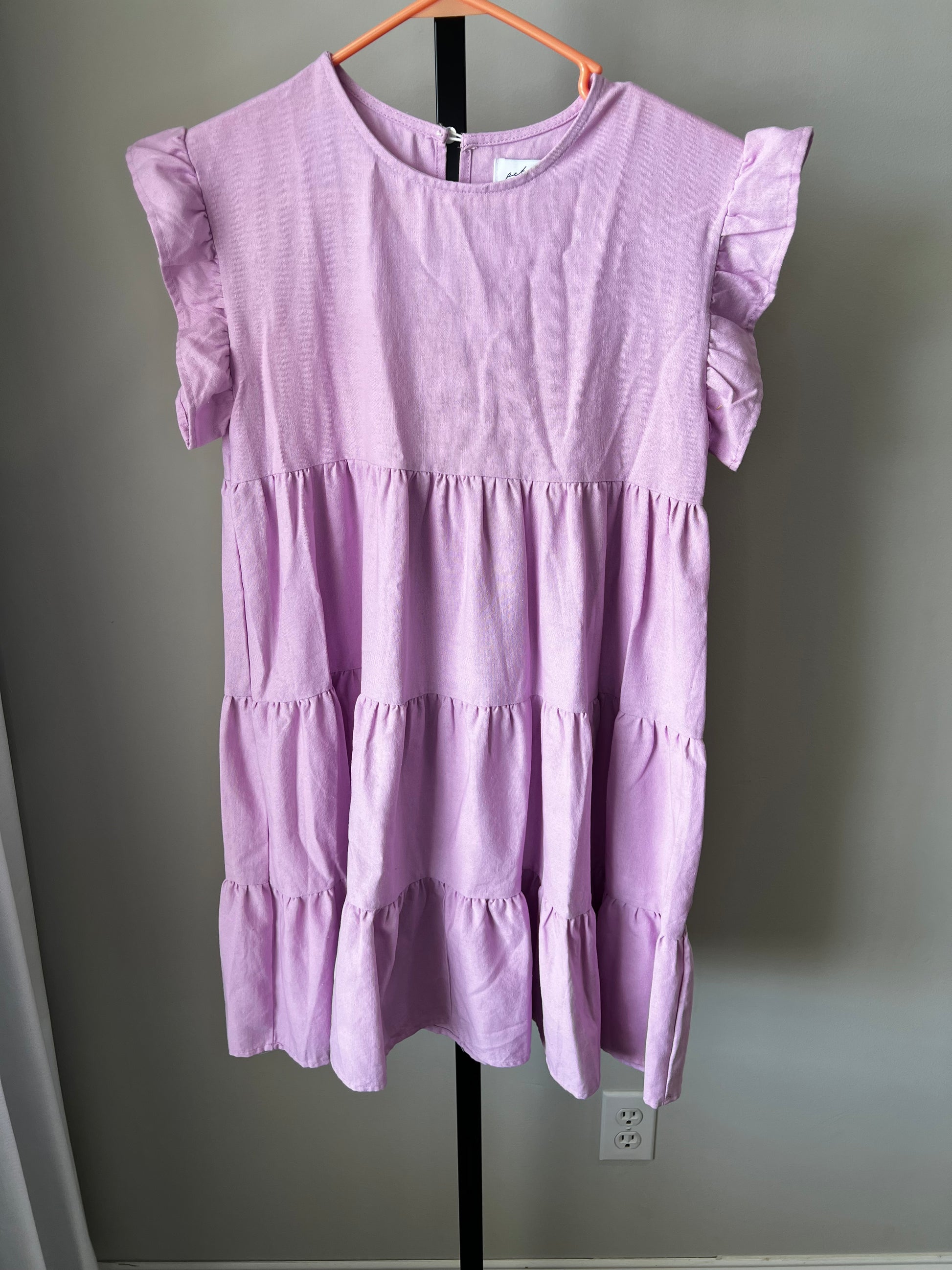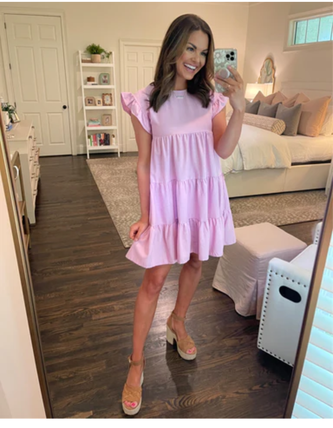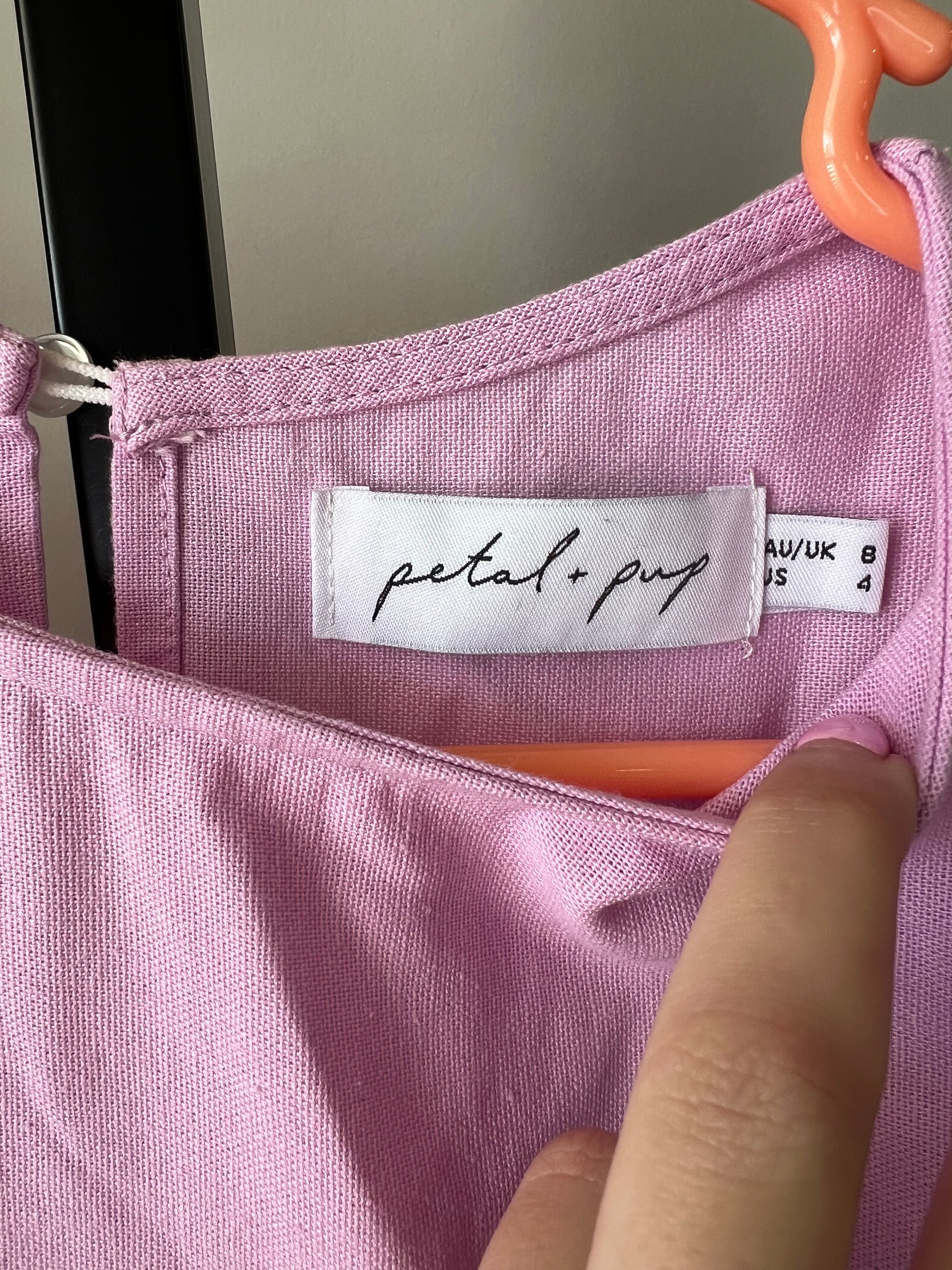 The prettiest pink for spring. This is a flowy style with a linen/cotton material. The ruffle sleeves add so much style to this. This could be styled as pictured or even so cute for a small baby bump. No flaws!