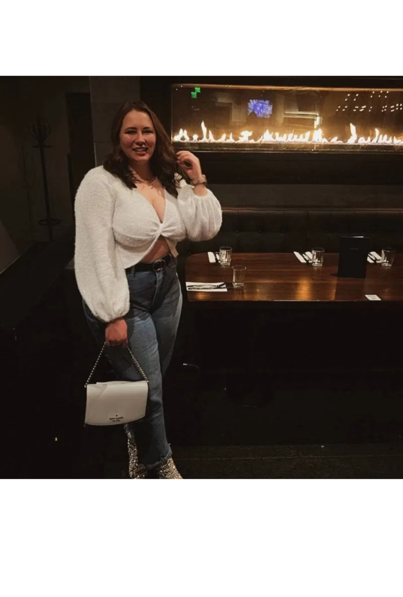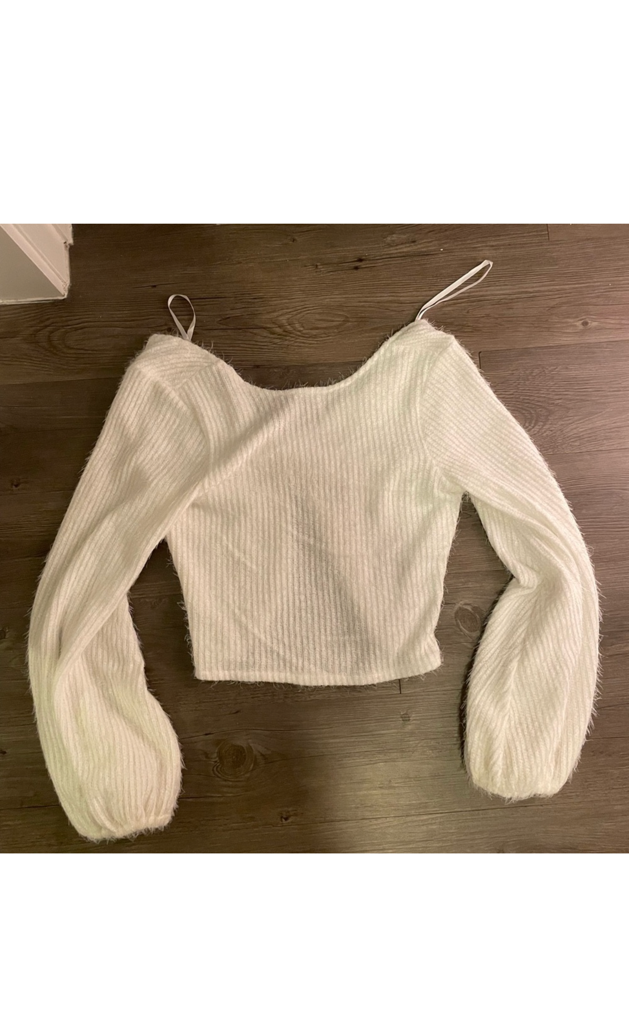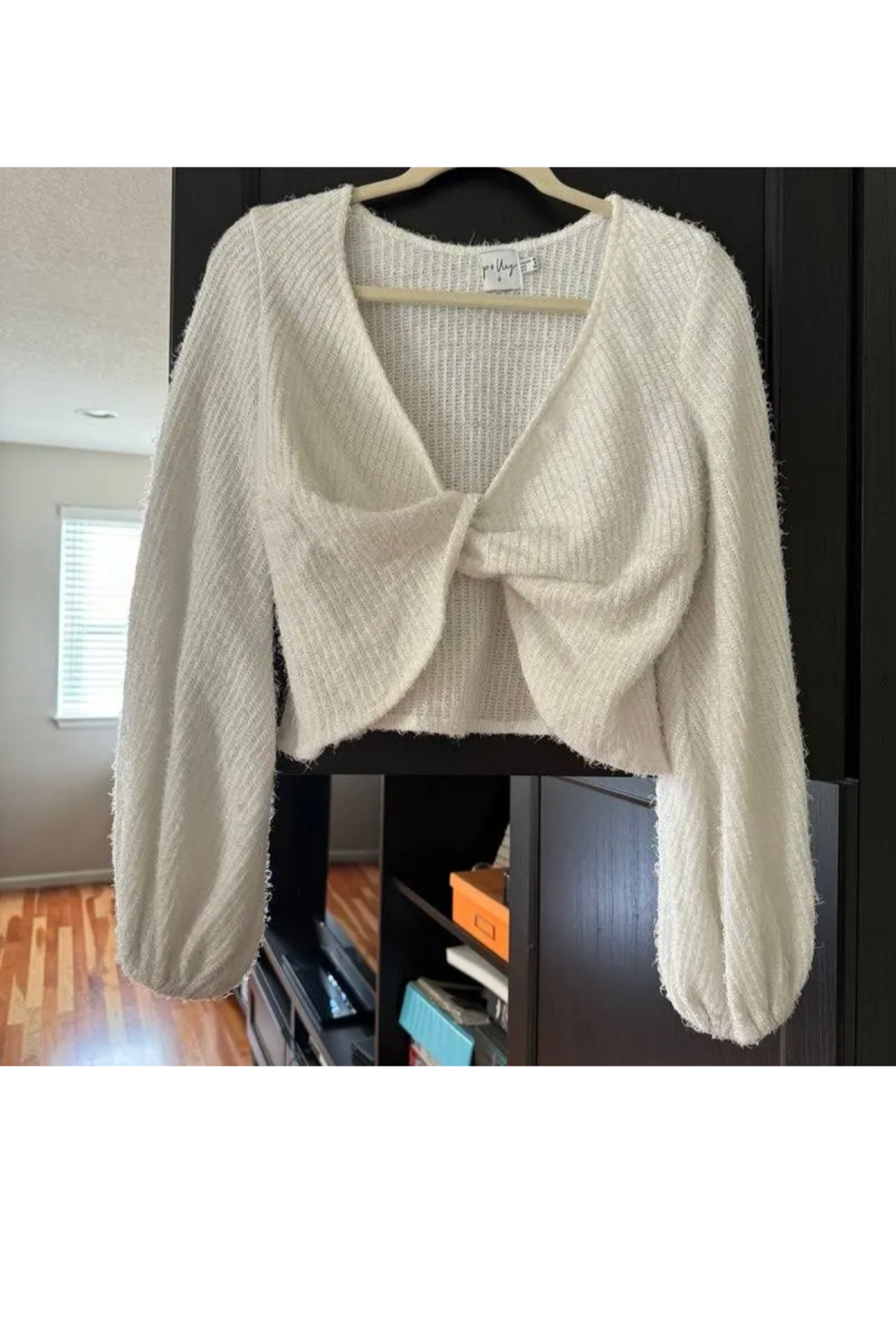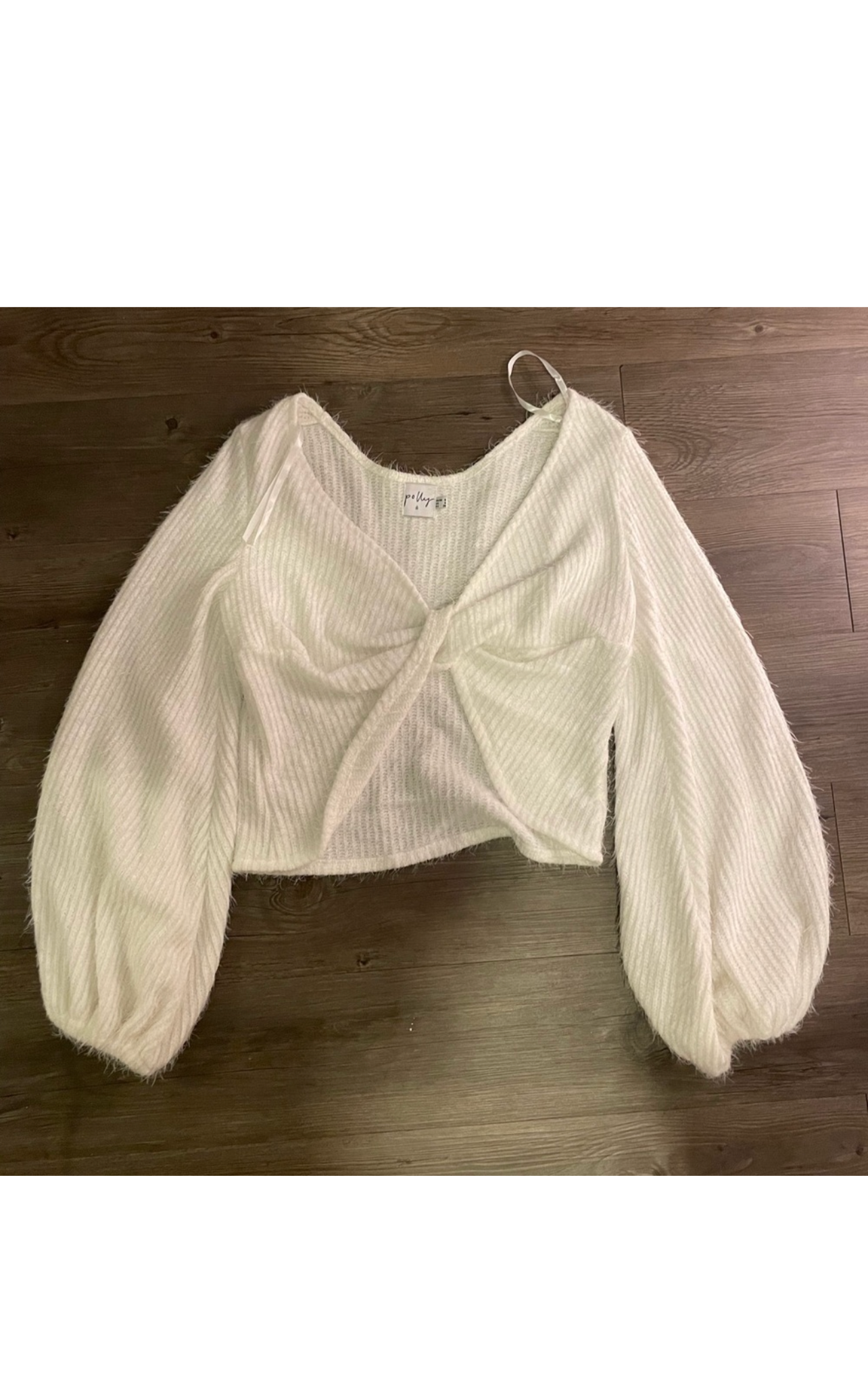 This sweater is a soft fuzzy material with the cutest twist front detail. Balloon/bubble sleeves and a cropped length make it the perfect top for GNO or date night. No flaws!