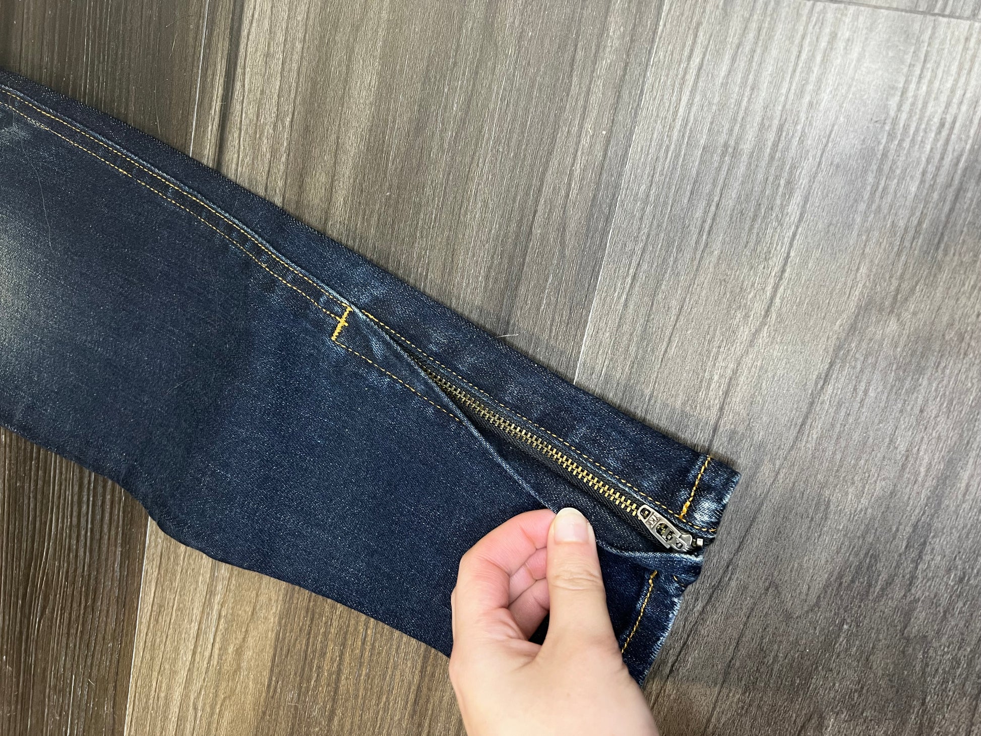 Cropped length. The zipper detail on the bottom adds so much style to these. No flaws!