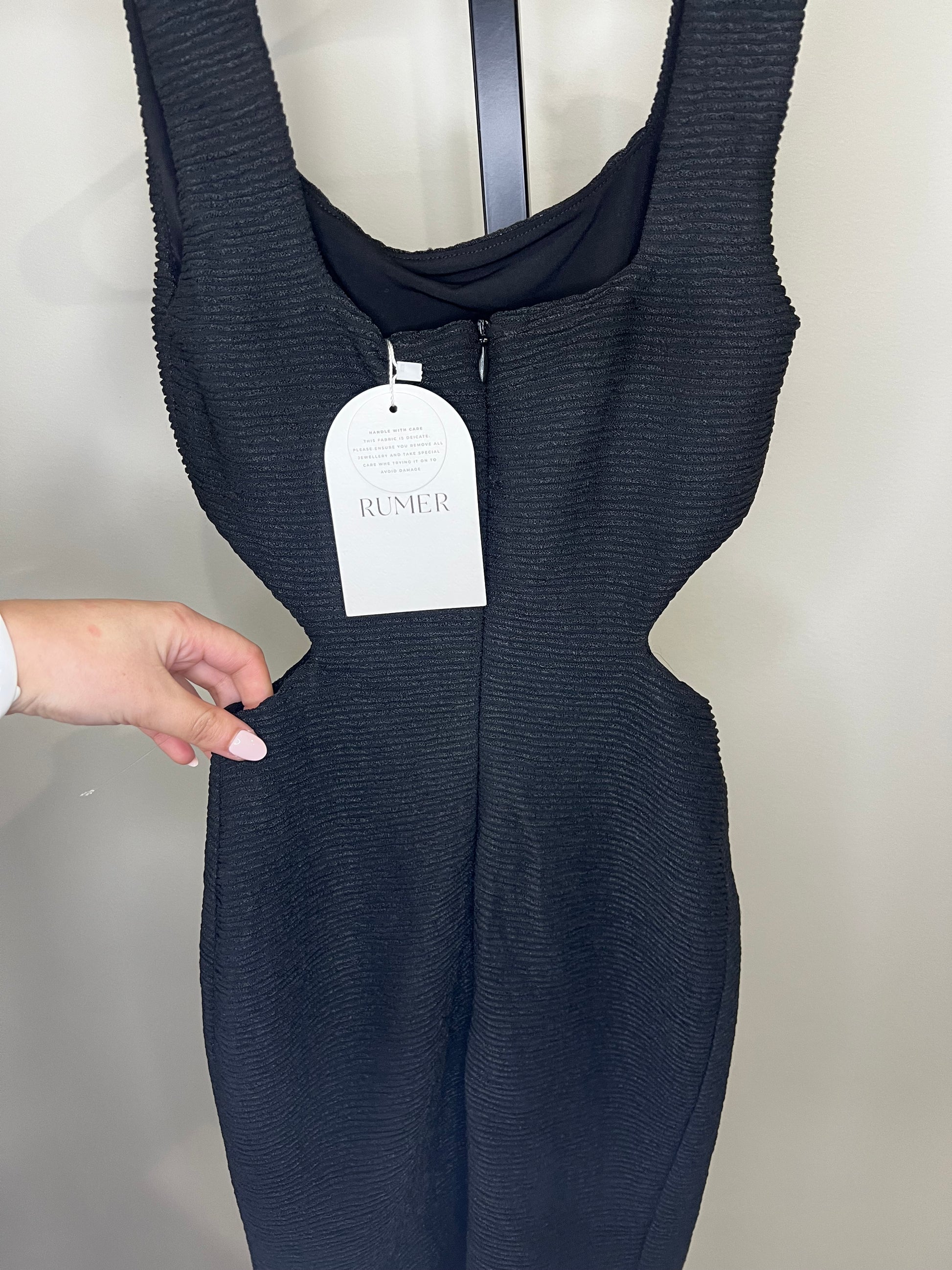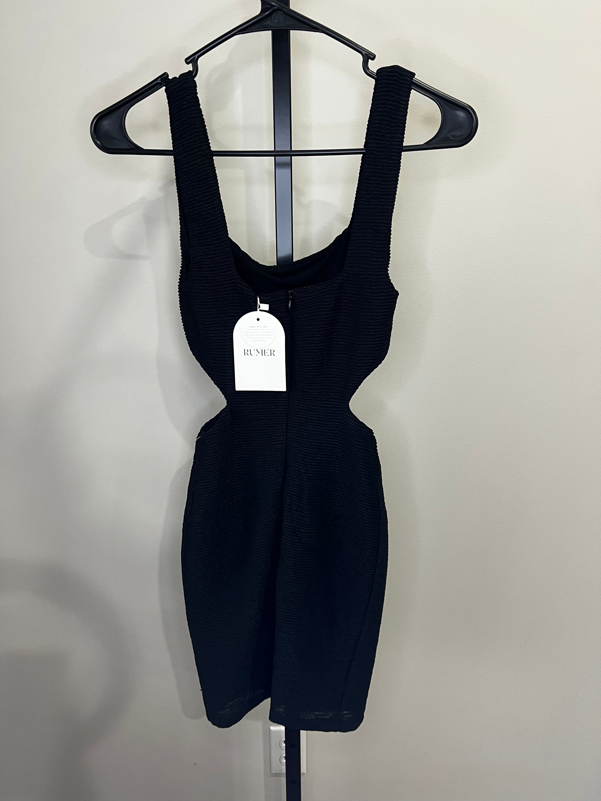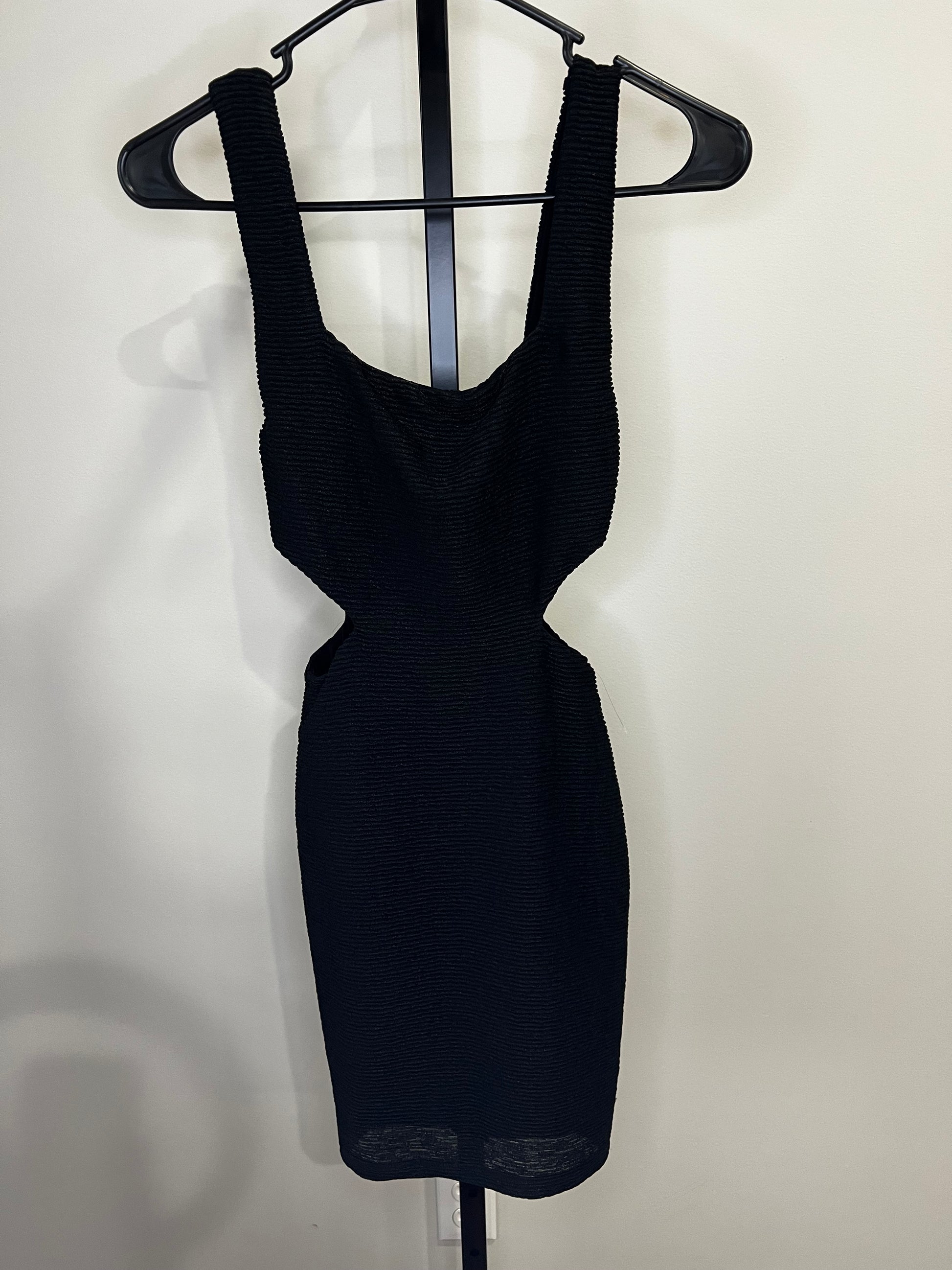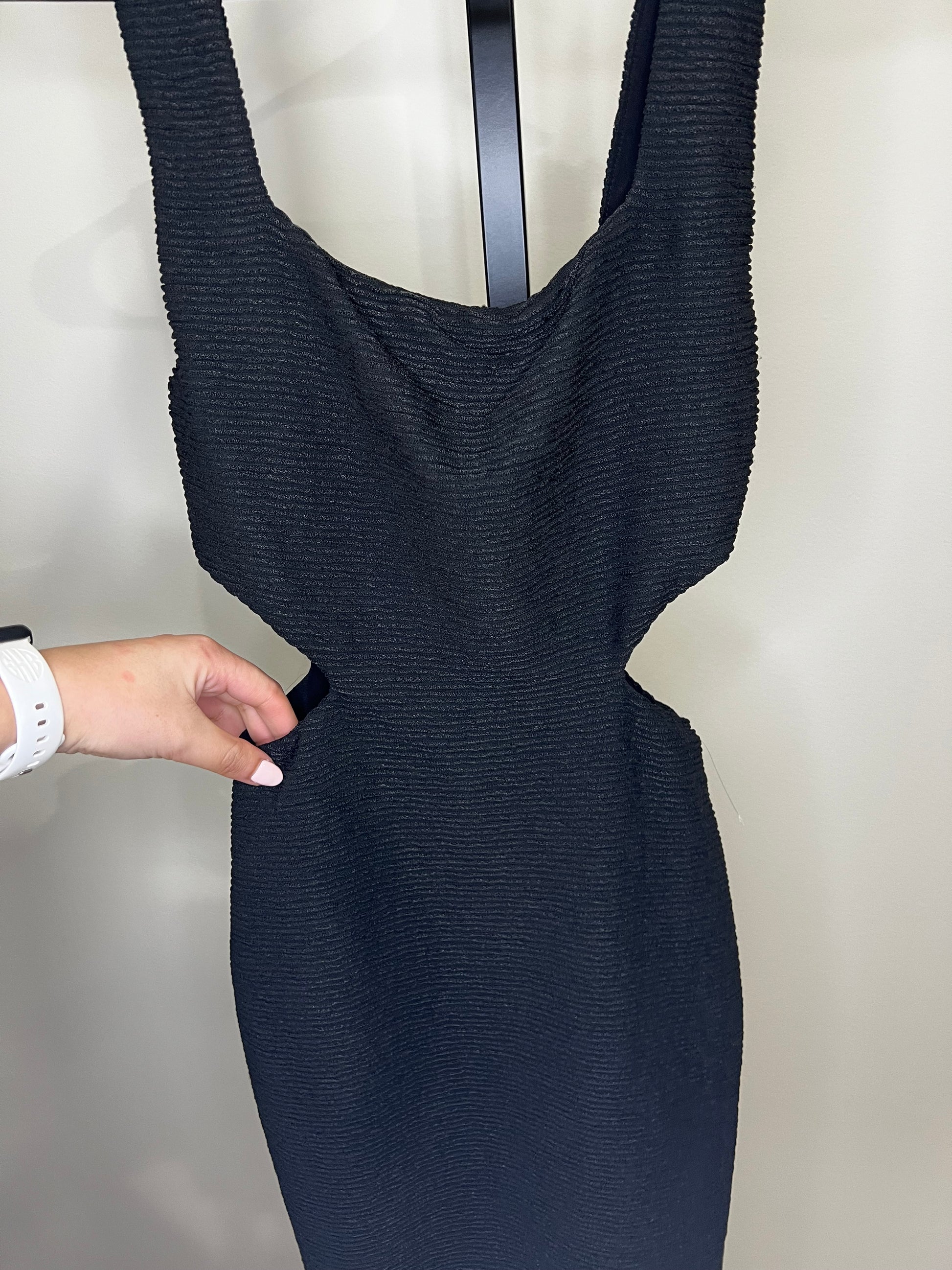 New with tags! Prettiest texture, square neckline, and cutouts on side, make this little black dress so stylish and modern. Perfect for so many occasions. SO flattering on!