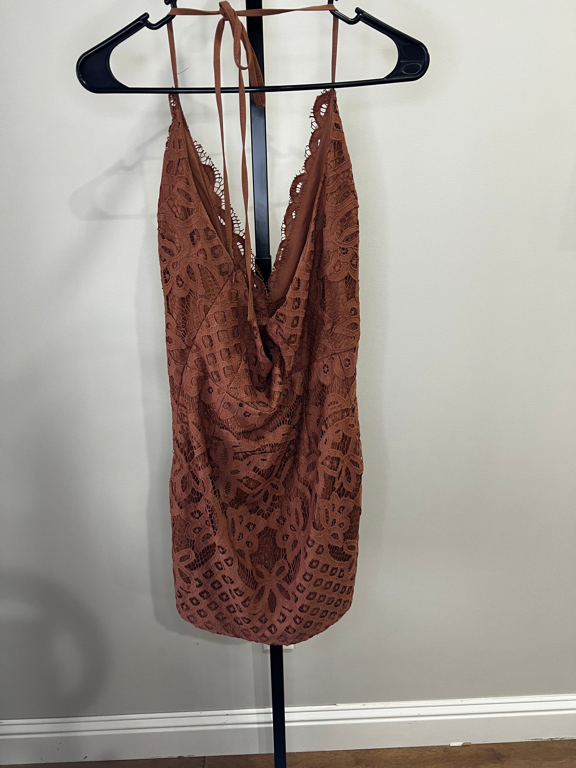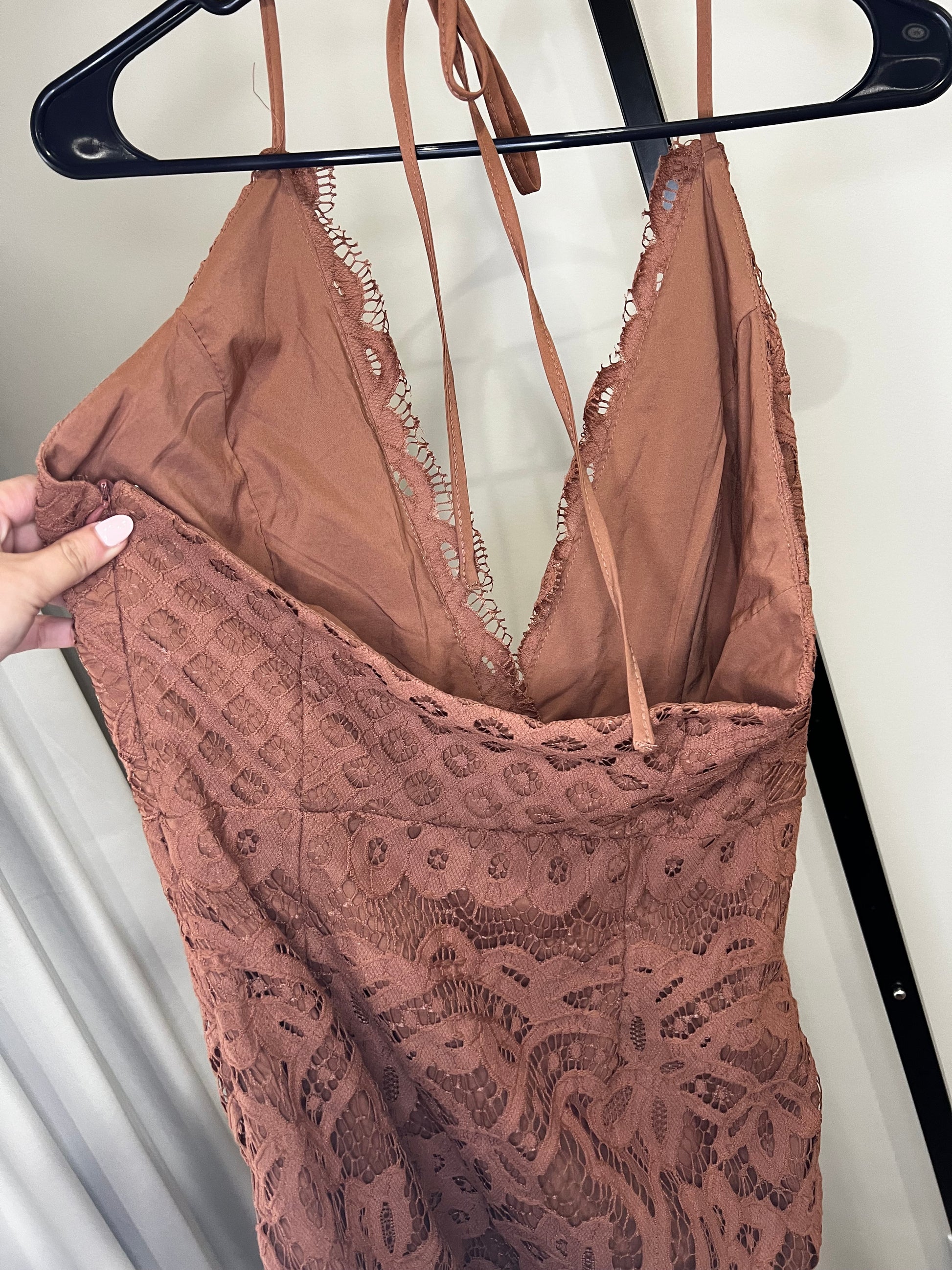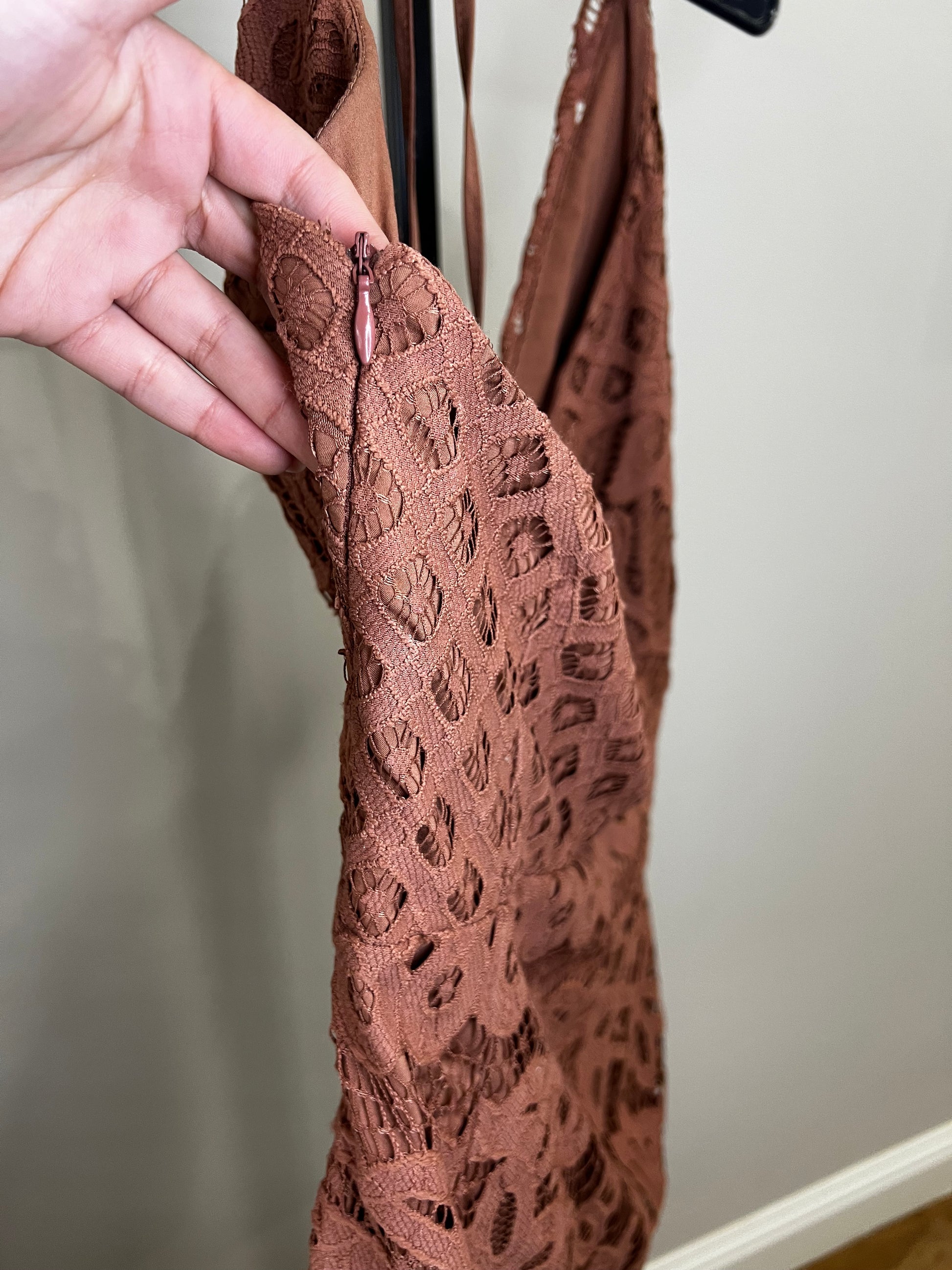 Gorgeous V-neck dress with lace eyelet details throughout. Double lined with a tie halter top. Hidden zipper on side. the prettiest rust color. Perfect for so many occasions.