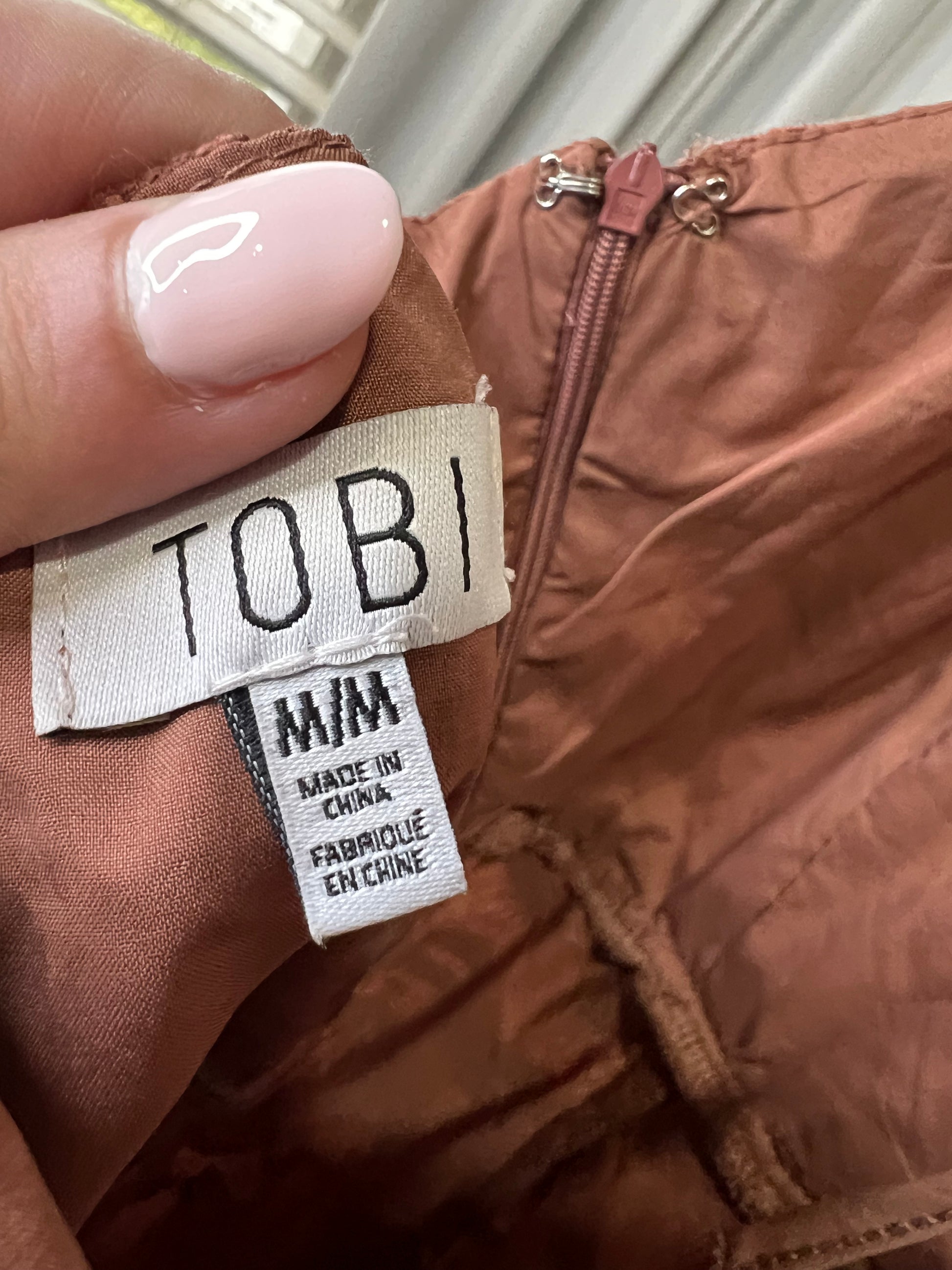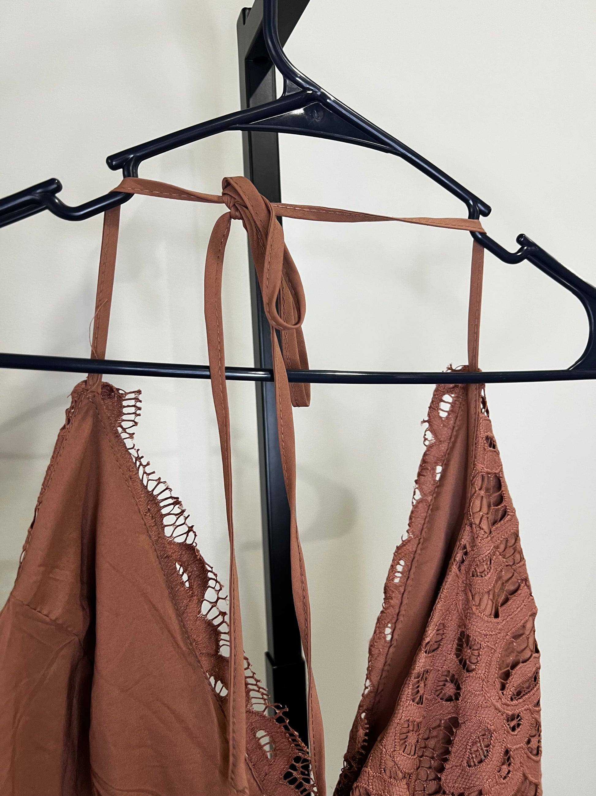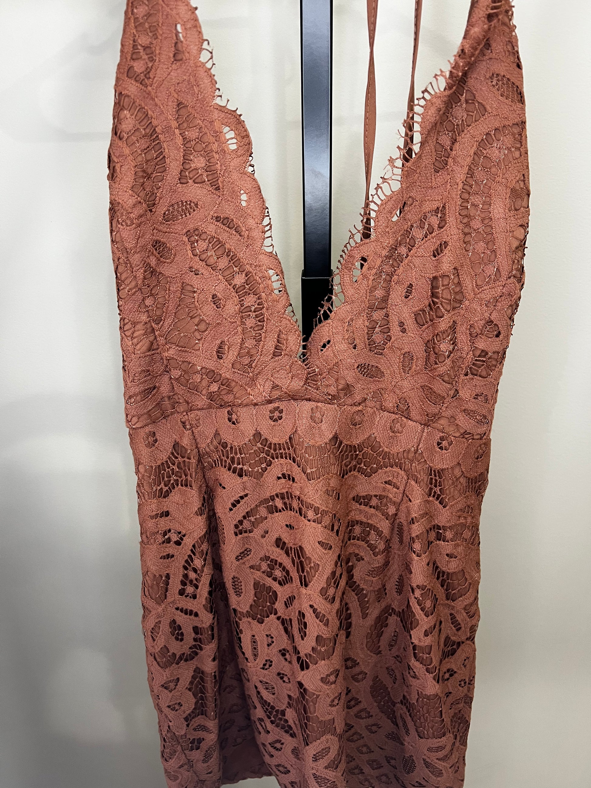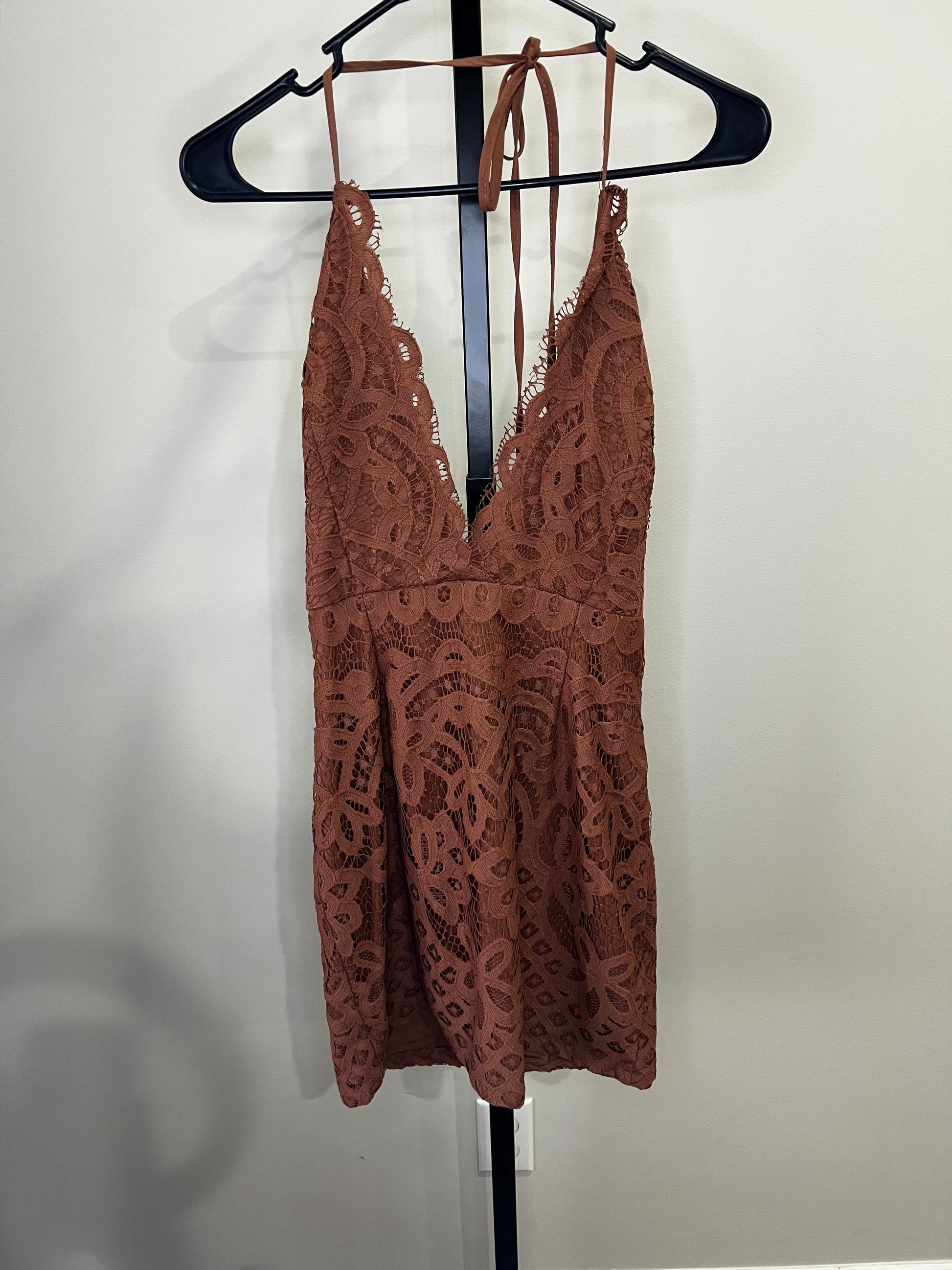 Gorgeous V-neck dress with lace eyelet details throughout. Double lined with a tie halter top. Hidden zipper on side. the prettiest rust color. Perfect for so many occasions.