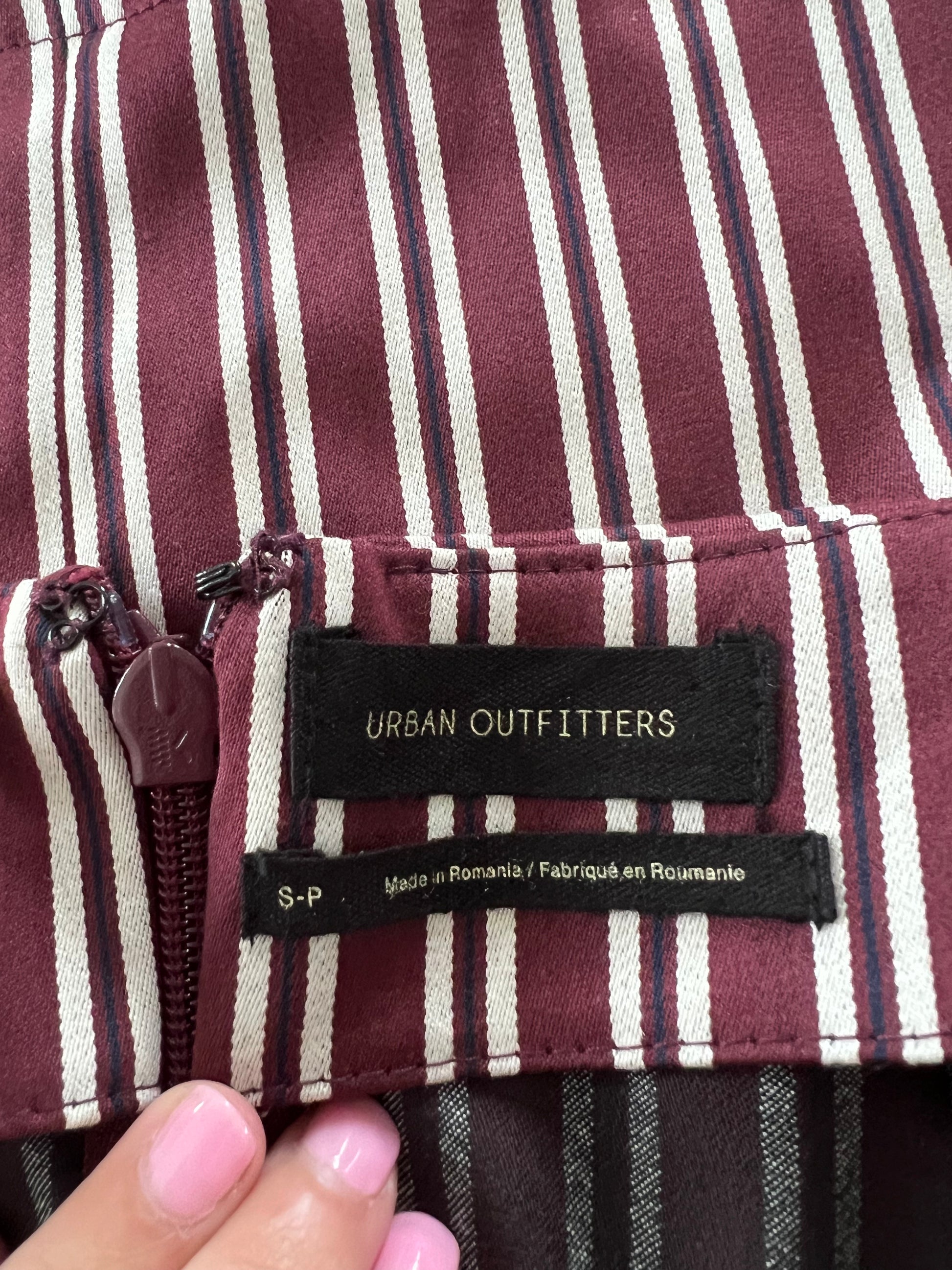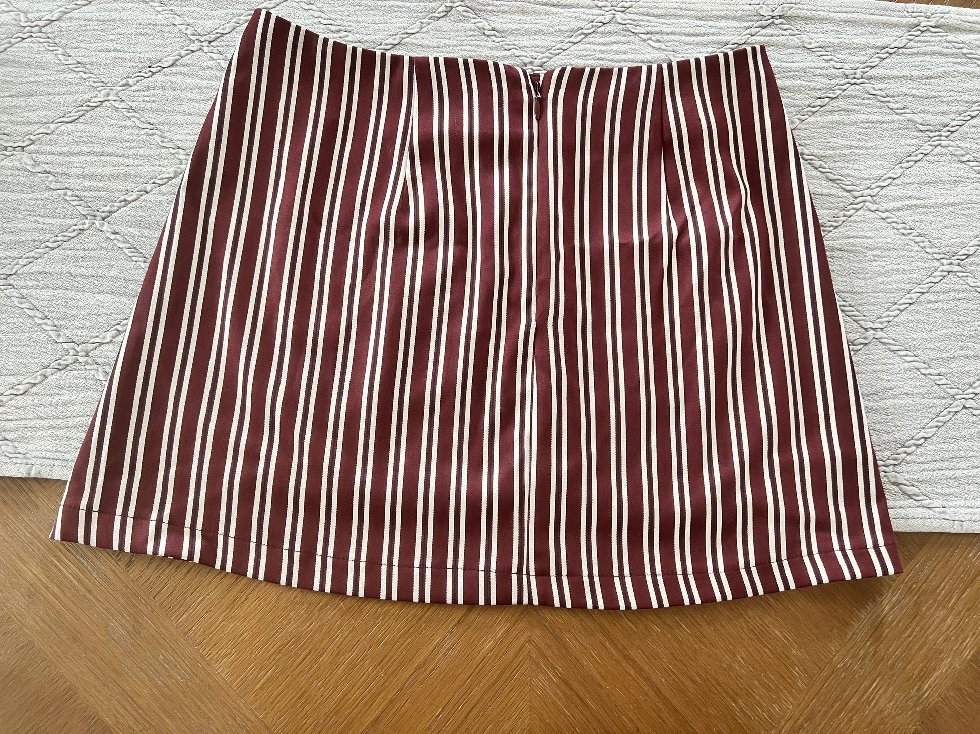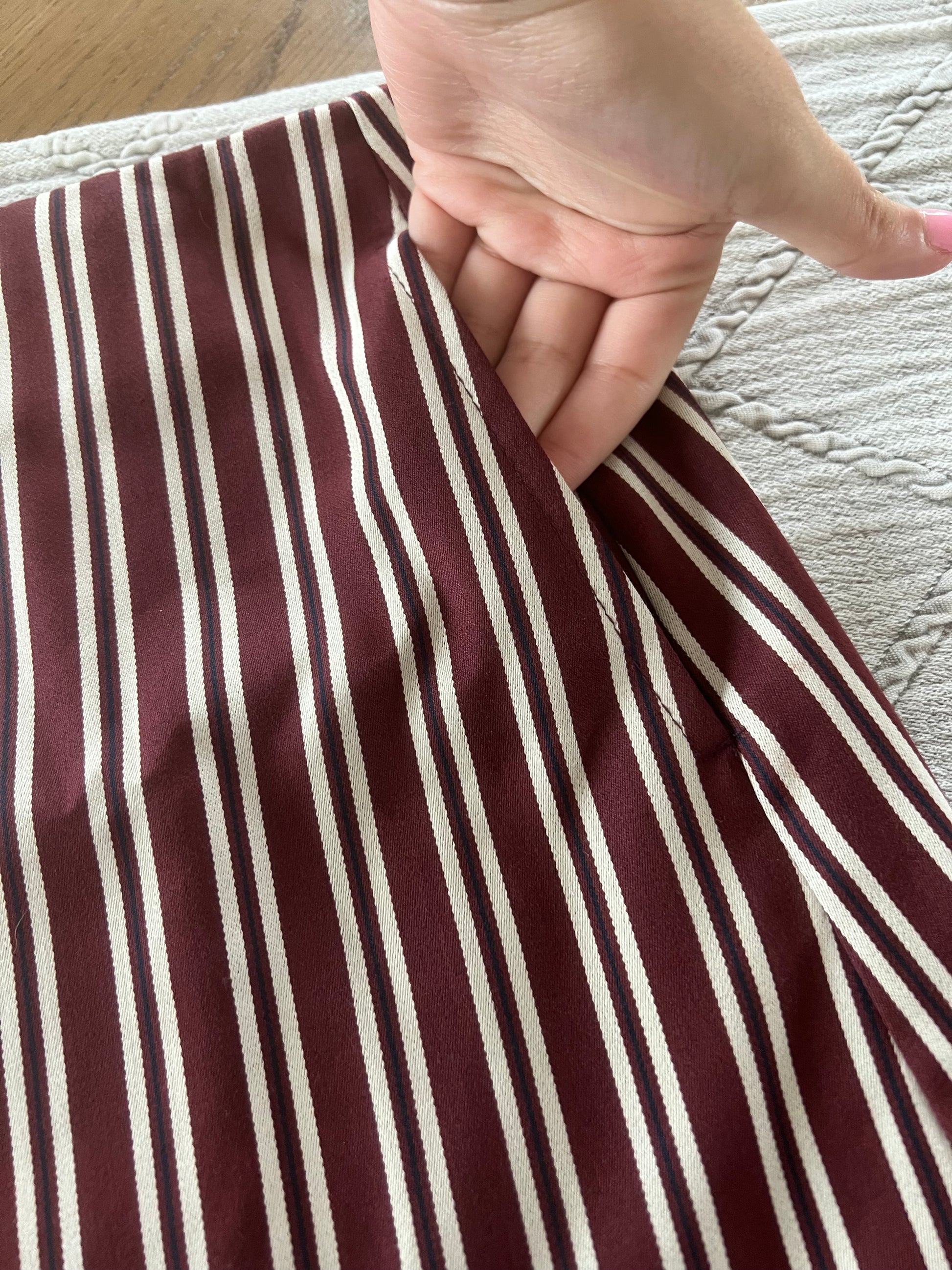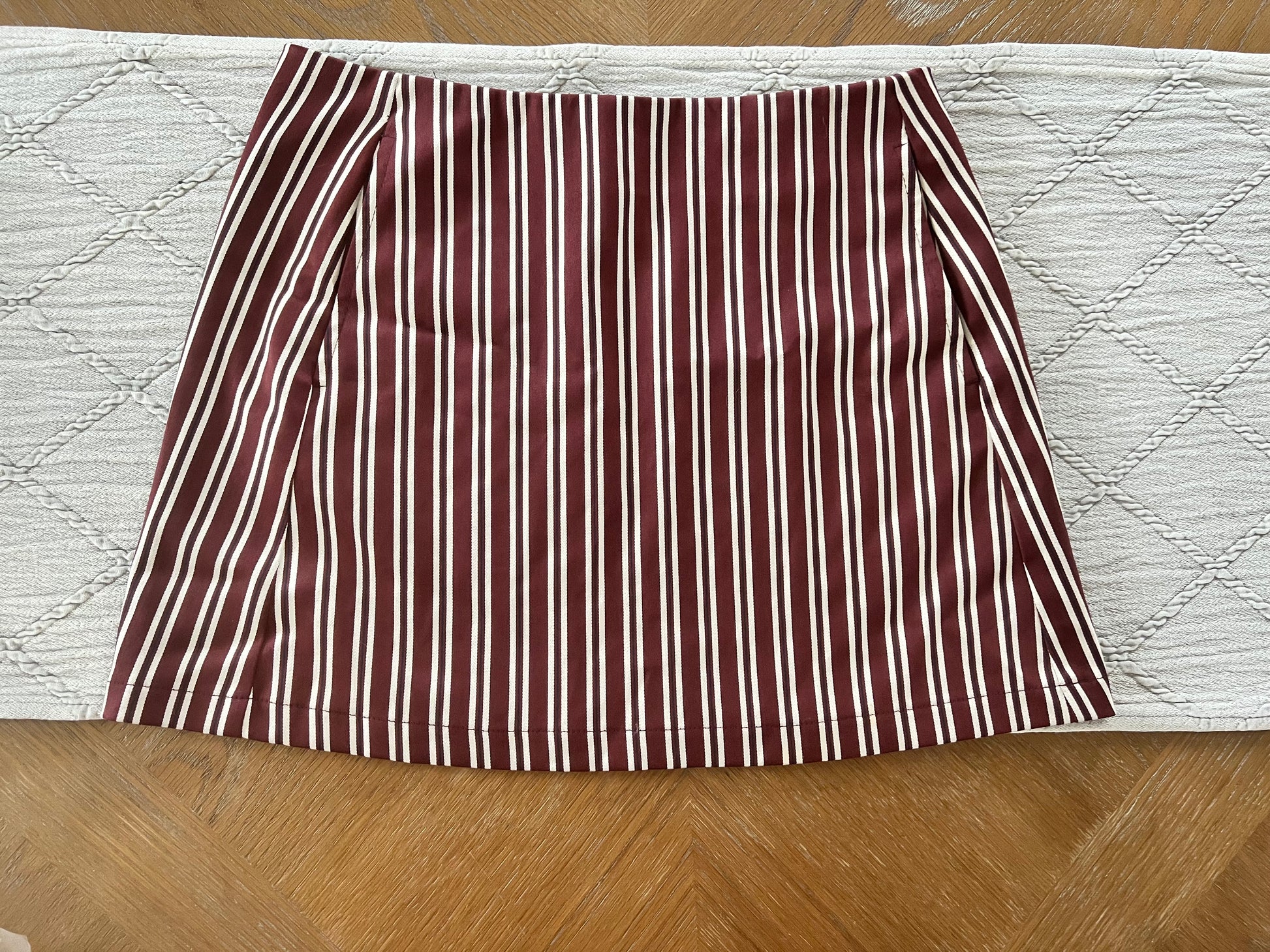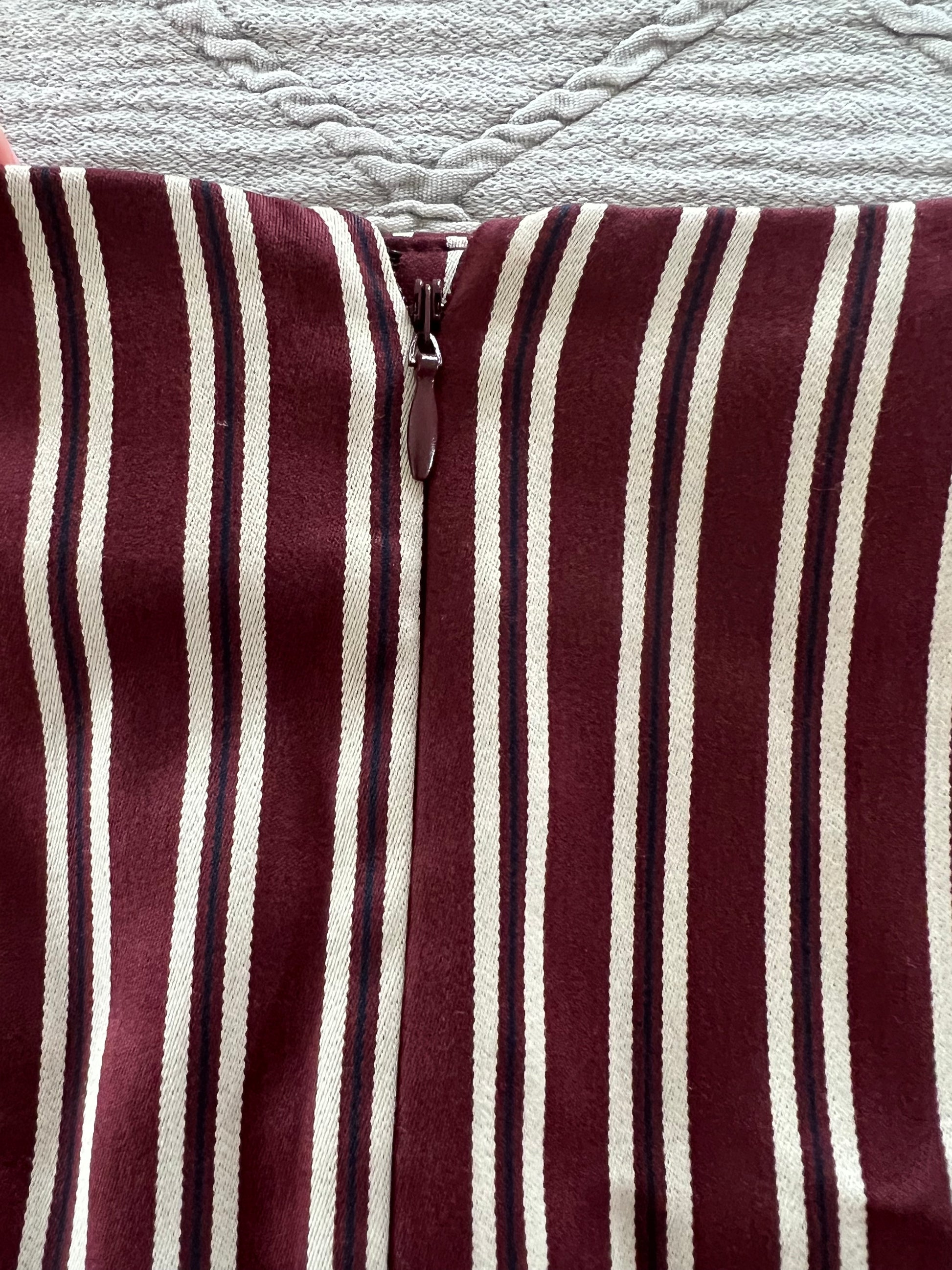 This is in brand new condition! Has pockets on the sides and a hidden zipper in the back. Beautiful red striped design, makes it a timeless piece.