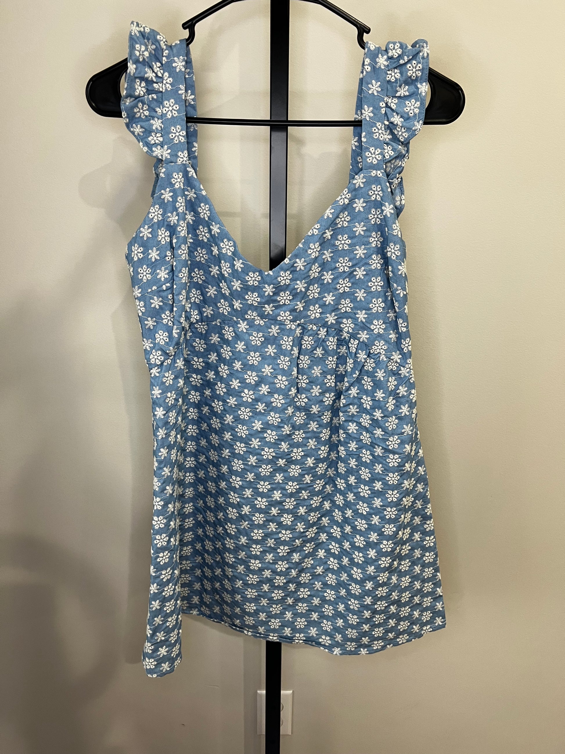 New with tags! No flaws! Love the ruffle sleeve detail and embroidered white flowers. Would be so cute with boots for a concert or sandals/heels for a winery day.