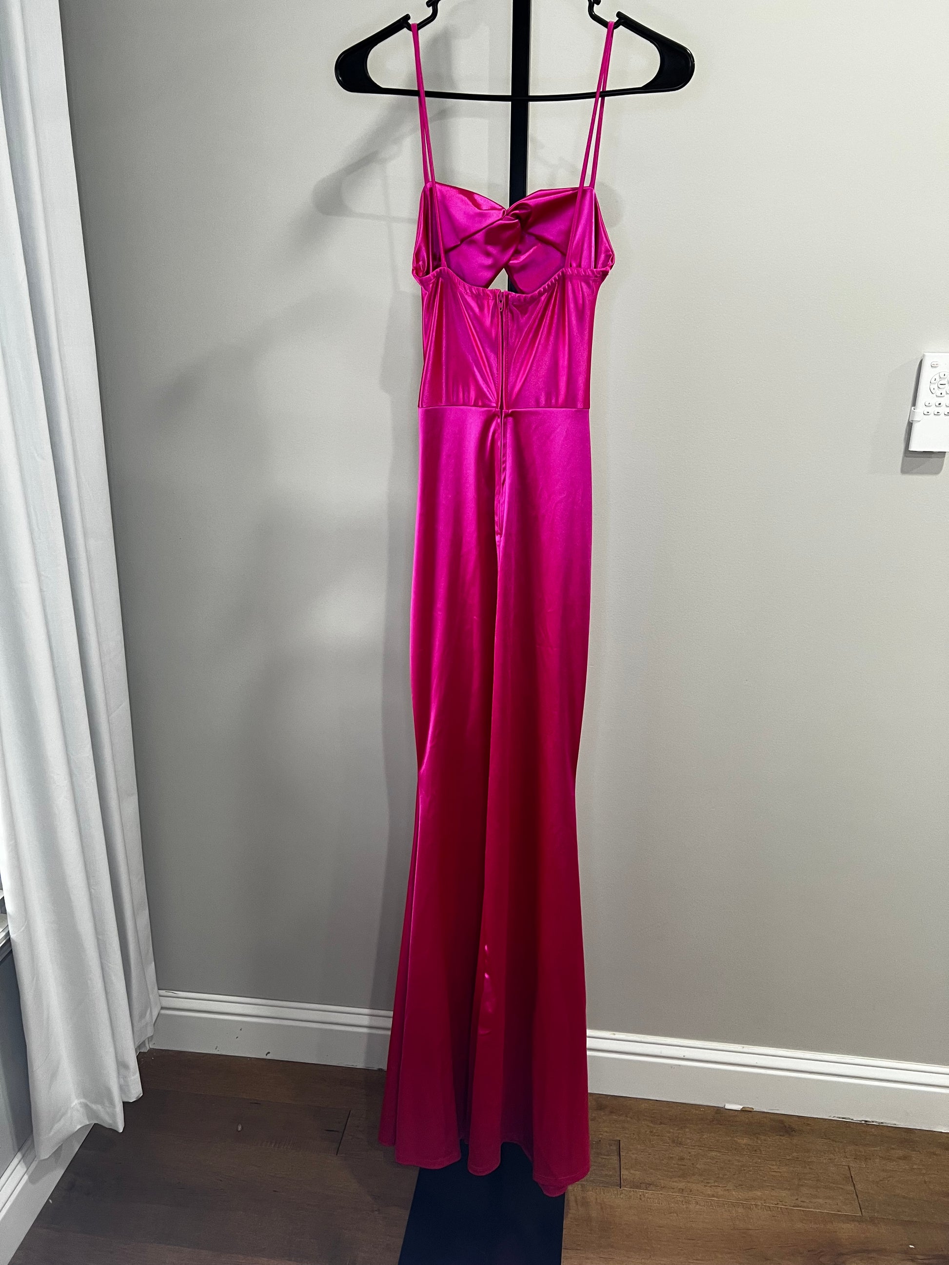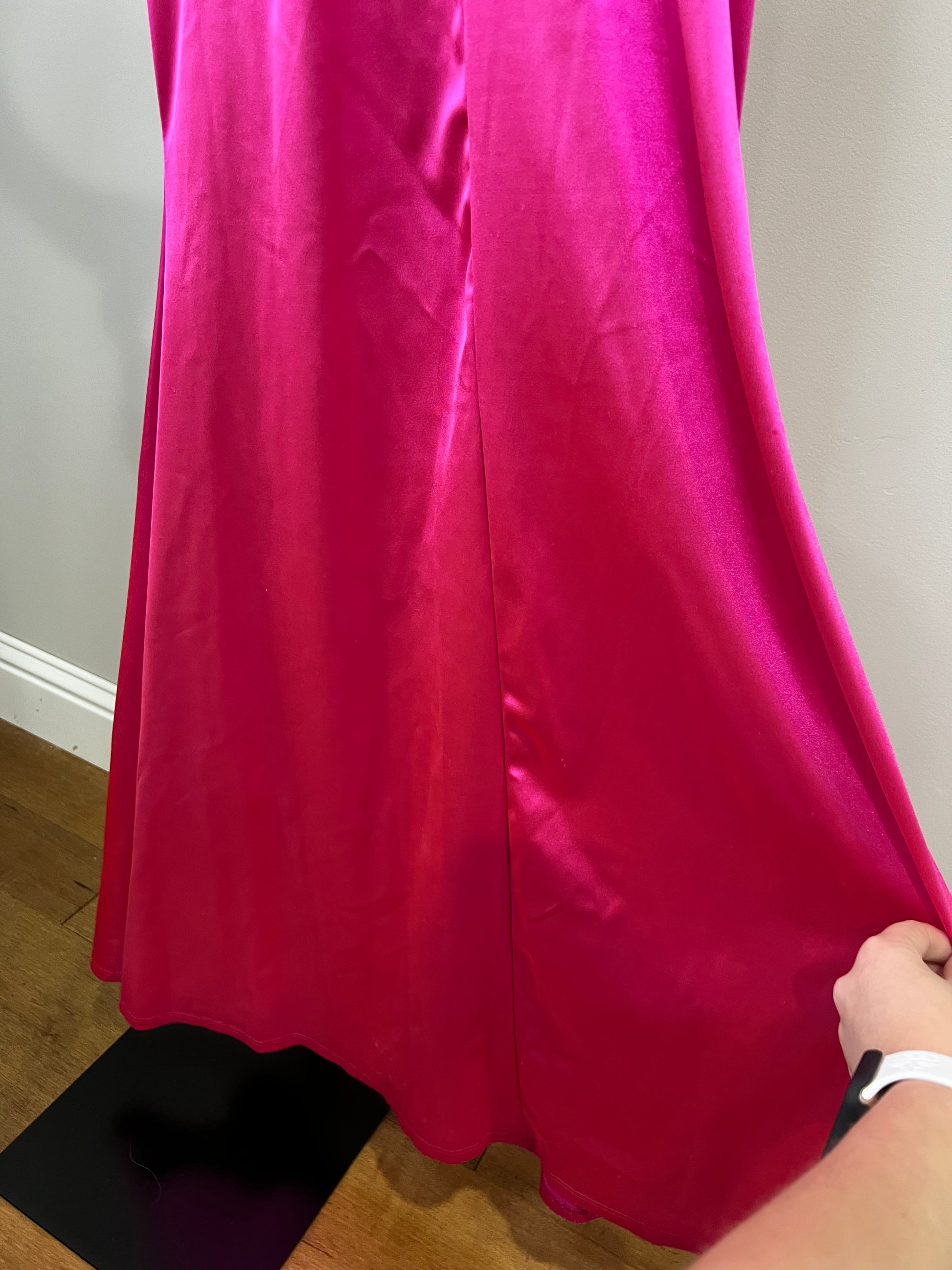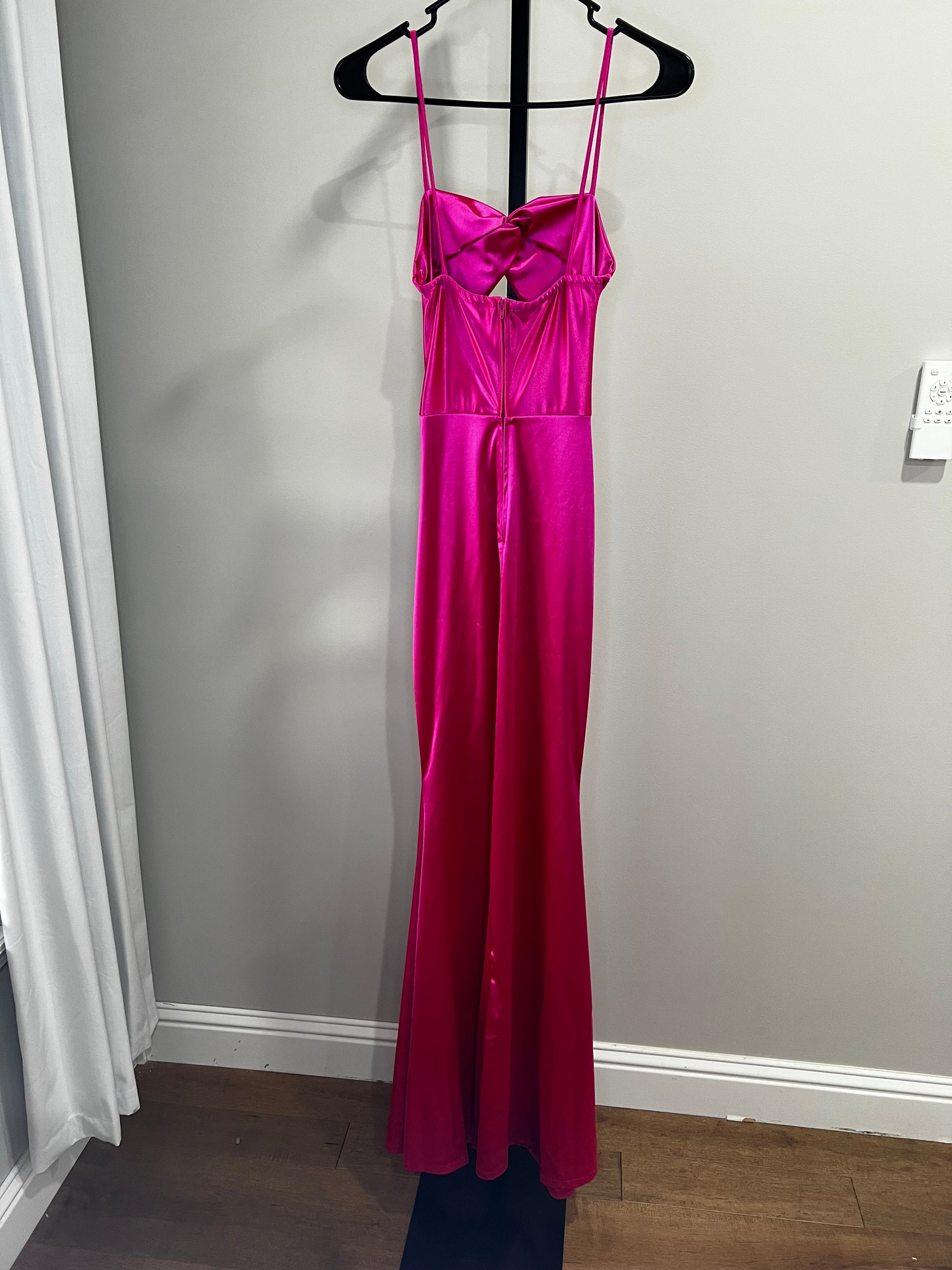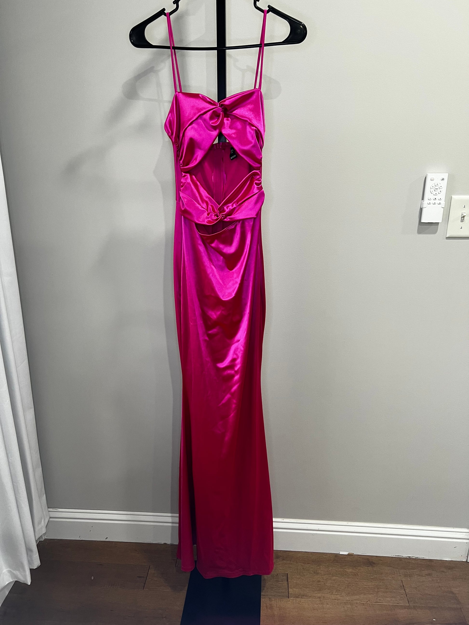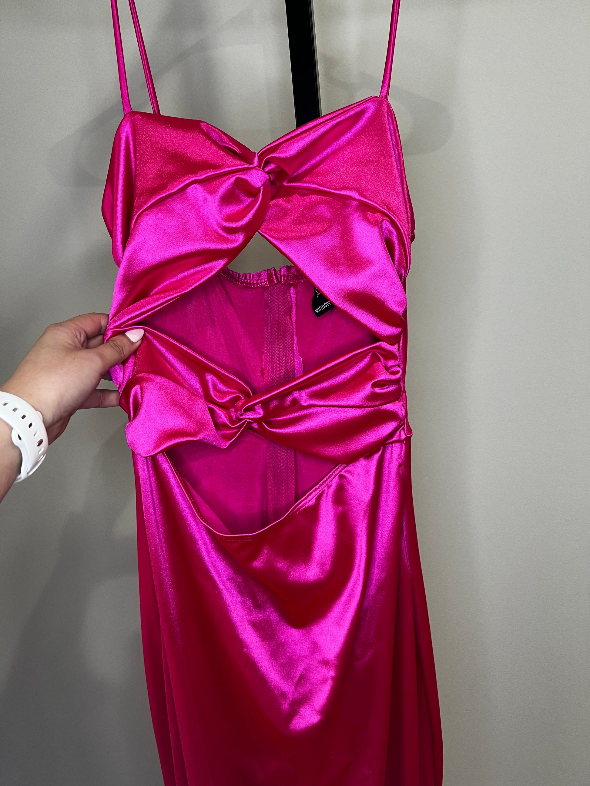 This is the prettiest barbie pink, satin like material with cutouts in the front. This dress is STUNNING on and hugs your body in the most flattering ways. Has a little bit of stretch.
